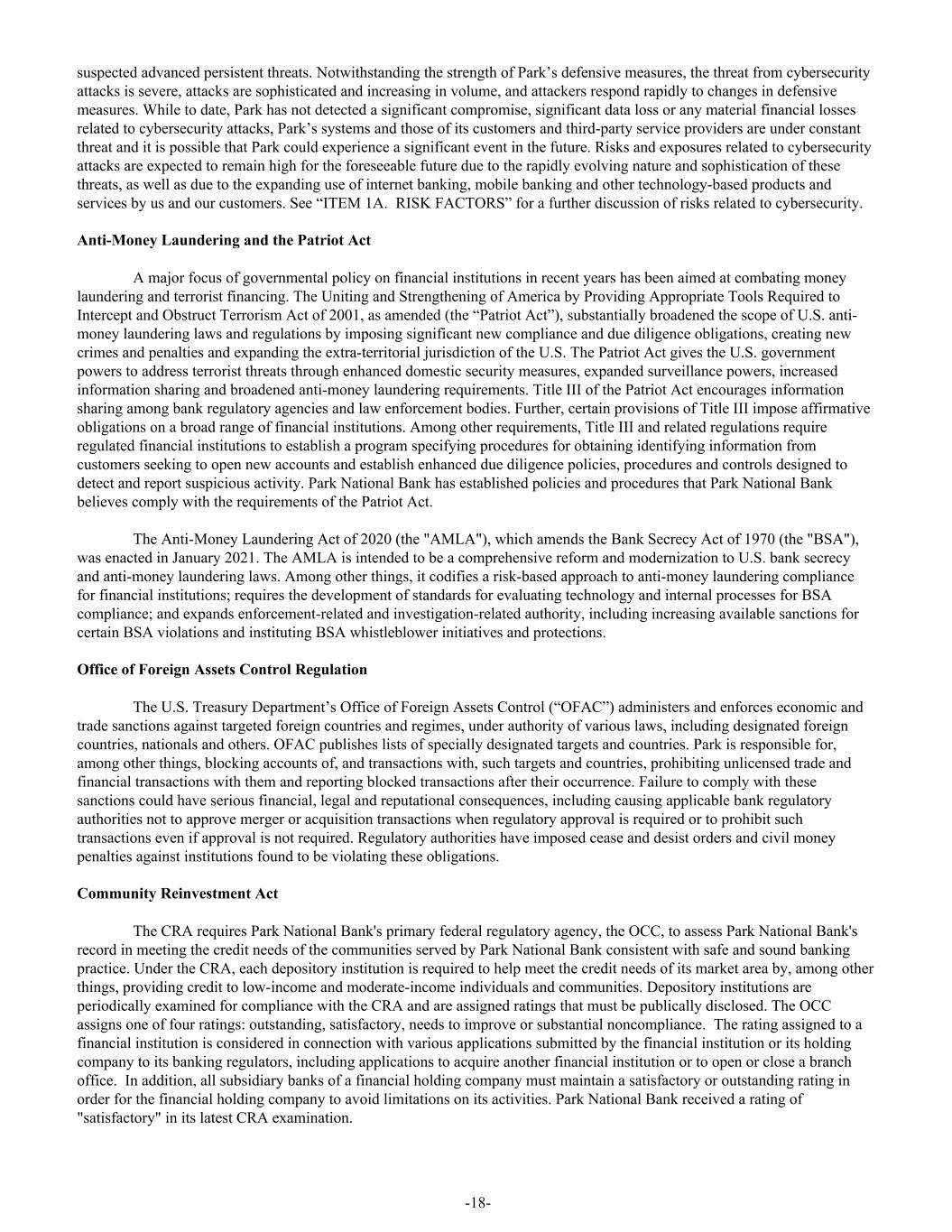 suspected advanced persistent threats. Notwithstanding the strength of Park’s defensive measures, the threat from cybersecurity attacks is severe, attacks are sophisticated and increasing in volume, and attackers respond rapidly to changes in defensive measures. While to date, Park has not detected a significant compromise, significant data loss or any material financial losses related to cybersecurity attacks, Park’s systems and those of its customers and third-party service providers are under constant threat and it is possible that Park could experience a significant event in the future. Risks and exposures related to cybersecurity attacks are expected to remain high for the foreseeable future due to the rapidly evolving nature and sophistication of these threats, as well as due to the expanding use of internet banking, mobile banking and other technology-based products and services by us and our customers. See “ITEM 1A. RISK FACTORS” for a further discussion of risks related to cybersecurity. Anti-Money Laundering and the Patriot Act A major focus of governmental policy on financial institutions in recent years has been aimed at combating money laundering and terrorist financing. The Uniting and Strengthening of America by Providing Appropriate Tools Required to Intercept and Obstruct Terrorism Act of 2001, as amended (the “Patriot Act”), substantially broadened the scope of U.S. anti- money laundering laws and regulations by imposing significant new compliance and due diligence obligations, creating new crimes and penalties and expanding the extra-territorial jurisdiction of the U.S. The Patriot Act gives the U.S. government powers to address terrorist threats through enhanced domestic security measures, expanded surveillance powers, increased information sharing and broadened anti-money laundering requirements. Title III of the Patriot Act encourages information sharing among bank regulatory agencies and law enforcement bodies. Further, certain provisions of Title III impose affirmative obligations on a broad range of financial institutions. Among other requirements, Title III and related regulations require regulated financial institutions to establish a program specifying procedures for obtaining identifying information from customers seeking to open new accounts and establish enhanced due diligence policies, procedures and controls designed to detect and report suspicious activity. Park National Bank has established policies and procedures that Park National Bank believes comply with the requirements of the Patriot Act. The Anti-Money Laundering Act of 2020 (the "AMLA"), which amends the Bank Secrecy Act of 1970 (the "BSA"), was enacted in January 2021. The AMLA is intended to be a comprehensive reform and modernization to U.S. bank secrecy and anti-money laundering laws. Among other things, it codifies a risk-based approach to anti-money laundering compliance for financial institutions; requires the development of standards for evaluating technology and internal processes for BSA compliance; and expands enforcement-related and investigation-related authority, including increasing available sanctions for certain BSA violations and instituting BSA whistleblower initiatives and protections. Office of Foreign Assets Control Regulation The U.S. Treasury Department’s Office of Foreign Assets Control (“OFAC”) administers and enforces economic and trade sanctions against targeted foreign countries and regimes, under authority of various laws, including designated foreign countries, nationals and others. OFAC publishes lists of specially designated targets and countries. Park is responsible for, among other things, blocking accounts of, and transactions with, such targets and countries, prohibiting unlicensed trade and financial transactions with them and reporting blocked transactions after their occurrence. Failure to comply with these sanctions could have serious financial, legal and reputational consequences, including causing applicable bank regulatory authorities not to approve merger or acquisition transactions when regulatory approval is required or to prohibit such transactions even if approval is not required. Regulatory authorities have imposed cease and desist orders and civil money penalties against institutions found to be violating these obligations. Community Reinvestment Act The CRA requires Park National Bank's primary federal regulatory agency, the OCC, to assess Park National Bank's record in meeting the credit needs of the communities served by Park National Bank consistent with safe and sound banking practice. Under the CRA, each depository institution is required to help meet the credit needs of its market area by, among other things, providing credit to low-income and moderate-income individuals and communities. Depository institutions are periodically examined for compliance with the CRA and are assigned ratings that must be publically disclosed. The OCC assigns one of four ratings: outstanding, satisfactory, needs to improve or substantial noncompliance. The rating assigned to a financial institution is considered in connection with various applications submitted by the financial institution or its holding company to its banking regulators, including applications to acquire another financial institution or to open or close a branch office. In addition, all subsidiary banks of a financial holding company must maintain a satisfactory or outstanding rating in order for the financial holding company to avoid limitations on its activities. Park National Bank received a rating of "satisfactory" in its latest CRA examination. -18-