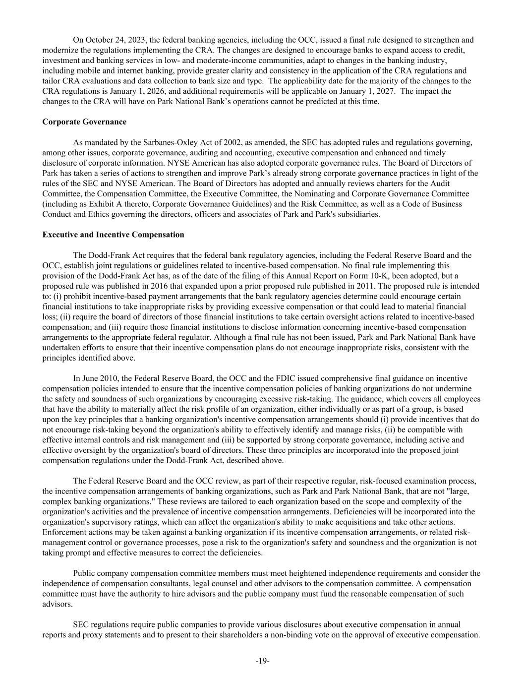 On October 24, 2023, the federal banking agencies, including the OCC, issued a final rule designed to strengthen and modernize the regulations implementing the CRA. The changes are designed to encourage banks to expand access to credit, investment and banking services in low- and moderate-income communities, adapt to changes in the banking industry, including mobile and internet banking, provide greater clarity and consistency in the application of the CRA regulations and tailor CRA evaluations and data collection to bank size and type. The applicability date for the majority of the changes to the CRA regulations is January 1, 2026, and additional requirements will be applicable on January 1, 2027. The impact the changes to the CRA will have on Park National Bank’s operations cannot be predicted at this time. Corporate Governance As mandated by the Sarbanes-Oxley Act of 2002, as amended, the SEC has adopted rules and regulations governing, among other issues, corporate governance, auditing and accounting, executive compensation and enhanced and timely disclosure of corporate information. NYSE American has also adopted corporate governance rules. The Board of Directors of Park has taken a series of actions to strengthen and improve Park’s already strong corporate governance practices in light of the rules of the SEC and NYSE American. The Board of Directors has adopted and annually reviews charters for the Audit Committee, the Compensation Committee, the Executive Committee, the Nominating and Corporate Governance Committee (including as Exhibit A thereto, Corporate Governance Guidelines) and the Risk Committee, as well as a Code of Business Conduct and Ethics governing the directors, officers and associates of Park and Park's subsidiaries. Executive and Incentive Compensation The Dodd-Frank Act requires that the federal bank regulatory agencies, including the Federal Reserve Board and the OCC, establish joint regulations or guidelines related to incentive-based compensation. No final rule implementing this provision of the Dodd-Frank Act has, as of the date of the filing of this Annual Report on Form 10-K, been adopted, but a proposed rule was published in 2016 that expanded upon a prior proposed rule published in 2011. The proposed rule is intended to: (i) prohibit incentive-based payment arrangements that the bank regulatory agencies determine could encourage certain financial institutions to take inappropriate risks by providing excessive compensation or that could lead to material financial loss; (ii) require the board of directors of those financial institutions to take certain oversight actions related to incentive-based compensation; and (iii) require those financial institutions to disclose information concerning incentive-based compensation arrangements to the appropriate federal regulator. Although a final rule has not been issued, Park and Park National Bank have undertaken efforts to ensure that their incentive compensation plans do not encourage inappropriate risks, consistent with the principles identified above. In June 2010, the Federal Reserve Board, the OCC and the FDIC issued comprehensive final guidance on incentive compensation policies intended to ensure that the incentive compensation policies of banking organizations do not undermine the safety and soundness of such organizations by encouraging excessive risk-taking. The guidance, which covers all employees that have the ability to materially affect the risk profile of an organization, either individually or as part of a group, is based upon the key principles that a banking organization's incentive compensation arrangements should (i) provide incentives that do not encourage risk-taking beyond the organization's ability to effectively identify and manage risks, (ii) be compatible with effective internal controls and risk management and (iii) be supported by strong corporate governance, including active and effective oversight by the organization's board of directors. These three principles are incorporated into the proposed joint compensation regulations under the Dodd-Frank Act, described above. The Federal Reserve Board and the OCC review, as part of their respective regular, risk-focused examination process, the incentive compensation arrangements of banking organizations, such as Park and Park National Bank, that are not "large, complex banking organizations." These reviews are tailored to each organization based on the scope and complexity of the organization's activities and the prevalence of incentive compensation arrangements. Deficiencies will be incorporated into the organization's supervisory ratings, which can affect the organization's ability to make acquisitions and take other actions. Enforcement actions may be taken against a banking organization if its incentive compensation arrangements, or related risk- management control or governance processes, pose a risk to the organization's safety and soundness and the organization is not taking prompt and effective measures to correct the deficiencies. Public company compensation committee members must meet heightened independence requirements and consider the independence of compensation consultants, legal counsel and other advisors to the compensation committee. A compensation committee must have the authority to hire advisors and the public company must fund the reasonable compensation of such advisors. SEC regulations require public companies to provide various disclosures about executive compensation in annual reports and proxy statements and to present to their shareholders a non-binding vote on the approval of executive compensation. -19-