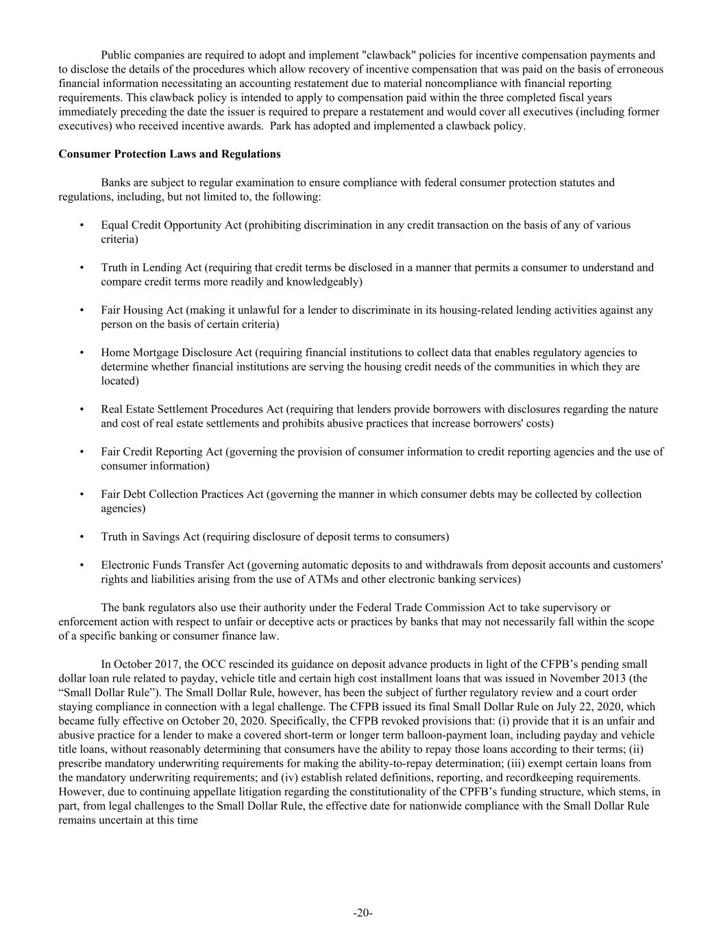 Public companies are required to adopt and implement "clawback" policies for incentive compensation payments and to disclose the details of the procedures which allow recovery of incentive compensation that was paid on the basis of erroneous financial information necessitating an accounting restatement due to material noncompliance with financial reporting requirements. This clawback policy is intended to apply to compensation paid within the three completed fiscal years immediately preceding the date the issuer is required to prepare a restatement and would cover all executives (including former executives) who received incentive awards. Park has adopted and implemented a clawback policy. Consumer Protection Laws and Regulations Banks are subject to regular examination to ensure compliance with federal consumer protection statutes and regulations, including, but not limited to, the following: • Equal Credit Opportunity Act (prohibiting discrimination in any credit transaction on the basis of any of various criteria) • Truth in Lending Act (requiring that credit terms be disclosed in a manner that permits a consumer to understand and compare credit terms more readily and knowledgeably) • Fair Housing Act (making it unlawful for a lender to discriminate in its housing-related lending activities against any person on the basis of certain criteria) • Home Mortgage Disclosure Act (requiring financial institutions to collect data that enables regulatory agencies to determine whether financial institutions are serving the housing credit needs of the communities in which they are located) • Real Estate Settlement Procedures Act (requiring that lenders provide borrowers with disclosures regarding the nature and cost of real estate settlements and prohibits abusive practices that increase borrowers' costs) • Fair Credit Reporting Act (governing the provision of consumer information to credit reporting agencies and the use of consumer information) • Fair Debt Collection Practices Act (governing the manner in which consumer debts may be collected by collection agencies) • Truth in Savings Act (requiring disclosure of deposit terms to consumers) • Electronic Funds Transfer Act (governing automatic deposits to and withdrawals from deposit accounts and customers' rights and liabilities arising from the use of ATMs and other electronic banking services) The bank regulators also use their authority under the Federal Trade Commission Act to take supervisory or enforcement action with respect to unfair or deceptive acts or practices by banks that may not necessarily fall within the scope of a specific banking or consumer finance law. In October 2017, the OCC rescinded its guidance on deposit advance products in light of the CFPB’s pending small dollar loan rule related to payday, vehicle title and certain high cost installment loans that was issued in November 2013 (the “Small Dollar Rule”). The Small Dollar Rule, however, has been the subject of further regulatory review and a court order staying compliance in connection with a legal challenge. The CFPB issued its final Small Dollar Rule on July 22, 2020, which became fully effective on October 20, 2020. Specifically, the CFPB revoked provisions that: (i) provide that it is an unfair and abusive practice for a lender to make a covered short-term or longer term balloon-payment loan, including payday and vehicle title loans, without reasonably determining that consumers have the ability to repay those loans according to their terms; (ii) prescribe mandatory underwriting requirements for making the ability-to-repay determination; (iii) exempt certain loans from the mandatory underwriting requirements; and (iv) establish related definitions, reporting, and recordkeeping requirements. However, due to continuing appellate litigation regarding the constitutionality of the CPFB’s funding structure, which stems, in part, from legal challenges to the Small Dollar Rule, the effective date for nationwide compliance with the Small Dollar Rule remains uncertain at this time -20-