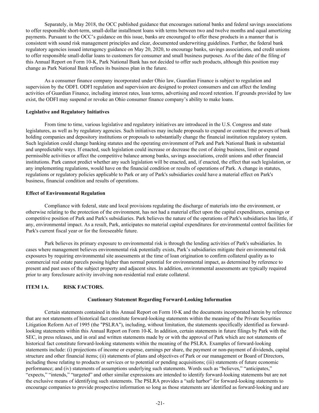 Separately, in May 2018, the OCC published guidance that encourages national banks and federal savings associations to offer responsible short-term, small-dollar installment loans with terms between two and twelve months and equal amortizing payments. Pursuant to the OCC’s guidance on this issue, banks are encouraged to offer these products in a manner that is consistent with sound risk management principles and clear, documented underwriting guidelines. Further, the federal bank regulatory agencies issued interagency guidance on May 20, 2020, to encourage banks, savings associations, and credit unions to offer responsible small-dollar loans to customers for consumer and small business purposes. As of the date of the filing of this Annual Report on Form 10-K, Park National Bank has not decided to offer such products, although this position may change as Park National Bank refines its business plan in the future. As a consumer finance company incorporated under Ohio law, Guardian Finance is subject to regulation and supervision by the ODFI. ODFI regulation and supervision are designed to protect consumers and can affect the lending activities of Guardian Finance, including interest rates, loan terms, advertising and record retention. If grounds provided by law exist, the ODFI may suspend or revoke an Ohio consumer finance company’s ability to make loans. Legislative and Regulatory Initiatives From time to time, various legislative and regulatory initiatives are introduced in the U.S. Congress and state legislatures, as well as by regulatory agencies. Such initiatives may include proposals to expand or contract the powers of bank holding companies and depository institutions or proposals to substantially change the financial institution regulatory system. Such legislation could change banking statutes and the operating environment of Park and Park National Bank in substantial and unpredictable ways. If enacted, such legislation could increase or decrease the cost of doing business, limit or expand permissible activities or affect the competitive balance among banks, savings associations, credit unions and other financial institutions. Park cannot predict whether any such legislation will be enacted, and, if enacted, the effect that such legislation, or any implementing regulations, would have on the financial condition or results of operations of Park. A change in statutes, regulations or regulatory policies applicable to Park or any of Park's subsidiaries could have a material effect on Park's business, financial condition and results of operations. Effect of Environmental Regulation Compliance with federal, state and local provisions regulating the discharge of materials into the environment, or otherwise relating to the protection of the environment, has not had a material effect upon the capital expenditures, earnings or competitive position of Park and Park's subsidiaries. Park believes the nature of the operations of Park's subsidiaries has little, if any, environmental impact. As a result, Park, anticipates no material capital expenditures for environmental control facilities for Park's current fiscal year or for the foreseeable future. Park believes its primary exposure to environmental risk is through the lending activities of Park's subsidiaries. In cases where management believes environmental risk potentially exists, Park’s subsidiaries mitigate their environmental risk exposures by requiring environmental site assessments at the time of loan origination to confirm collateral quality as to commercial real estate parcels posing higher than normal potential for environmental impact, as determined by reference to present and past uses of the subject property and adjacent sites. In addition, environmental assessments are typically required prior to any foreclosure activity involving non-residential real estate collateral. ITEM 1A. RISK FACTORS. Cautionary Statement Regarding Forward-Looking Information Certain statements contained in this Annual Report on Form 10-K and the documents incorporated herein by reference that are not statements of historical fact constitute forward-looking statements within the meaning of the Private Securities Litigation Reform Act of 1995 (the "PSLRA"), including, without limitation, the statements specifically identified as forward- looking statements within this Annual Report on Form 10-K. In addition, certain statements in future filings by Park with the SEC, in press releases, and in oral and written statements made by or with the approval of Park which are not statements of historical fact constitute forward-looking statements within the meaning of the PSLRA. Examples of forward-looking statements include: (i) projections of income or expense, earnings per share, the payment or non-payment of dividends, capital structure and other financial items; (ii) statements of plans and objectives of Park or our management or Board of Directors, including those relating to products or services or to potential or pending acquisitions; (iii) statements of future economic performance; and (iv) statements of assumptions underlying such statements. Words such as “believes,” “anticipates,” “expects,” “intends,” “targeted” and other similar expressions are intended to identify forward-looking statements but are not the exclusive means of identifying such statements. The PSLRA provides a “safe harbor” for forward-looking statements to encourage companies to provide prospective information so long as those statements are identified as forward-looking and are -21-