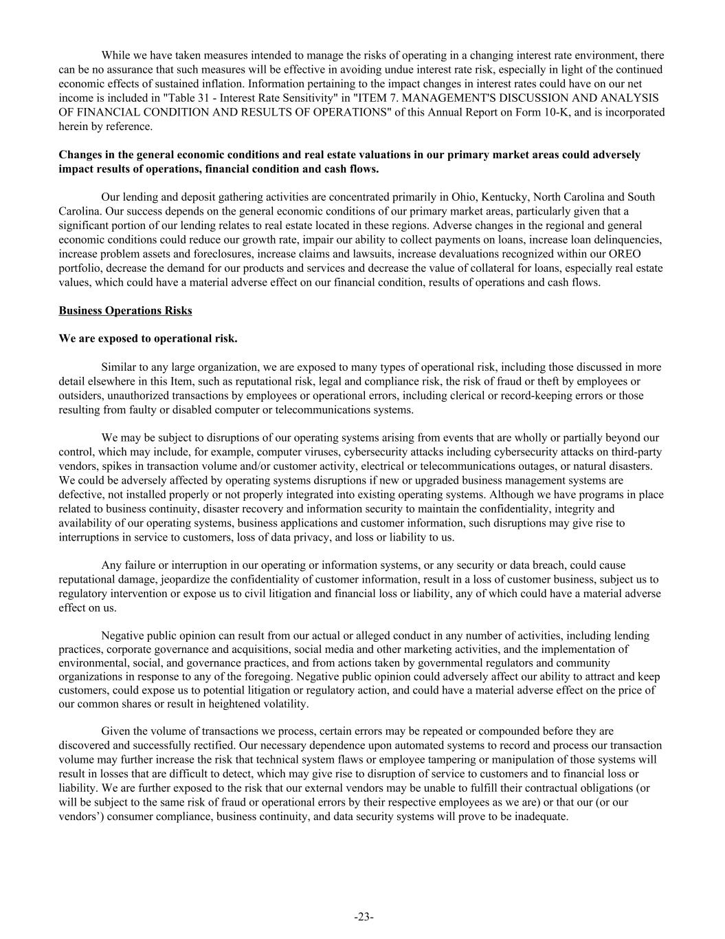 While we have taken measures intended to manage the risks of operating in a changing interest rate environment, there can be no assurance that such measures will be effective in avoiding undue interest rate risk, especially in light of the continued economic effects of sustained inflation. Information pertaining to the impact changes in interest rates could have on our net income is included in "Table 31 - Interest Rate Sensitivity" in "ITEM 7. MANAGEMENT'S DISCUSSION AND ANALYSIS OF FINANCIAL CONDITION AND RESULTS OF OPERATIONS" of this Annual Report on Form 10-K, and is incorporated herein by reference. Changes in the general economic conditions and real estate valuations in our primary market areas could adversely impact results of operations, financial condition and cash flows. Our lending and deposit gathering activities are concentrated primarily in Ohio, Kentucky, North Carolina and South Carolina. Our success depends on the general economic conditions of our primary market areas, particularly given that a significant portion of our lending relates to real estate located in these regions. Adverse changes in the regional and general economic conditions could reduce our growth rate, impair our ability to collect payments on loans, increase loan delinquencies, increase problem assets and foreclosures, increase claims and lawsuits, increase devaluations recognized within our OREO portfolio, decrease the demand for our products and services and decrease the value of collateral for loans, especially real estate values, which could have a material adverse effect on our financial condition, results of operations and cash flows. Business Operations Risks We are exposed to operational risk. Similar to any large organization, we are exposed to many types of operational risk, including those discussed in more detail elsewhere in this Item, such as reputational risk, legal and compliance risk, the risk of fraud or theft by employees or outsiders, unauthorized transactions by employees or operational errors, including clerical or record-keeping errors or those resulting from faulty or disabled computer or telecommunications systems. We may be subject to disruptions of our operating systems arising from events that are wholly or partially beyond our control, which may include, for example, computer viruses, cybersecurity attacks including cybersecurity attacks on third-party vendors, spikes in transaction volume and/or customer activity, electrical or telecommunications outages, or natural disasters. We could be adversely affected by operating systems disruptions if new or upgraded business management systems are defective, not installed properly or not properly integrated into existing operating systems. Although we have programs in place related to business continuity, disaster recovery and information security to maintain the confidentiality, integrity and availability of our operating systems, business applications and customer information, such disruptions may give rise to interruptions in service to customers, loss of data privacy, and loss or liability to us. Any failure or interruption in our operating or information systems, or any security or data breach, could cause reputational damage, jeopardize the confidentiality of customer information, result in a loss of customer business, subject us to regulatory intervention or expose us to civil litigation and financial loss or liability, any of which could have a material adverse effect on us. Negative public opinion can result from our actual or alleged conduct in any number of activities, including lending practices, corporate governance and acquisitions, social media and other marketing activities, and the implementation of environmental, social, and governance practices, and from actions taken by governmental regulators and community organizations in response to any of the foregoing. Negative public opinion could adversely affect our ability to attract and keep customers, could expose us to potential litigation or regulatory action, and could have a material adverse effect on the price of our common shares or result in heightened volatility. Given the volume of transactions we process, certain errors may be repeated or compounded before they are discovered and successfully rectified. Our necessary dependence upon automated systems to record and process our transaction volume may further increase the risk that technical system flaws or employee tampering or manipulation of those systems will result in losses that are difficult to detect, which may give rise to disruption of service to customers and to financial loss or liability. We are further exposed to the risk that our external vendors may be unable to fulfill their contractual obligations (or will be subject to the same risk of fraud or operational errors by their respective employees as we are) or that our (or our vendors’) consumer compliance, business continuity, and data security systems will prove to be inadequate. -23-