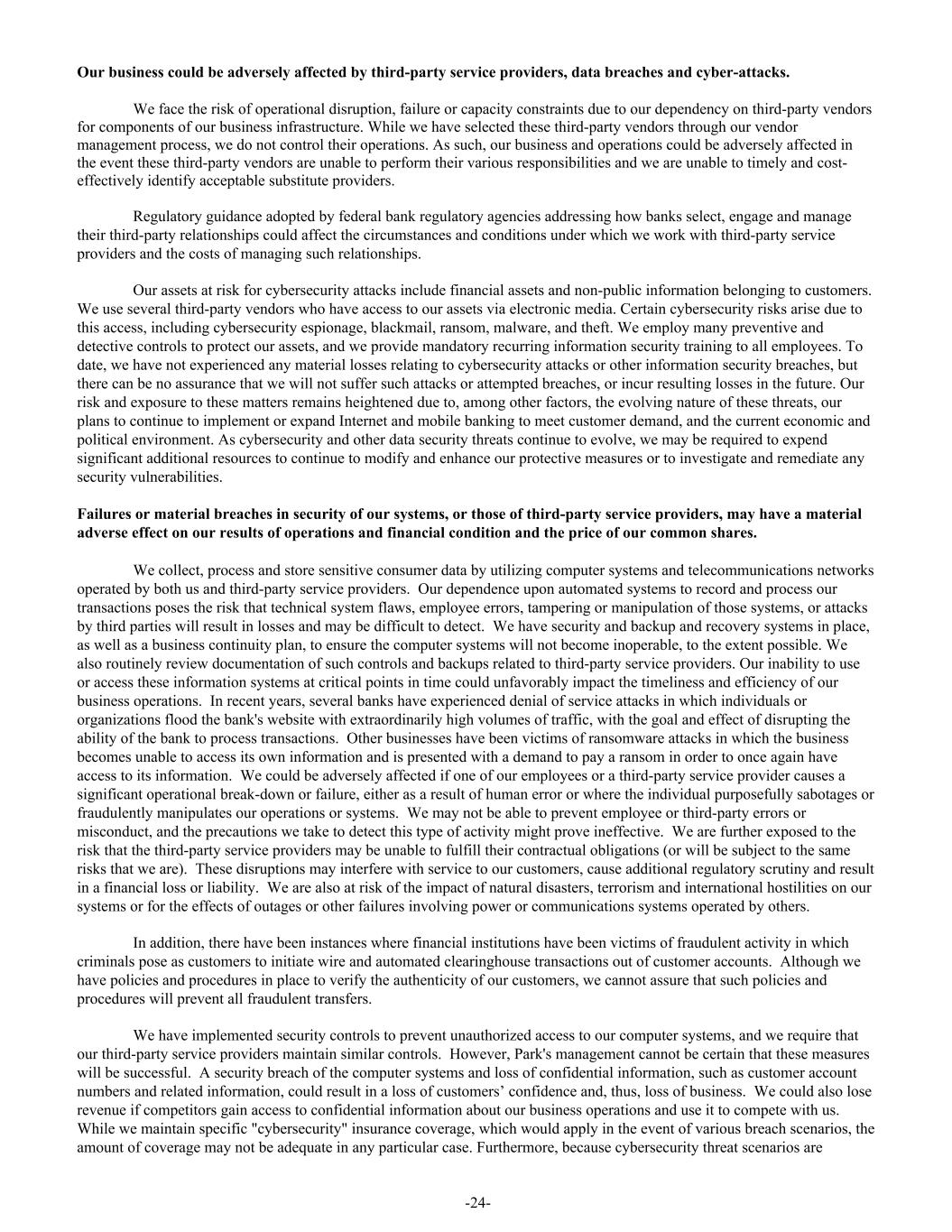 Our business could be adversely affected by third-party service providers, data breaches and cyber-attacks. We face the risk of operational disruption, failure or capacity constraints due to our dependency on third-party vendors for components of our business infrastructure. While we have selected these third-party vendors through our vendor management process, we do not control their operations. As such, our business and operations could be adversely affected in the event these third-party vendors are unable to perform their various responsibilities and we are unable to timely and cost- effectively identify acceptable substitute providers. Regulatory guidance adopted by federal bank regulatory agencies addressing how banks select, engage and manage their third-party relationships could affect the circumstances and conditions under which we work with third-party service providers and the costs of managing such relationships. Our assets at risk for cybersecurity attacks include financial assets and non-public information belonging to customers. We use several third-party vendors who have access to our assets via electronic media. Certain cybersecurity risks arise due to this access, including cybersecurity espionage, blackmail, ransom, malware, and theft. We employ many preventive and detective controls to protect our assets, and we provide mandatory recurring information security training to all employees. To date, we have not experienced any material losses relating to cybersecurity attacks or other information security breaches, but there can be no assurance that we will not suffer such attacks or attempted breaches, or incur resulting losses in the future. Our risk and exposure to these matters remains heightened due to, among other factors, the evolving nature of these threats, our plans to continue to implement or expand Internet and mobile banking to meet customer demand, and the current economic and political environment. As cybersecurity and other data security threats continue to evolve, we may be required to expend significant additional resources to continue to modify and enhance our protective measures or to investigate and remediate any security vulnerabilities. Failures or material breaches in security of our systems, or those of third-party service providers, may have a material adverse effect on our results of operations and financial condition and the price of our common shares. We collect, process and store sensitive consumer data by utilizing computer systems and telecommunications networks operated by both us and third-party service providers. Our dependence upon automated systems to record and process our transactions poses the risk that technical system flaws, employee errors, tampering or manipulation of those systems, or attacks by third parties will result in losses and may be difficult to detect. We have security and backup and recovery systems in place, as well as a business continuity plan, to ensure the computer systems will not become inoperable, to the extent possible. We also routinely review documentation of such controls and backups related to third-party service providers. Our inability to use or access these information systems at critical points in time could unfavorably impact the timeliness and efficiency of our business operations. In recent years, several banks have experienced denial of service attacks in which individuals or organizations flood the bank's website with extraordinarily high volumes of traffic, with the goal and effect of disrupting the ability of the bank to process transactions. Other businesses have been victims of ransomware attacks in which the business becomes unable to access its own information and is presented with a demand to pay a ransom in order to once again have access to its information. We could be adversely affected if one of our employees or a third-party service provider causes a significant operational break-down or failure, either as a result of human error or where the individual purposefully sabotages or fraudulently manipulates our operations or systems. We may not be able to prevent employee or third-party errors or misconduct, and the precautions we take to detect this type of activity might prove ineffective. We are further exposed to the risk that the third-party service providers may be unable to fulfill their contractual obligations (or will be subject to the same risks that we are). These disruptions may interfere with service to our customers, cause additional regulatory scrutiny and result in a financial loss or liability. We are also at risk of the impact of natural disasters, terrorism and international hostilities on our systems or for the effects of outages or other failures involving power or communications systems operated by others. In addition, there have been instances where financial institutions have been victims of fraudulent activity in which criminals pose as customers to initiate wire and automated clearinghouse transactions out of customer accounts. Although we have policies and procedures in place to verify the authenticity of our customers, we cannot assure that such policies and procedures will prevent all fraudulent transfers. We have implemented security controls to prevent unauthorized access to our computer systems, and we require that our third-party service providers maintain similar controls. However, Park's management cannot be certain that these measures will be successful. A security breach of the computer systems and loss of confidential information, such as customer account numbers and related information, could result in a loss of customers’ confidence and, thus, loss of business. We could also lose revenue if competitors gain access to confidential information about our business operations and use it to compete with us. While we maintain specific "cybersecurity" insurance coverage, which would apply in the event of various breach scenarios, the amount of coverage m