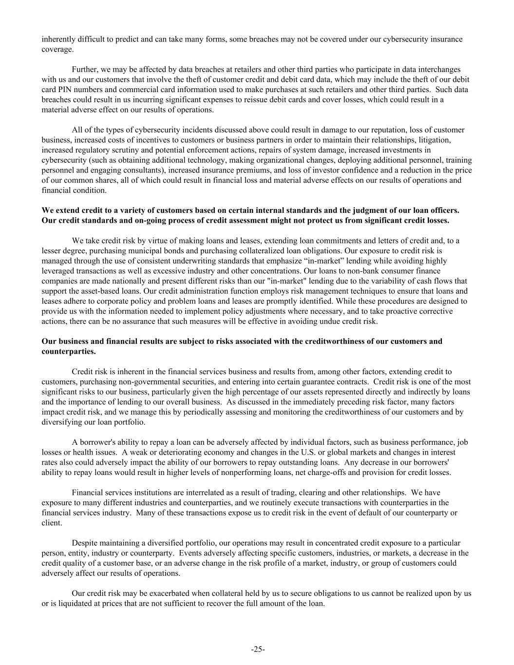 inherently difficult to predict and can take many forms, some breaches may not be covered under our cybersecurity insurance coverage. Further, we may be affected by data breaches at retailers and other third parties who participate in data interchanges with us and our customers that involve the theft of customer credit and debit card data, which may include the theft of our debit card PIN numbers and commercial card information used to make purchases at such retailers and other third parties. Such data breaches could result in us incurring significant expenses to reissue debit cards and cover losses, which could result in a material adverse effect on our results of operations. All of the types of cybersecurity incidents discussed above could result in damage to our reputation, loss of customer business, increased costs of incentives to customers or business partners in order to maintain their relationships, litigation, increased regulatory scrutiny and potential enforcement actions, repairs of system damage, increased investments in cybersecurity (such as obtaining additional technology, making organizational changes, deploying additional personnel, training personnel and engaging consultants), increased insurance premiums, and loss of investor confidence and a reduction in the price of our common shares, all of which could result in financial loss and material adverse effects on our results of operations and financial condition. We extend credit to a variety of customers based on certain internal standards and the judgment of our loan officers. Our credit standards and on-going process of credit assessment might not protect us from significant credit losses. We take credit risk by virtue of making loans and leases, extending loan commitments and letters of credit and, to a lesser degree, purchasing municipal bonds and purchasing collateralized loan obligations. Our exposure to credit risk is managed through the use of consistent underwriting standards that emphasize “in-market” lending while avoiding highly leveraged transactions as well as excessive industry and other concentrations. Our loans to non-bank consumer finance companies are made nationally and present different risks than our "in-market" lending due to the variability of cash flows that support the asset-based loans. Our credit administration function employs risk management techniques to ensure that loans and leases adhere to corporate policy and problem loans and leases are promptly identified. While these procedures are designed to provide us with the information needed to implement policy adjustments where necessary, and to take proactive corrective actions, there can be no assurance that such measures will be effective in avoiding undue credit risk. Our business and financial results are subject to risks associated with the creditworthiness of our customers and counterparties. Credit risk is inherent in the financial services business and results from, among other factors, extending credit to customers, purchasing non-governmental securities, and entering into certain guarantee contracts. Credit risk is one of the most significant risks to our business, particularly given the high percentage of our assets represented directly and indirectly by loans and the importance of lending to our overall business. As discussed in the immediately preceding risk factor, many factors impact credit risk, and we manage this by periodically assessing and monitoring the creditworthiness of our customers and by diversifying our loan portfolio. A borrower's ability to repay a loan can be adversely affected by individual factors, such as business performance, job losses or health issues. A weak or deteriorating economy and changes in the U.S. or global markets and changes in interest rates also could adversely impact the ability of our borrowers to repay outstanding loans. Any decrease in our borrowers' ability to repay loans would result in higher levels of nonperforming loans, net charge-offs and provision for credit losses. Financial services institutions are interrelated as a result of trading, clearing and other relationships. We have exposure to many different industries and counterparties, and we routinely execute transactions with counterparties in the financial services industry. Many of these transactions expose us to credit risk in the event of default of our counterparty or client. Despite maintaining a diversified portfolio, our operations may result in concentrated credit exposure to a particular person, entity, industry or counterparty. Events adversely affecting specific customers, industries, or markets, a decrease in the credit quality of a customer base, or an adverse change in the risk profile of a market, industry, or group of customers could adversely affect our results of operations. Our credit risk may be exacerbated when collateral held by us to secure obligations to us cannot be realized upon by us or is liquidated at prices that are not sufficient to recover the full amount of the loan. -25-