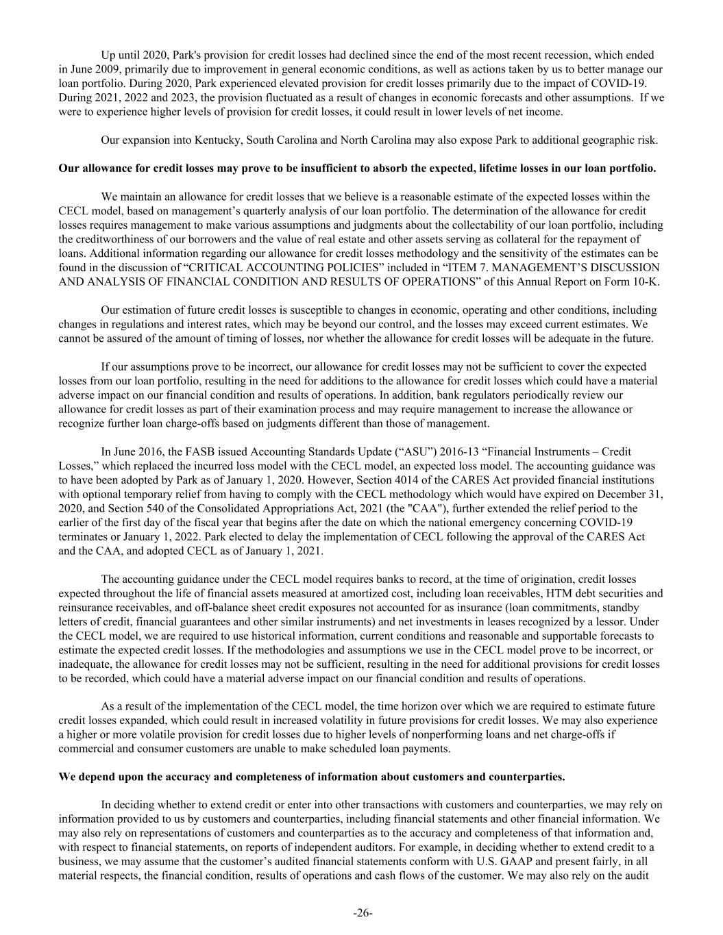 Up until 2020, Park's provision for credit losses had declined since the end of the most recent recession, which ended in June 2009, primarily due to improvement in general economic conditions, as well as actions taken by us to better manage our loan portfolio. During 2020, Park experienced elevated provision for credit losses primarily due to the impact of COVID-19. During 2021, 2022 and 2023, the provision fluctuated as a result of changes in economic forecasts and other assumptions. If we were to experience higher levels of provision for credit losses, it could result in lower levels of net income. Our expansion into Kentucky, South Carolina and North Carolina may also expose Park to additional geographic risk. Our allowance for credit losses may prove to be insufficient to absorb the expected, lifetime losses in our loan portfolio. We maintain an allowance for credit losses that we believe is a reasonable estimate of the expected losses within the CECL model, based on management’s quarterly analysis of our loan portfolio. The determination of the allowance for credit losses requires management to make various assumptions and judgments about the collectability of our loan portfolio, including the creditworthiness of our borrowers and the value of real estate and other assets serving as collateral for the repayment of loans. Additional information regarding our allowance for credit losses methodology and the sensitivity of the estimates can be found in the discussion of “CRITICAL ACCOUNTING POLICIES” included in “ITEM 7. MANAGEMENT’S DISCUSSION AND ANALYSIS OF FINANCIAL CONDITION AND RESULTS OF OPERATIONS” of this Annual Report on Form 10-K. Our estimation of future credit losses is susceptible to changes in economic, operating and other conditions, including changes in regulations and interest rates, which may be beyond our control, and the losses may exceed current estimates. We cannot be assured of the amount of timing of losses, nor whether the allowance for credit losses will be adequate in the future. If our assumptions prove to be incorrect, our allowance for credit losses may not be sufficient to cover the expected losses from our loan portfolio, resulting in the need for additions to the allowance for credit losses which could have a material adverse impact on our financial condition and results of operations. In addition, bank regulators periodically review our allowance for credit losses as part of their examination process and may require management to increase the allowance or recognize further loan charge-offs based on judgments different than those of management. In June 2016, the FASB issued Accounting Standards Update (“ASU”) 2016-13 “Financial Instruments – Credit Losses,” which replaced the incurred loss model with the CECL model, an expected loss model. The accounting guidance was to have been adopted by Park as of January 1, 2020. However, Section 4014 of the CARES Act provided financial institutions with optional temporary relief from having to comply with the CECL methodology which would have expired on December 31, 2020, and Section 540 of the Consolidated Appropriations Act, 2021 (the "CAA"), further extended the relief period to the earlier of the first day of the fiscal year that begins after the date on which the national emergency concerning COVID-19 terminates or January 1, 2022. Park elected to delay the implementation of CECL following the approval of the CARES Act and the CAA, and adopted CECL as of January 1, 2021. The accounting guidance under the CECL model requires banks to record, at the time of origination, credit losses expected throughout the life of financial assets measured at amortized cost, including loan receivables, HTM debt securities and reinsurance receivables, and off-balance sheet credit exposures not accounted for as insurance (loan commitments, standby letters of credit, financial guarantees and other similar instruments) and net investments in leases recognized by a lessor. Under the CECL model, we are required to use historical information, current conditions and reasonable and supportable forecasts to estimate the expected credit losses. If the methodologies and assumptions we use in the CECL model prove to be incorrect, or inadequate, the allowance for credit losses may not be sufficient, resulting in the need for additional provisions for credit losses to be recorded, which could have a material adverse impact on our financial condition and results of operations. As a result of the implementation of the CECL model, the time horizon over which we are required to estimate future credit losses expanded, which could result in increased volatility in future provisions for credit losses. We may also experience a higher or more volatile provision for credit losses due to higher levels of nonperforming loans and net charge-offs if commercial and consumer customers are unable to make scheduled loan payments. We depend upon the accuracy and completeness of information about customers and counterparties. In deciding whether to extend credit or enter into other transactions with customers and counterparties, we may rely on information provided to us by customers and counterparties, including financial statements and other financial information. We may also rely on representations of customers and counterparties as to the accuracy and completeness of that information and, with respect to financial statements, on reports of independent auditors. For example, in deciding whether to extend credit to a business, we may assume that the customer’s audited financial statements conform with U.S. GAAP and present fairly, in all material respects, the financial condition, results of operations and cash flows of the customer. We may also rely on the audit -26-