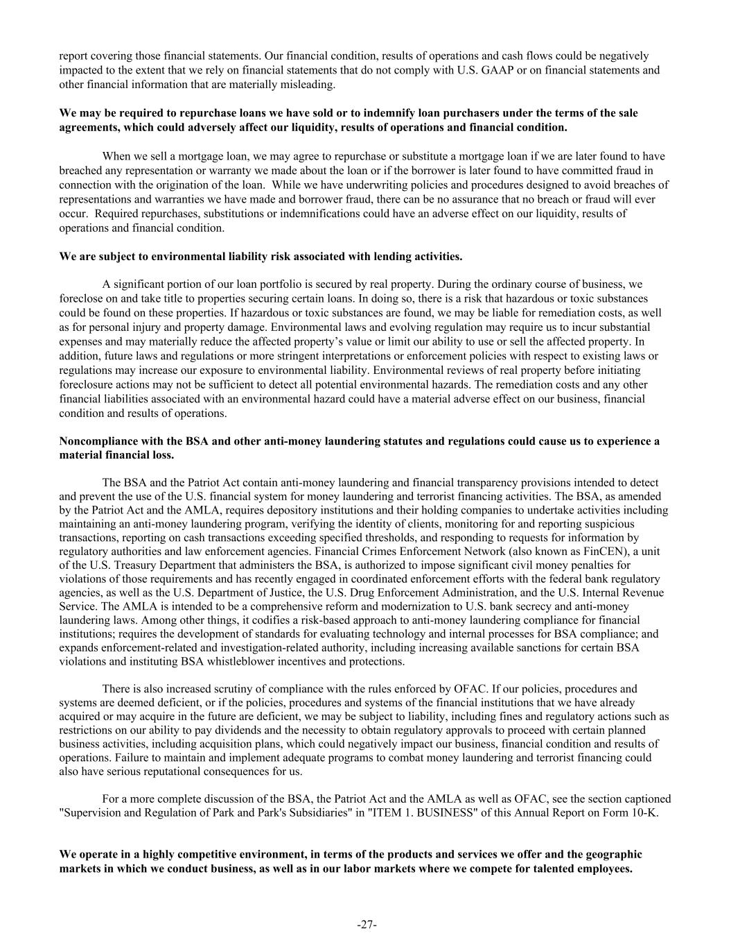 report covering those financial statements. Our financial condition, results of operations and cash flows could be negatively impacted to the extent that we rely on financial statements that do not comply with U.S. GAAP or on financial statements and other financial information that are materially misleading. We may be required to repurchase loans we have sold or to indemnify loan purchasers under the terms of the sale agreements, which could adversely affect our liquidity, results of operations and financial condition. When we sell a mortgage loan, we may agree to repurchase or substitute a mortgage loan if we are later found to have breached any representation or warranty we made about the loan or if the borrower is later found to have committed fraud in connection with the origination of the loan. While we have underwriting policies and procedures designed to avoid breaches of representations and warranties we have made and borrower fraud, there can be no assurance that no breach or fraud will ever occur. Required repurchases, substitutions or indemnifications could have an adverse effect on our liquidity, results of operations and financial condition. We are subject to environmental liability risk associated with lending activities. A significant portion of our loan portfolio is secured by real property. During the ordinary course of business, we foreclose on and take title to properties securing certain loans. In doing so, there is a risk that hazardous or toxic substances could be found on these properties. If hazardous or toxic substances are found, we may be liable for remediation costs, as well as for personal injury and property damage. Environmental laws and evolving regulation may require us to incur substantial expenses and may materially reduce the affected property’s value or limit our ability to use or sell the affected property. In addition, future laws and regulations or more stringent interpretations or enforcement policies with respect to existing laws or regulations may increase our exposure to environmental liability. Environmental reviews of real property before initiating foreclosure actions may not be sufficient to detect all potential environmental hazards. The remediation costs and any other financial liabilities associated with an environmental hazard could have a material adverse effect on our business, financial condition and results of operations. Noncompliance with the BSA and other anti-money laundering statutes and regulations could cause us to experience a material financial loss. The BSA and the Patriot Act contain anti-money laundering and financial transparency provisions intended to detect and prevent the use of the U.S. financial system for money laundering and terrorist financing activities. The BSA, as amended by the Patriot Act and the AMLA, requires depository institutions and their holding companies to undertake activities including maintaining an anti-money laundering program, verifying the identity of clients, monitoring for and reporting suspicious transactions, reporting on cash transactions exceeding specified thresholds, and responding to requests for information by regulatory authorities and law enforcement agencies. Financial Crimes Enforcement Network (also known as FinCEN), a unit of the U.S. Treasury Department that administers the BSA, is authorized to impose significant civil money penalties for violations of those requirements and has recently engaged in coordinated enforcement efforts with the federal bank regulatory agencies, as well as the U.S. Department of Justice, the U.S. Drug Enforcement Administration, and the U.S. Internal Revenue Service. The AMLA is intended to be a comprehensive reform and modernization to U.S. bank secrecy and anti-money laundering laws. Among other things, it codifies a risk-based approach to anti-money laundering compliance for financial institutions; requires the development of standards for evaluating technology and internal processes for BSA compliance; and expands enforcement-related and investigation-related authority, including increasing available sanctions for certain BSA violations and instituting BSA whistleblower incentives and protections. There is also increased scrutiny of compliance with the rules enforced by OFAC. If our policies, procedures and systems are deemed deficient, or if the policies, procedures and systems of the financial institutions that we have already acquired or may acquire in the future are deficient, we may be subject to liability, including fines and regulatory actions such as restrictions on our ability to pay dividends and the necessity to obtain regulatory approvals to proceed with certain planned business activities, including acquisition plans, which could negatively impact our business, financial condition and results of operations. Failure to maintain and implement adequate programs to combat money laundering and terrorist financing could also have serious reputational consequences for us. For a more complete discussion of the BSA, the Patriot Act and the AMLA as well as OFAC, see the section captioned "Supervision and Regulation of Park and Park's Subsidiaries" in "ITEM 1. BUSINESS" of this Annual Report on Form 10-K. We operate in a highly competitive environment, in terms of the products and services we offer and the geographic markets in which we conduct business, as well as in our labor markets where we compete for talented employees. -27-