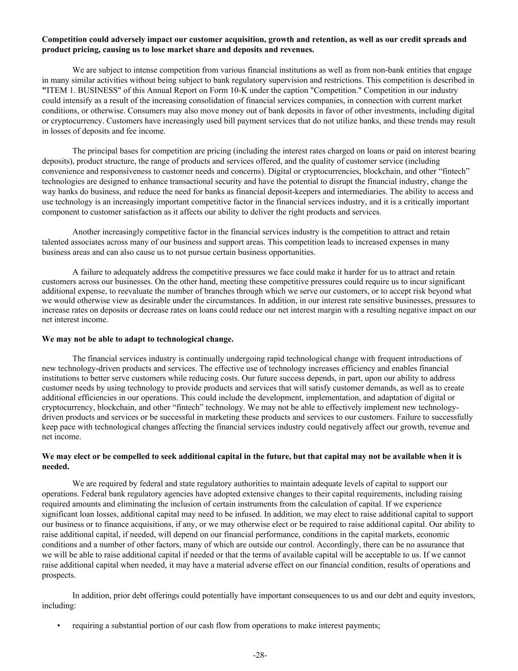 Competition could adversely impact our customer acquisition, growth and retention, as well as our credit spreads and product pricing, causing us to lose market share and deposits and revenues. We are subject to intense competition from various financial institutions as well as from non-bank entities that engage in many similar activities without being subject to bank regulatory supervision and restrictions. This competition is described in "ITEM 1. BUSINESS" of this Annual Report on Form 10-K under the caption "Competition." Competition in our industry could intensify as a result of the increasing consolidation of financial services companies, in connection with current market conditions, or otherwise. Consumers may also move money out of bank deposits in favor of other investments, including digital or cryptocurrency. Customers have increasingly used bill payment services that do not utilize banks, and these trends may result in losses of deposits and fee income. The principal bases for competition are pricing (including the interest rates charged on loans or paid on interest bearing deposits), product structure, the range of products and services offered, and the quality of customer service (including convenience and responsiveness to customer needs and concerns). Digital or cryptocurrencies, blockchain, and other “fintech” technologies are designed to enhance transactional security and have the potential to disrupt the financial industry, change the way banks do business, and reduce the need for banks as financial deposit-keepers and intermediaries. The ability to access and use technology is an increasingly important competitive factor in the financial services industry, and it is a critically important component to customer satisfaction as it affects our ability to deliver the right products and services. Another increasingly competitive factor in the financial services industry is the competition to attract and retain talented associates across many of our business and support areas. This competition leads to increased expenses in many business areas and can also cause us to not pursue certain business opportunities. A failure to adequately address the competitive pressures we face could make it harder for us to attract and retain customers across our businesses. On the other hand, meeting these competitive pressures could require us to incur significant additional expense, to reevaluate the number of branches through which we serve our customers, or to accept risk beyond what we would otherwise view as desirable under the circumstances. In addition, in our interest rate sensitive businesses, pressures to increase rates on deposits or decrease rates on loans could reduce our net interest margin with a resulting negative impact on our net interest income. We may not be able to adapt to technological change. The financial services industry is continually undergoing rapid technological change with frequent introductions of new technology-driven products and services. The effective use of technology increases efficiency and enables financial institutions to better serve customers while reducing costs. Our future success depends, in part, upon our ability to address customer needs by using technology to provide products and services that will satisfy customer demands, as well as to create additional efficiencies in our operations. This could include the development, implementation, and adaptation of digital or cryptocurrency, blockchain, and other “fintech” technology. We may not be able to effectively implement new technology- driven products and services or be successful in marketing these products and services to our customers. Failure to successfully keep pace with technological changes affecting the financial services industry could negatively affect our growth, revenue and net income. We may elect or be compelled to seek additional capital in the future, but that capital may not be available when it is needed. We are required by federal and state regulatory authorities to maintain adequate levels of capital to support our operations. Federal bank regulatory agencies have adopted extensive changes to their capital requirements, including raising required amounts and eliminating the inclusion of certain instruments from the calculation of capital. If we experience significant loan losses, additional capital may need to be infused. In addition, we may elect to raise additional capital to support our business or to finance acquisitions, if any, or we may otherwise elect or be required to raise additional capital. Our ability to raise additional capital, if needed, will depend on our financial performance, conditions in the capital markets, economic conditions and a number of other factors, many of which are outside our control. Accordingly, there can be no assurance that we will be able to raise additional capital if needed or that the terms of available capital will be acceptable to us. If we cannot raise additional capital when needed, it may have a material adverse effect on our financial condition, results of operations and prospects. In addition, prior debt offerings could potentially have important consequences to us and our debt and equity investors, including: • requiring a substantial portion of our cash flow from operations to make interest payments; -28-