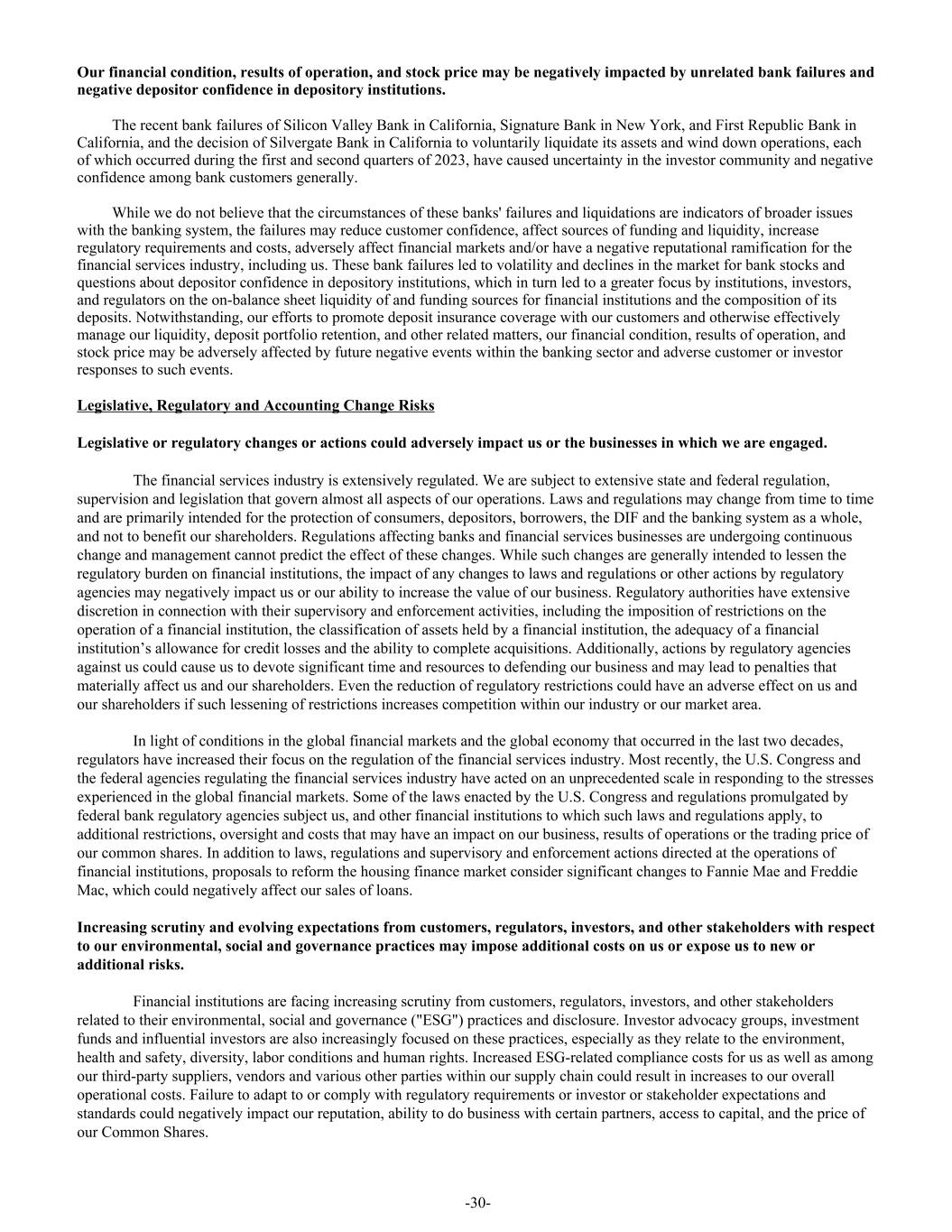Our financial condition, results of operation, and stock price may be negatively impacted by unrelated bank failures and negative depositor confidence in depository institutions. The recent bank failures of Silicon Valley Bank in California, Signature Bank in New York, and First Republic Bank in California, and the decision of Silvergate Bank in California to voluntarily liquidate its assets and wind down operations, each of which occurred during the first and second quarters of 2023, have caused uncertainty in the investor community and negative confidence among bank customers generally. While we do not believe that the circumstances of these banks' failures and liquidations are indicators of broader issues with the banking system, the failures may reduce customer confidence, affect sources of funding and liquidity, increase regulatory requirements and costs, adversely affect financial markets and/or have a negative reputational ramification for the financial services industry, including us. These bank failures led to volatility and declines in the market for bank stocks and questions about depositor confidence in depository institutions, which in turn led to a greater focus by institutions, investors, and regulators on the on-balance sheet liquidity of and funding sources for financial institutions and the composition of its deposits. Notwithstanding, our efforts to promote deposit insurance coverage with our customers and otherwise effectively manage our liquidity, deposit portfolio retention, and other related matters, our financial condition, results of operation, and stock price may be adversely affected by future negative events within the banking sector and adverse customer or investor responses to such events. Legislative, Regulatory and Accounting Change Risks Legislative or regulatory changes or actions could adversely impact us or the businesses in which we are engaged. The financial services industry is extensively regulated. We are subject to extensive state and federal regulation, supervision and legislation that govern almost all aspects of our operations. Laws and regulations may change from time to time and are primarily intended for the protection of consumers, depositors, borrowers, the DIF and the banking system as a whole, and not to benefit our shareholders. Regulations affecting banks and financial services businesses are undergoing continuous change and management cannot predict the effect of these changes. While such changes are generally intended to lessen the regulatory burden on financial institutions, the impact of any changes to laws and regulations or other actions by regulatory agencies may negatively impact us or our ability to increase the value of our business. Regulatory authorities have extensive discretion in connection with their supervisory and enforcement activities, including the imposition of restrictions on the operation of a financial institution, the classification of assets held by a financial institution, the adequacy of a financial institution’s allowance for credit losses and the ability to complete acquisitions. Additionally, actions by regulatory agencies against us could cause us to devote significant time and resources to defending our business and may lead to penalties that materially affect us and our shareholders. Even the reduction of regulatory restrictions could have an adverse effect on us and our shareholders if such lessening of restrictions increases competition within our industry or our market area. In light of conditions in the global financial markets and the global economy that occurred in the last two decades, regulators have increased their focus on the regulation of the financial services industry. Most recently, the U.S. Congress and the federal agencies regulating the financial services industry have acted on an unprecedented scale in responding to the stresses experienced in the global financial markets. Some of the laws enacted by the U.S. Congress and regulations promulgated by federal bank regulatory agencies subject us, and other financial institutions to which such laws and regulations apply, to additional restrictions, oversight and costs that may have an impact on our business, results of operations or the trading price of our common shares. In addition to laws, regulations and supervisory and enforcement actions directed at the operations of financial institutions, proposals to reform the housing finance market consider significant changes to Fannie Mae and Freddie Mac, which could negatively affect our sales of loans. Increasing scrutiny and evolving expectations from customers, regulators, investors, and other stakeholders with respect to our environmental, social and governance practices may impose additional costs on us or expose us to new or additional risks. Financial institutions are facing increasing scrutiny from customers, regulators, investors, and other stakeholders related to their environmental, social and governance ("ESG") practices and disclosure. Investor advocacy groups, investment funds and influential investors are also increasingly focused on these practices, especially as they relate to the environment, health and safety, diversity, labor conditions and human rights. Increased ESG-related compliance costs for us as well as among our third-party suppliers, vendors and various other parties within our supply chain could result in increases to our overall operational costs. Failure to adapt to or comply with regulatory requirements or investor or stakeholder expectations and standards could negatively impact our reputation, ability to do business with certain partners, access to capital, and the price of our Common Shares. -30-