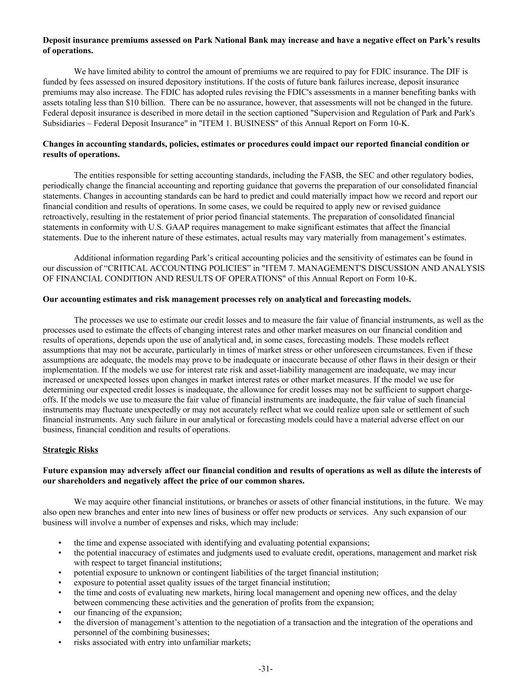 Deposit insurance premiums assessed on Park National Bank may increase and have a negative effect on Park’s results of operations. We have limited ability to control the amount of premiums we are required to pay for FDIC insurance. The DIF is funded by fees assessed on insured depository institutions. If the costs of future bank failures increase, deposit insurance premiums may also increase. The FDIC has adopted rules revising the FDIC's assessments in a manner benefiting banks with assets totaling less than $10 billion. There can be no assurance, however, that assessments will not be changed in the future. Federal deposit insurance is described in more detail in the section captioned "Supervision and Regulation of Park and Park's Subsidiaries – Federal Deposit Insurance" in "ITEM 1. BUSINESS" of this Annual Report on Form 10-K. Changes in accounting standards, policies, estimates or procedures could impact our reported financial condition or results of operations. The entities responsible for setting accounting standards, including the FASB, the SEC and other regulatory bodies, periodically change the financial accounting and reporting guidance that governs the preparation of our consolidated financial statements. Changes in accounting standards can be hard to predict and could materially impact how we record and report our financial condition and results of operations. In some cases, we could be required to apply new or revised guidance retroactively, resulting in the restatement of prior period financial statements. The preparation of consolidated financial statements in conformity with U.S. GAAP requires management to make significant estimates that affect the financial statements. Due to the inherent nature of these estimates, actual results may vary materially from management’s estimates. Additional information regarding Park’s critical accounting policies and the sensitivity of estimates can be found in our discussion of “CRITICAL ACCOUNTING POLICIES” in "ITEM 7. MANAGEMENT'S DISCUSSION AND ANALYSIS OF FINANCIAL CONDITION AND RESULTS OF OPERATIONS" of this Annual Report on Form 10-K. Our accounting estimates and risk management processes rely on analytical and forecasting models. The processes we use to estimate our credit losses and to measure the fair value of financial instruments, as well as the processes used to estimate the effects of changing interest rates and other market measures on our financial condition and results of operations, depends upon the use of analytical and, in some cases, forecasting models. These models reflect assumptions that may not be accurate, particularly in times of market stress or other unforeseen circumstances. Even if these assumptions are adequate, the models may prove to be inadequate or inaccurate because of other flaws in their design or their implementation. If the models we use for interest rate risk and asset-liability management are inadequate, we may incur increased or unexpected losses upon changes in market interest rates or other market measures. If the model we use for determining our expected credit losses is inadequate, the allowance for credit losses may not be sufficient to support charge- offs. If the models we use to measure the fair value of financial instruments are inadequate, the fair value of such financial instruments may fluctuate unexpectedly or may not accurately reflect what we could realize upon sale or settlement of such financial instruments. Any such failure in our analytical or forecasting models could have a material adverse effect on our business, financial condition and results of operations. Strategic Risks Future expansion may adversely affect our financial condition and results of operations as well as dilute the interests of our shareholders and negatively affect the price of our common shares. We may acquire other financial institutions, or branches or assets of other financial institutions, in the future. We may also open new branches and enter into new lines of business or offer new products or services. Any such expansion of our business will involve a number of expenses and risks, which may include: • the time and expense associated with identifying and evaluating potential expansions; • the potential inaccuracy of estimates and judgments used to evaluate credit, operations, management and market risk with respect to target financial institutions; • potential exposure to unknown or contingent liabilities of the target financial institution; • exposure to potential asset quality issues of the target financial institution; • the time and costs of evaluating new markets, hiring local management and opening new offices, and the delay between commencing these activities and the generation of profits from the expansion; • our financing of the expansion; • the diversion of management’s attention to the negotiation of a transaction and the integration of the operations and personnel of the combining businesses; • risks associated with entry into unfamiliar markets; -31-