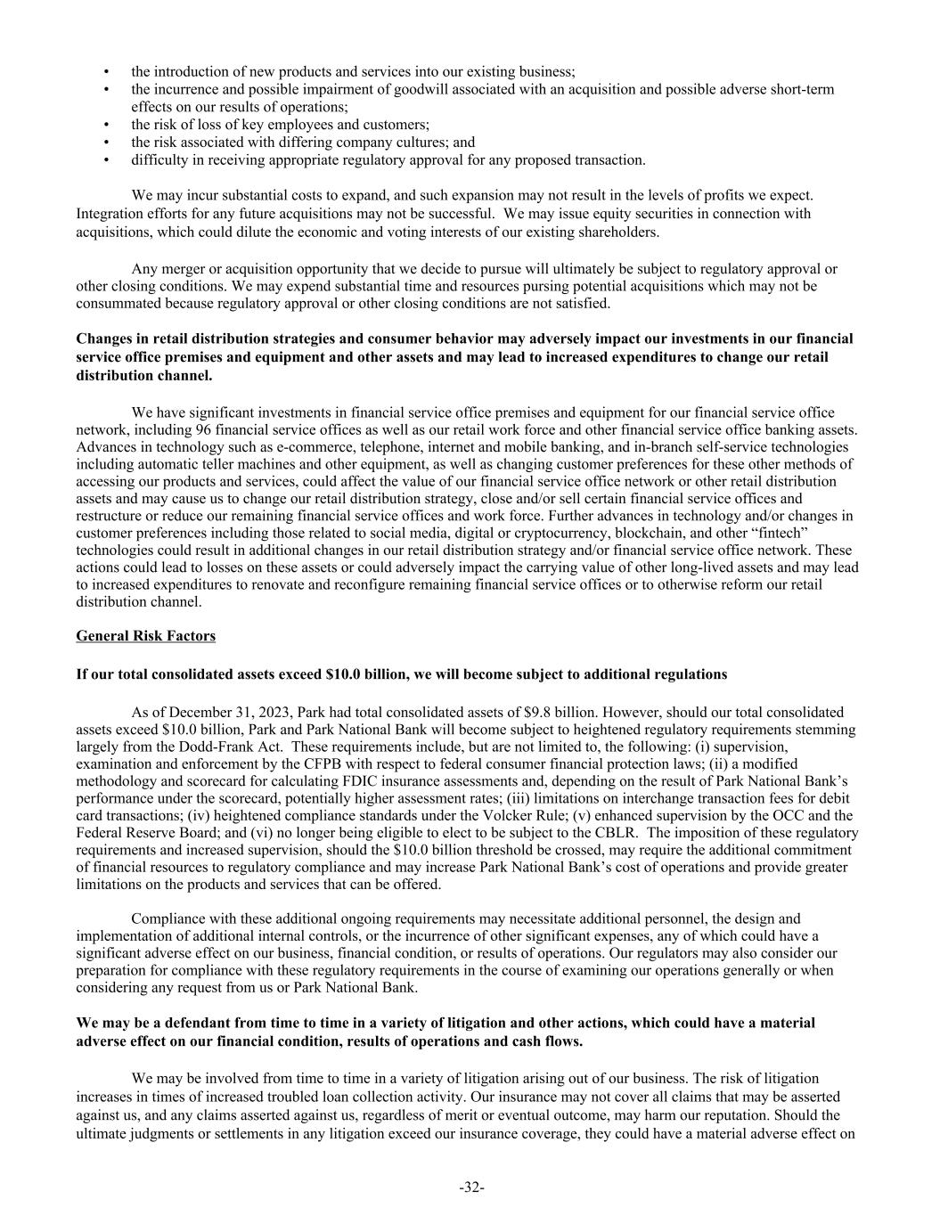 • the introduction of new products and services into our existing business; • the incurrence and possible impairment of goodwill associated with an acquisition and possible adverse short-term effects on our results of operations; • the risk of loss of key employees and customers; • the risk associated with differing company cultures; and • difficulty in receiving appropriate regulatory approval for any proposed transaction. We may incur substantial costs to expand, and such expansion may not result in the levels of profits we expect. Integration efforts for any future acquisitions may not be successful. We may issue equity securities in connection with acquisitions, which could dilute the economic and voting interests of our existing shareholders. Any merger or acquisition opportunity that we decide to pursue will ultimately be subject to regulatory approval or other closing conditions. We may expend substantial time and resources pursing potential acquisitions which may not be consummated because regulatory approval or other closing conditions are not satisfied. Changes in retail distribution strategies and consumer behavior may adversely impact our investments in our financial service office premises and equipment and other assets and may lead to increased expenditures to change our retail distribution channel. We have significant investments in financial service office premises and equipment for our financial service office network, including 96 financial service offices as well as our retail work force and other financial service office banking assets. Advances in technology such as e-commerce, telephone, internet and mobile banking, and in-branch self-service technologies including automatic teller machines and other equipment, as well as changing customer preferences for these other methods of accessing our products and services, could affect the value of our financial service office network or other retail distribution assets and may cause us to change our retail distribution strategy, close and/or sell certain financial service offices and restructure or reduce our remaining financial service offices and work force. Further advances in technology and/or changes in customer preferences including those related to social media, digital or cryptocurrency, blockchain, and other “fintech” technologies could result in additional changes in our retail distribution strategy and/or financial service office network. These actions could lead to losses on these assets or could adversely impact the carrying value of other long-lived assets and may lead to increased expenditures to renovate and reconfigure remaining financial service offices or to otherwise reform our retail distribution channel. General Risk Factors If our total consolidated assets exceed $10.0 billion, we will become subject to additional regulations As of December 31, 2023, Park had total consolidated assets of $9.8 billion. However, should our total consolidated assets exceed $10.0 billion, Park and Park National Bank will become subject to heightened regulatory requirements stemming largely from the Dodd-Frank Act. These requirements include, but are not limited to, the following: (i) supervision, examination and enforcement by the CFPB with respect to federal consumer financial protection laws; (ii) a modified methodology and scorecard for calculating FDIC insurance assessments and, depending on the result of Park National Bank’s performance under the scorecard, potentially higher assessment rates; (iii) limitations on interchange transaction fees for debit card transactions; (iv) heightened compliance standards under the Volcker Rule; (v) enhanced supervision by the OCC and the Federal Reserve Board; and (vi) no longer being eligible to elect to be subject to the CBLR. The imposition of these regulatory requirements and increased supervision, should the $10.0 billion threshold be crossed, may require the additional commitment of financial resources to regulatory compliance and may increase Park National Bank’s cost of operations and provide greater limitations on the products and services that can be offered. Compliance with these additional ongoing requirements may necessitate additional personnel, the design and implementation of additional internal controls, or the incurrence of other significant expenses, any of which could have a significant adverse effect on our business, financial condition, or results of operations. Our regulators may also consider our preparation for compliance with these regulatory requirements in the course of examining our operations generally or when considering any request from us or Park National Bank. We may be a defendant from time to time in a variety of litigation and other actions, which could have a material adverse effect on our financial condition, results of operations and cash flows. We may be involved from time to time in a variety of litigation arising out of our business. The risk of litigation increases in times of increased troubled loan collection activity. Our insurance may not cover all claims that may be asserted against us, and any claims asserted against us, regardless of merit or eventual outcome, may harm our reputation. Should the ultimate judgments or settlements in any litigation exceed our insurance coverage, they could have a material adverse effect on -32-