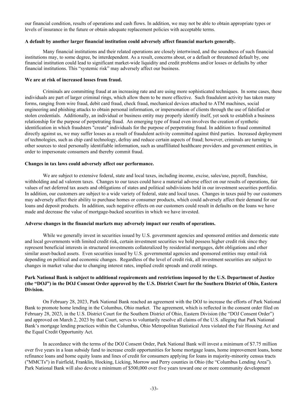 our financial condition, results of operations and cash flows. In addition, we may not be able to obtain appropriate types or levels of insurance in the future or obtain adequate replacement policies with acceptable terms. A default by another larger financial institution could adversely affect financial markets generally. Many financial institutions and their related operations are closely intertwined, and the soundness of such financial institutions may, to some degree, be interdependent. As a result, concerns about, or a default or threatened default by, one financial institution could lead to significant market-wide liquidity and credit problems and/or losses or defaults by other financial institutions. This “systemic risk” may adversely affect our business. We are at risk of increased losses from fraud. Criminals are committing fraud at an increasing rate and are using more sophisticated techniques. In some cases, these individuals are part of larger criminal rings, which allow them to be more effective. Such fraudulent activity has taken many forms, ranging from wire fraud, debit card fraud, check fraud, mechanical devices attached to ATM machines, social engineering and phishing attacks to obtain personal information, or impersonation of clients through the use of falsified or stolen credentials. Additionally, an individual or business entity may properly identify itself, yet seek to establish a business relationship for the purpose of perpetrating fraud. An emerging type of fraud even involves the creation of synthetic identification in which fraudsters "create" individuals for the purpose of perpetrating fraud. In addition to fraud committed directly against us, we may suffer losses as a result of fraudulent activity committed against third parties. Increased deployment of technologies, such as chip card technology, defray and reduce certain aspects of fraud; however, criminals are turning to other sources to steal personally identifiable information, such as unaffiliated healthcare providers and government entities, in order to impersonate consumers and thereby commit fraud. Changes in tax laws could adversely affect our performance. We are subject to extensive federal, state and local taxes, including income, excise, sales/use, payroll, franchise, withholding and ad valorem taxes. Changes to our taxes could have a material adverse effect on our results of operations, fair values of net deferred tax assets and obligations of states and political subdivisions held in our investment securities portfolio. In addition, our customers are subject to a wide variety of federal, state and local taxes. Changes in taxes paid by our customers may adversely affect their ability to purchase homes or consumer products, which could adversely affect their demand for our loans and deposit products. In addition, such negative effects on our customers could result in defaults on the loans we have made and decrease the value of mortgage-backed securities in which we have invested. Adverse changes in the financial markets may adversely impact our results of operations. While we generally invest in securities issued by U.S. government agencies and sponsored entities and domestic state and local governments with limited credit risk, certain investment securities we hold possess higher credit risk since they represent beneficial interests in structured investments collateralized by residential mortgages, debt obligations and other similar asset-backed assets. Even securities issued by U.S. governmental agencies and sponsored entities may entail risk depending on political and economic changes. Regardless of the level of credit risk, all investment securities are subject to changes in market value due to changing interest rates, implied credit spreads and credit ratings. Park National Bank is subject to additional requirements and restrictions imposed by the U.S. Department of Justice (the “DOJ”) in the DOJ Consent Order approved by the U.S. District Court for the Southern District of Ohio, Eastern Division. On February 28, 2023, Park National Bank reached an agreement with the DOJ to increase the efforts of Park National Bank to promote home lending in the Columbus, Ohio market. The agreement, which is reflected in the consent order filed on February 28, 2023, in the U.S. District Court for the Southern District of Ohio, Eastern Division (the “DOJ Consent Order”) and approved on March 2, 2023 by that Court, serves to voluntarily resolve all claims of the U.S. alleging that Park National Bank’s mortgage lending practices within the Columbus, Ohio Metropolitan Statistical Area violated the Fair Housing Act and the Equal Credit Opportunity Act. In accordance with the terms of the DOJ Consent Order, Park National Bank will invest a minimum of $7.75 million over five years in a loan subsidy fund to increase credit opportunities for home mortgage loans, home improvement loans, home refinance loans and home equity loans and lines of credit for consumers applying for loans in majority-minority census tracts ("MMCTs") in Fairfield, Franklin, Hocking, Licking, Morrow and Perry counties in Ohio (the “Columbus Lending Area”). Park National Bank will also devote a minimum of $500,000 over five years toward one or more community development -33-