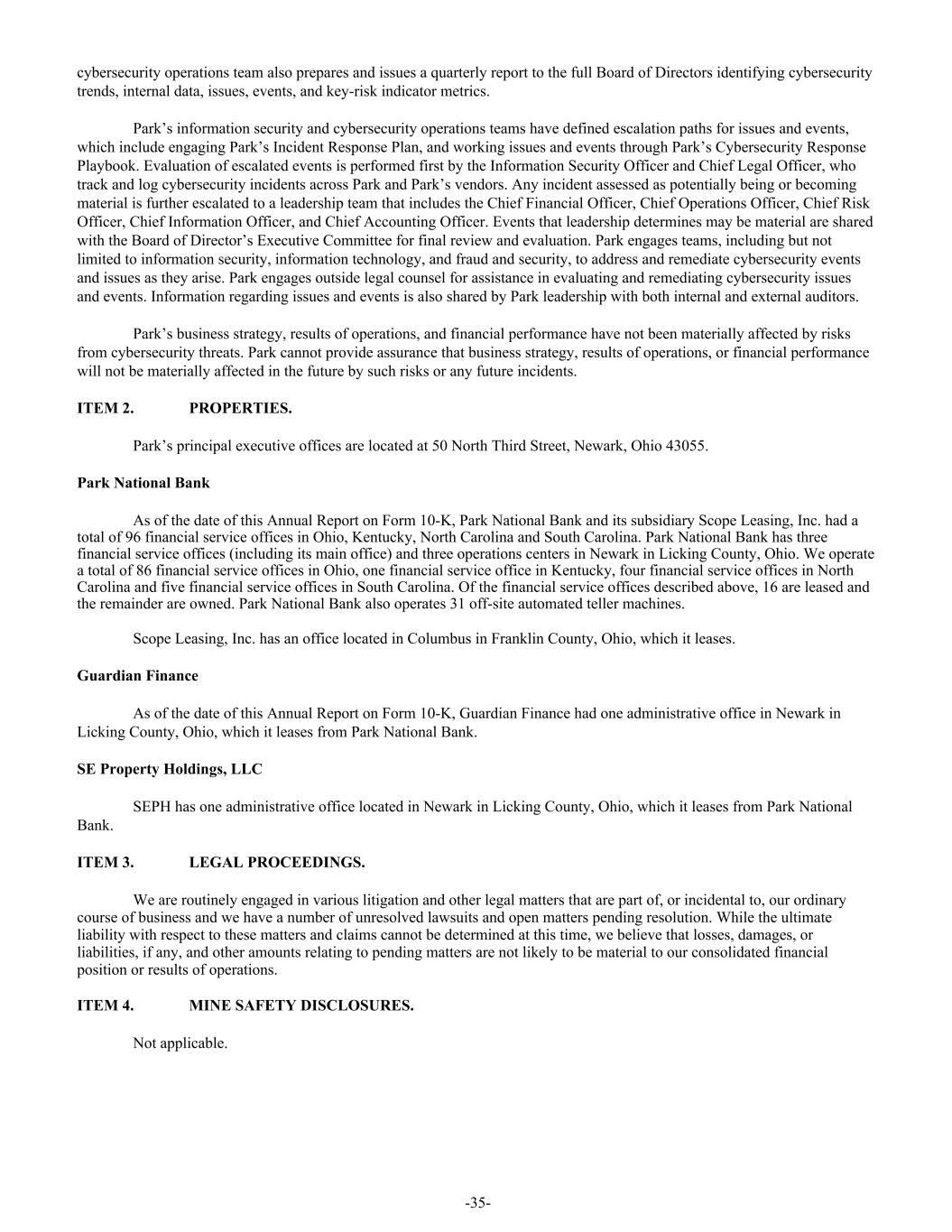 cybersecurity operations team also prepares and issues a quarterly report to the full Board of Directors identifying cybersecurity trends, internal data, issues, events, and key-risk indicator metrics. Park’s information security and cybersecurity operations teams have defined escalation paths for issues and events, which include engaging Park’s Incident Response Plan, and working issues and events through Park’s Cybersecurity Response Playbook. Evaluation of escalated events is performed first by the Information Security Officer and Chief Legal Officer, who track and log cybersecurity incidents across Park and Park’s vendors. Any incident assessed as potentially being or becoming material is further escalated to a leadership team that includes the Chief Financial Officer, Chief Operations Officer, Chief Risk Officer, Chief Information Officer, and Chief Accounting Officer. Events that leadership determines may be material are shared with the Board of Director’s Executive Committee for final review and evaluation. Park engages teams, including but not limited to information security, information technology, and fraud and security, to address and remediate cybersecurity events and issues as they arise. Park engages outside legal counsel for assistance in evaluating and remediating cybersecurity issues and events. Information regarding issues and events is also shared by Park leadership with both internal and external auditors. Park’s business strategy, results of operations, and financial performance have not been materially affected by risks from cybersecurity threats. Park cannot provide assurance that business strategy, results of operations, or financial performance will not be materially affected in the future by such risks or any future incidents. ITEM 2. PROPERTIES. Park’s principal executive offices are located at 50 North Third Street, Newark, Ohio 43055. Park National Bank As of the date of this Annual Report on Form 10-K, Park National Bank and its subsidiary Scope Leasing, Inc. had a total of 96 financial service offices in Ohio, Kentucky, North Carolina and South Carolina. Park National Bank has three financial service offices (including its main office) and three operations centers in Newark in Licking County, Ohio. We operate a total of 86 financial service offices in Ohio, one financial service office in Kentucky, four financial service offices in North Carolina and five financial service offices in South Carolina. Of the financial service offices described above, 16 are leased and the remainder are owned. Park National Bank also operates 31 off-site automated teller machines. Scope Leasing, Inc. has an office located in Columbus in Franklin County, Ohio, which it leases. Guardian Finance As of the date of this Annual Report on Form 10-K, Guardian Finance had one administrative office in Newark in Licking County, Ohio, which it leases from Park National Bank. SE Property Holdings, LLC SEPH has one administrative office located in Newark in Licking County, Ohio, which it leases from Park National Bank. ITEM 3. LEGAL PROCEEDINGS. We are routinely engaged in various litigation and other legal matters that are part of, or incidental to, our ordinary course of business and we have a number of unresolved lawsuits and open matters pending resolution. While the ultimate liability with respect to these matters and claims cannot be determined at this time, we believe that losses, damages, or liabilities, if any, and other amounts relating to pending matters are not likely to be material to our consolidated financial position or results of operations. ITEM 4. MINE SAFETY DISCLOSURES. Not applicable. -35-