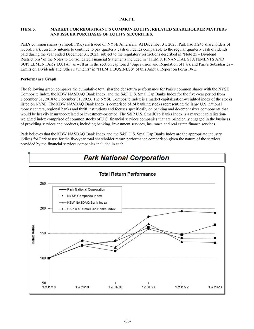 PART II ITEM 5. MARKET FOR REGISTRANT’S COMMON EQUITY, RELATED SHAREHOLDER MATTERS AND ISSUER PURCHASES OF EQUITY SECURITIES. Park's common shares (symbol: PRK) are traded on NYSE American. At December 31, 2023, Park had 3,245 shareholders of record. Park currently intends to continue to pay quarterly cash dividends comparable to the regular quarterly cash dividends paid during the year ended December 31, 2023, subject to the regulatory restrictions described in "Note 25 - Dividend Restrictions" of the Notes to Consolidated Financial Statements included in "ITEM 8. FINANCIAL STATEMENTS AND SUPPLEMENTARY DATA," as well as in the section captioned "Supervision and Regulation of Park and Park's Subsidiaries – Limits on Dividends and Other Payments" in "ITEM 1. BUSINESS" of this Annual Report on Form 10-K. Performance Graph The following graph compares the cumulative total shareholder return performance for Park's common shares with the NYSE Composite Index, the KBW NASDAQ Bank Index, and the S&P U.S. SmallCap Banks Index for the five-year period from December 31, 2018 to December 31, 2023. The NYSE Composite Index is a market capitalization-weighted index of the stocks listed on NYSE. The KBW NASDAQ Bank Index is comprised of 24 banking stocks representing the large U.S. national money centers, regional banks and thrift institutions and focuses specifically on banking and de-emphasizes components that would be heavily insurance-related or investment-oriented. The S&P U.S. SmallCap Banks Index is a market capitalization- weighted index comprised of common stocks of U.S. financial services companies that are principally engaged in the business of providing services and products, including banking, investment services, insurance and real estate finance services. Park believes that the KBW NASDAQ Bank Index and the S&P U.S. SmallCap Banks Index are the appropriate industry indices for Park to use for the five-year total shareholder return performance comparison given the nature of the services provided by the financial services companies included in each. -36-
