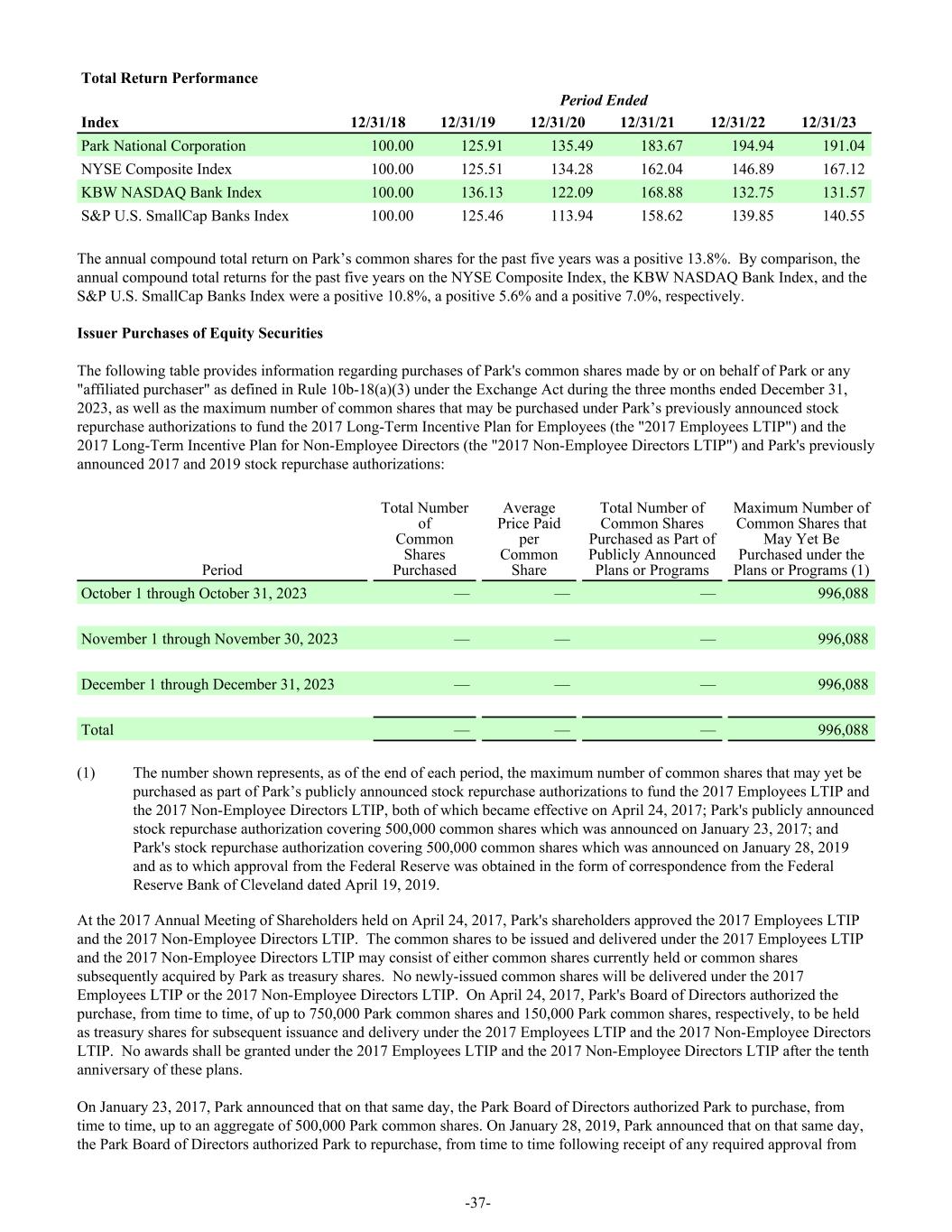 Total Return Performance Period Ended Index 12/31/18 12/31/19 12/31/20 12/31/21 12/31/22 12/31/23 Park National Corporation 100.00 125.91 135.49 183.67 194.94 191.04 NYSE Composite Index 100.00 125.51 134.28 162.04 146.89 167.12 KBW NASDAQ Bank Index 100.00 136.13 122.09 168.88 132.75 131.57 S&P U.S. SmallCap Banks Index 100.00 125.46 113.94 158.62 139.85 140.55 The annual compound total return on Park’s common shares for the past five years was a positive 13.8%. By comparison, the annual compound total returns for the past five years on the NYSE Composite Index, the KBW NASDAQ Bank Index, and the S&P U.S. SmallCap Banks Index were a positive 10.8%, a positive 5.6% and a positive 7.0%, respectively. Issuer Purchases of Equity Securities The following table provides information regarding purchases of Park's common shares made by or on behalf of Park or any "affiliated purchaser" as defined in Rule 10b-18(a)(3) under the Exchange Act during the three months ended December 31, 2023, as well as the maximum number of common shares that may be purchased under Park’s previously announced stock repurchase authorizations to fund the 2017 Long-Term Incentive Plan for Employees (the "2017 Employees LTIP") and the 2017 Long-Term Incentive Plan for Non-Employee Directors (the "2017 Non-Employee Directors LTIP") and Park's previously announced 2017 and 2019 stock repurchase authorizations: Period Total Number of Common Shares Purchased Average Price Paid per Common Share Total Number of Common Shares Purchased as Part of Publicly Announced Plans or Programs Maximum Number of Common Shares that May Yet Be Purchased under the Plans or Programs (1) October 1 through October 31, 2023 — — — 996,088 November 1 through November 30, 2023 — — — 996,088 December 1 through December 31, 2023 — — — 996,088 Total — — — 996,088 (1) The number shown represents, as of the end of each period, the maximum number of common shares that may yet be purchased as part of Park’s publicly announced stock repurchase authorizations to fund the 2017 Employees LTIP and the 2017 Non-Employee Directors LTIP, both of which became effective on April 24, 2017; Park's publicly announced stock repurchase authorization covering 500,000 common shares which was announced on January 23, 2017; and Park's stock repurchase authorization covering 500,000 common shares which was announced on January 28, 2019 and as to which approval from the Federal Reserve was obtained in the form of correspondence from the Federal Reserve Bank of Cleveland dated April 19, 2019. At the 2017 Annual Meeting of Shareholders held on April 24, 2017, Park's shareholders approved the 2017 Employees LTIP and the 2017 Non-Employee Directors LTIP. The common shares to be issued and delivered under the 2017 Employees LTIP and the 2017 Non-Employee Directors LTIP may consist of either common shares currently held or common shares subsequently acquired by Park as treasury shares. No newly-issued common shares will be delivered under the 2017 Employees LTIP or the 2017 Non-Employee Directors LTIP. On April 24, 2017, Park's Board of Directors authorized the purchase, from time to time, of up to 750,000 Park common shares and 150,000 Park common shares, respectively, to be held as treasury shares for subsequent issuance and delivery under the 2017 Employees LTIP and the 2017 Non-Employee Directors LTIP. No awards shall be granted under the 2017 Employees LTIP and the 2017 Non-Employee Directors LTIP after the tenth anniversary of these plans. On January 23, 2017, Park announced that on that same day, the Park Board of Directors authorized Park to purchase, from time to time, up to an aggregate of 500,000 Park common shares. On January 28, 2019, Park announced that on that same day, the Park Board of Directors authorized Park to repurchase, from time to time following receipt of any required approval from -37-
