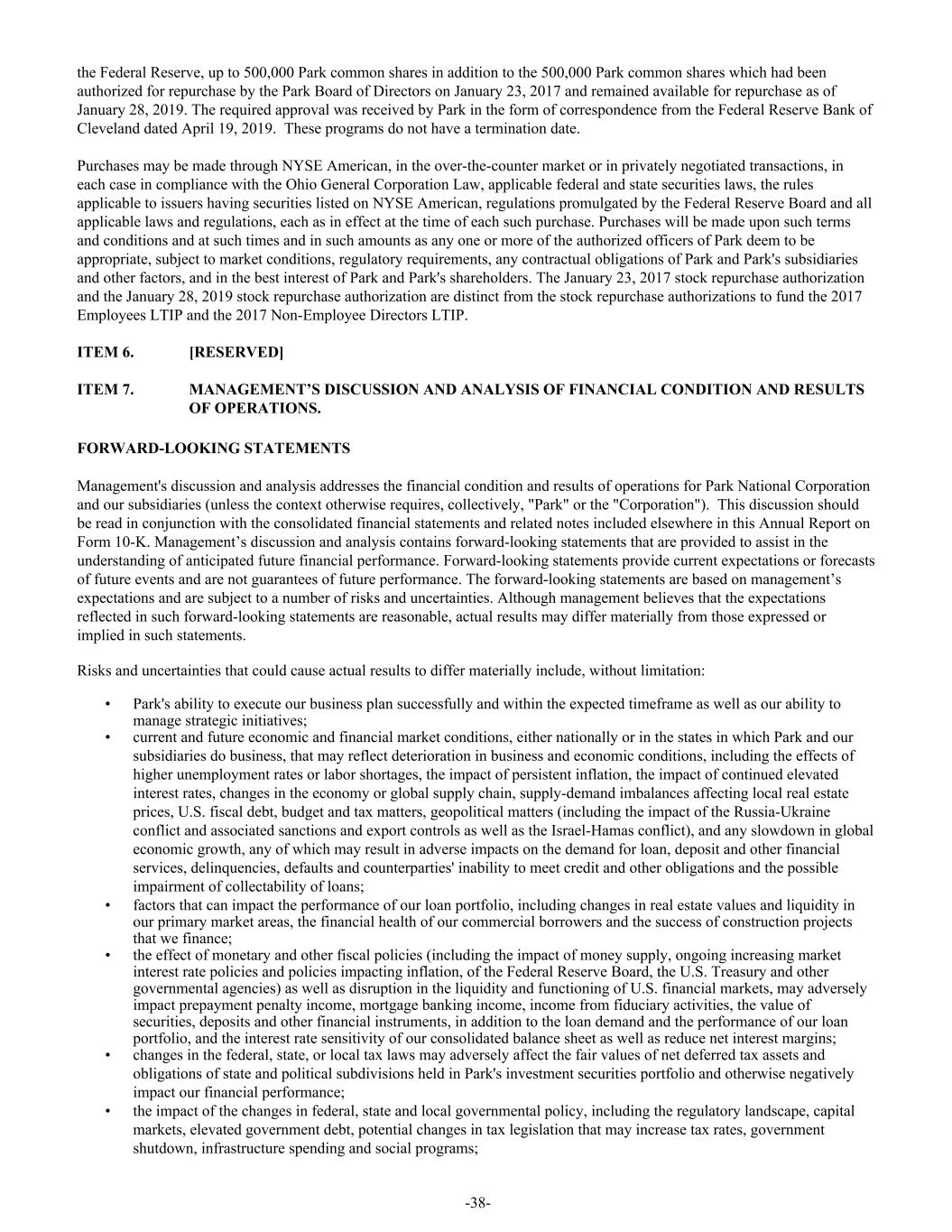 the Federal Reserve, up to 500,000 Park common shares in addition to the 500,000 Park common shares which had been authorized for repurchase by the Park Board of Directors on January 23, 2017 and remained available for repurchase as of January 28, 2019. The required approval was received by Park in the form of correspondence from the Federal Reserve Bank of Cleveland dated April 19, 2019. These programs do not have a termination date. Purchases may be made through NYSE American, in the over-the-counter market or in privately negotiated transactions, in each case in compliance with the Ohio General Corporation Law, applicable federal and state securities laws, the rules applicable to issuers having securities listed on NYSE American, regulations promulgated by the Federal Reserve Board and all applicable laws and regulations, each as in effect at the time of each such purchase. Purchases will be made upon such terms and conditions and at such times and in such amounts as any one or more of the authorized officers of Park deem to be appropriate, subject to market conditions, regulatory requirements, any contractual obligations of Park and Park's subsidiaries and other factors, and in the best interest of Park and Park's shareholders. The January 23, 2017 stock repurchase authorization and the January 28, 2019 stock repurchase authorization are distinct from the stock repurchase authorizations to fund the 2017 Employees LTIP and the 2017 Non-Employee Directors LTIP. ITEM 6. [RESERVED] ITEM 7. MANAGEMENT’S DISCUSSION AND ANALYSIS OF FINANCIAL CONDITION AND RESULTS OF OPERATIONS. FORWARD-LOOKING STATEMENTS Management's discussion and analysis addresses the financial condition and results of operations for Park National Corporation and our subsidiaries (unless the context otherwise requires, collectively, "Park" or the "Corporation"). This discussion should be read in conjunction with the consolidated financial statements and related notes included elsewhere in this Annual Report on Form 10-K. Management’s discussion and analysis contains forward-looking statements that are provided to assist in the understanding of anticipated future financial performance. Forward-looking statements provide current expectations or forecasts of future events and are not guarantees of future performance. The forward-looking statements are based on management’s expectations and are subject to a number of risks and uncertainties. Although management believes that the expectations reflected in such forward-looking statements are reasonable, actual results may differ materially from those expressed or implied in such statements. Risks and uncertainties that could cause actual results to differ materially include, without limitation: • Park's ability to execute our business plan successfully and within the expected timeframe as well as our ability to manage strategic initiatives; • current and future economic and financial market conditions, either nationally or in the states in which Park and our subsidiaries do business, that may reflect deterioration in business and economic conditions, including the effects of higher unemployment rates or labor shortages, the impact of persistent inflation, the impact of continued elevated interest rates, changes in the economy or global supply chain, supply-demand imbalances affecting local real estate prices, U.S. fiscal debt, budget and tax matters, geopolitical matters (including the impact of the Russia-Ukraine conflict and associated sanctions and export controls as well as the Israel-Hamas conflict), and any slowdown in global economic growth, any of which may result in adverse impacts on the demand for loan, deposit and other financial services, delinquencies, defaults and counterparties' inability to meet credit and other obligations and the possible impairment of collectability of loans; • factors that can impact the performance of our loan portfolio, including changes in real estate values and liquidity in our primary market areas, the financial health of our commercial borrowers and the success of construction projects that we finance; • the effect of monetary and other fiscal policies (including the impact of money supply, ongoing increasing market interest rate policies and policies impacting inflation, of the Federal Reserve Board, the U.S. Treasury and other governmental agencies) as well as disruption in the liquidity and functioning of U.S. financial markets, may adversely impact prepayment penalty income, mortgage banking income, income from fiduciary activities, the value of securities, deposits and other financial instruments, in addition to the loan demand and the performance of our loan portfolio, and the interest rate sensitivity of our consolidated balance sheet as well as reduce net interest margins; • changes in the federal, state, or local tax laws may adversely affect the fair values of net deferred tax assets and obligations of state and political subdivisions held in Park's investment securities portfolio and otherwise negatively impact our financial performance; • the impact of the changes in federal, state and local governmental policy, including the regulatory landscape, capital markets, elevated government debt, potential changes in tax legislation that may increase tax rates, government shutdown, infrastructure spending and social programs; -38-