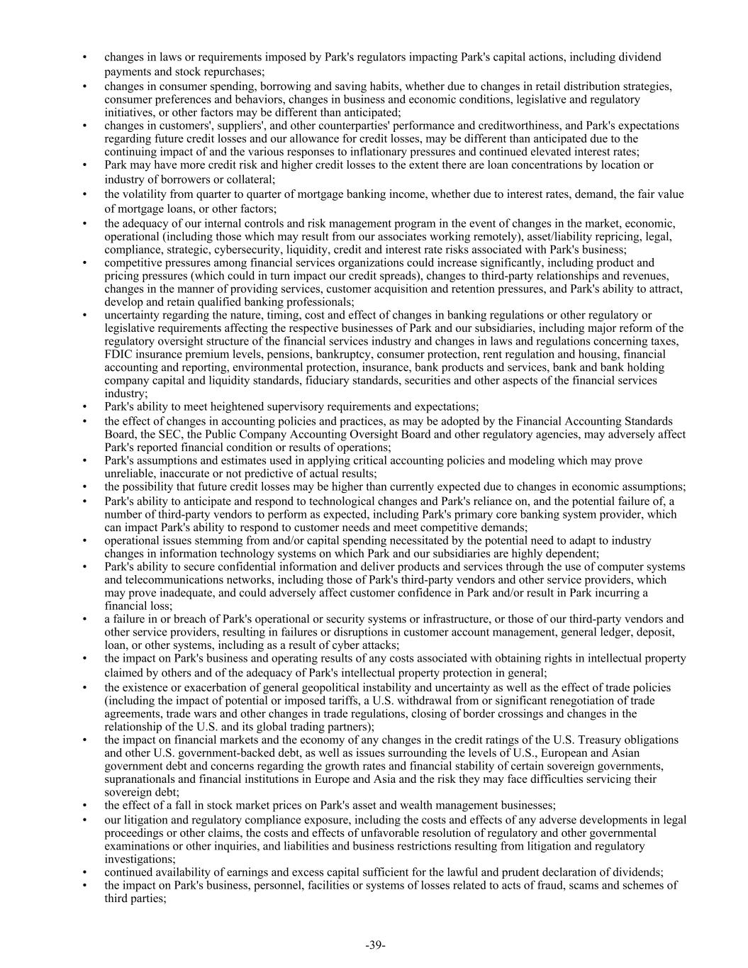 • changes in laws or requirements imposed by Park's regulators impacting Park's capital actions, including dividend payments and stock repurchases; • changes in consumer spending, borrowing and saving habits, whether due to changes in retail distribution strategies, consumer preferences and behaviors, changes in business and economic conditions, legislative and regulatory initiatives, or other factors may be different than anticipated; • changes in customers', suppliers', and other counterparties' performance and creditworthiness, and Park's expectations regarding future credit losses and our allowance for credit losses, may be different than anticipated due to the continuing impact of and the various responses to inflationary pressures and continued elevated interest rates; • Park may have more credit risk and higher credit losses to the extent there are loan concentrations by location or industry of borrowers or collateral; • the volatility from quarter to quarter of mortgage banking income, whether due to interest rates, demand, the fair value of mortgage loans, or other factors; • the adequacy of our internal controls and risk management program in the event of changes in the market, economic, operational (including those which may result from our associates working remotely), asset/liability repricing, legal, compliance, strategic, cybersecurity, liquidity, credit and interest rate risks associated with Park's business; • competitive pressures among financial services organizations could increase significantly, including product and pricing pressures (which could in turn impact our credit spreads), changes to third-party relationships and revenues, changes in the manner of providing services, customer acquisition and retention pressures, and Park's ability to attract, develop and retain qualified banking professionals; • uncertainty regarding the nature, timing, cost and effect of changes in banking regulations or other regulatory or legislative requirements affecting the respective businesses of Park and our subsidiaries, including major reform of the regulatory oversight structure of the financial services industry and changes in laws and regulations concerning taxes, FDIC insurance premium levels, pensions, bankruptcy, consumer protection, rent regulation and housing, financial accounting and reporting, environmental protection, insurance, bank products and services, bank and bank holding company capital and liquidity standards, fiduciary standards, securities and other aspects of the financial services industry; • Park's ability to meet heightened supervisory requirements and expectations; • the effect of changes in accounting policies and practices, as may be adopted by the Financial Accounting Standards Board, the SEC, the Public Company Accounting Oversight Board and other regulatory agencies, may adversely affect Park's reported financial condition or results of operations; • Park's assumptions and estimates used in applying critical accounting policies and modeling which may prove unreliable, inaccurate or not predictive of actual results; • the possibility that future credit losses may be higher than currently expected due to changes in economic assumptions; • Park's ability to anticipate and respond to technological changes and Park's reliance on, and the potential failure of, a number of third-party vendors to perform as expected, including Park's primary core banking system provider, which can impact Park's ability to respond to customer needs and meet competitive demands; • operational issues stemming from and/or capital spending necessitated by the potential need to adapt to industry changes in information technology systems on which Park and our subsidiaries are highly dependent; • Park's ability to secure confidential information and deliver products and services through the use of computer systems and telecommunications networks, including those of Park's third-party vendors and other service providers, which may prove inadequate, and could adversely affect customer confidence in Park and/or result in Park incurring a financial loss; • a failure in or breach of Park's operational or security systems or infrastructure, or those of our third-party vendors and other service providers, resulting in failures or disruptions in customer account management, general ledger, deposit, loan, or other systems, including as a result of cyber attacks; • the impact on Park's business and operating results of any costs associated with obtaining rights in intellectual property claimed by others and of the adequacy of Park's intellectual property protection in general; • the existence or exacerbation of general geopolitical instability and uncertainty as well as the effect of trade policies (including the impact of potential or imposed tariffs, a U.S. withdrawal from or significant renegotiation of trade agreements, trade wars and other changes in trade regulations, closing of border crossings and changes in the relationship of the U.S. and its global trading partners); • the impact on financial markets and the economy of any changes in the credit ratings of the U.S. Treasury obligations and other U.S. government-backed debt, as well as issues surrounding the levels of U.S., European and Asian government debt and concerns regarding the growth rates and financial stability of certain sovereign governments, supranationals and financial institutions in Europe and Asia and the risk they may face difficulties servicing their sovereign debt; • the effect of a fall in stock market prices on Park's asset and wealth management businesses; • our litigation and regulatory compliance exposure, including the costs and effects of any adverse developments in legal proceedings or other claims, the costs and effects of unfavorable resolution of regulatory and other governmental examinations or other inquiries, and liabilities and business restrictions resulti