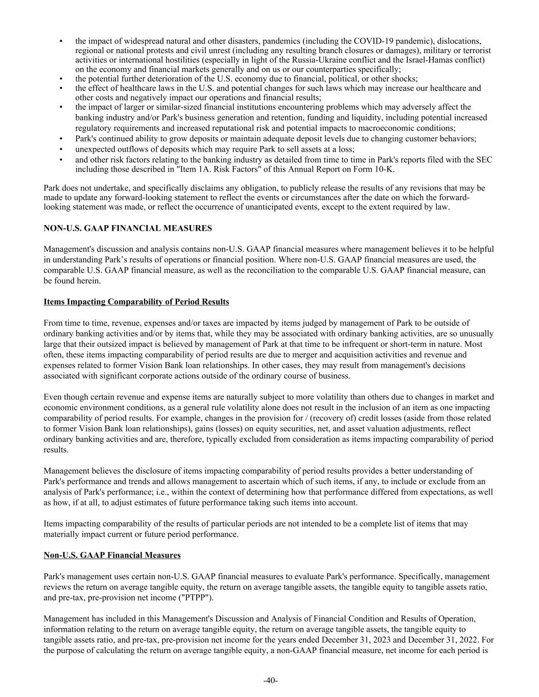 • the impact of widespread natural and other disasters, pandemics (including the COVID-19 pandemic), dislocations, regional or national protests and civil unrest (including any resulting branch closures or damages), military or terrorist activities or international hostilities (especially in light of the Russia-Ukraine conflict and the Israel-Hamas conflict) on the economy and financial markets generally and on us or our counterparties specifically; • the potential further deterioration of the U.S. economy due to financial, political, or other shocks; • the effect of healthcare laws in the U.S. and potential changes for such laws which may increase our healthcare and other costs and negatively impact our operations and financial results; • the impact of larger or similar-sized financial institutions encountering problems which may adversely affect the banking industry and/or Park's business generation and retention, funding and liquidity, including potential increased regulatory requirements and increased reputational risk and potential impacts to macroeconomic conditions; • Park's continued ability to grow deposits or maintain adequate deposit levels due to changing customer behaviors; • unexpected outflows of deposits which may require Park to sell assets at a loss; • and other risk factors relating to the banking industry as detailed from time to time in Park's reports filed with the SEC including those described in "Item 1A. Risk Factors" of this Annual Report on Form 10-K. Park does not undertake, and specifically disclaims any obligation, to publicly release the results of any revisions that may be made to update any forward-looking statement to reflect the events or circumstances after the date on which the forward- looking statement was made, or reflect the occurrence of unanticipated events, except to the extent required by law. NON-U.S. GAAP FINANCIAL MEASURES Management's discussion and analysis contains non-U.S. GAAP financial measures where management believes it to be helpful in understanding Park’s results of operations or financial position. Where non-U.S. GAAP financial measures are used, the comparable U.S. GAAP financial measure, as well as the reconciliation to the comparable U.S. GAAP financial measure, can be found herein. Items Impacting Comparability of Period Results From time to time, revenue, expenses and/or taxes are impacted by items judged by management of Park to be outside of ordinary banking activities and/or by items that, while they may be associated with ordinary banking activities, are so unusually large that their outsized impact is believed by management of Park at that time to be infrequent or short-term in nature. Most often, these items impacting comparability of period results are due to merger and acquisition activities and revenue and expenses related to former Vision Bank loan relationships. In other cases, they may result from management's decisions associated with significant corporate actions outside of the ordinary course of business. Even though certain revenue and expense items are naturally subject to more volatility than others due to changes in market and economic environment conditions, as a general rule volatility alone does not result in the inclusion of an item as one impacting comparability of period results. For example, changes in the provision for / (recovery of) credit losses (aside from those related to former Vision Bank loan relationships), gains (losses) on equity securities, net, and asset valuation adjustments, reflect ordinary banking activities and are, therefore, typically excluded from consideration as items impacting comparability of period results. Management believes the disclosure of items impacting comparability of period results provides a better understanding of Park's performance and trends and allows management to ascertain which of such items, if any, to include or exclude from an analysis of Park's performance; i.e., within the context of determining how that performance differed from expectations, as well as how, if at all, to adjust estimates of future performance taking such items into account. Items impacting comparability of the results of particular periods are not intended to be a complete list of items that may materially impact current or future period performance. Non-U.S. GAAP Financial Measures Park's management uses certain non-U.S. GAAP financial measures to evaluate Park's performance. Specifically, management reviews the return on average tangible equity, the return on average tangible assets, the tangible equity to tangible assets ratio, and pre-tax, pre-provision net income ("PTPP"). Management has included in this Management's Discussion and Analysis of Financial Condition and Results of Operation, information relating to the return on average tangible equity, the return on average tangible assets, the tangible equity to tangible assets ratio, and pre-tax, pre-provision net income for the years ended December 31, 2023 and December 31, 2022. For the purpose of calculating the return on average tangible equity, a non-GAAP financial measure, net income for each period is -40-