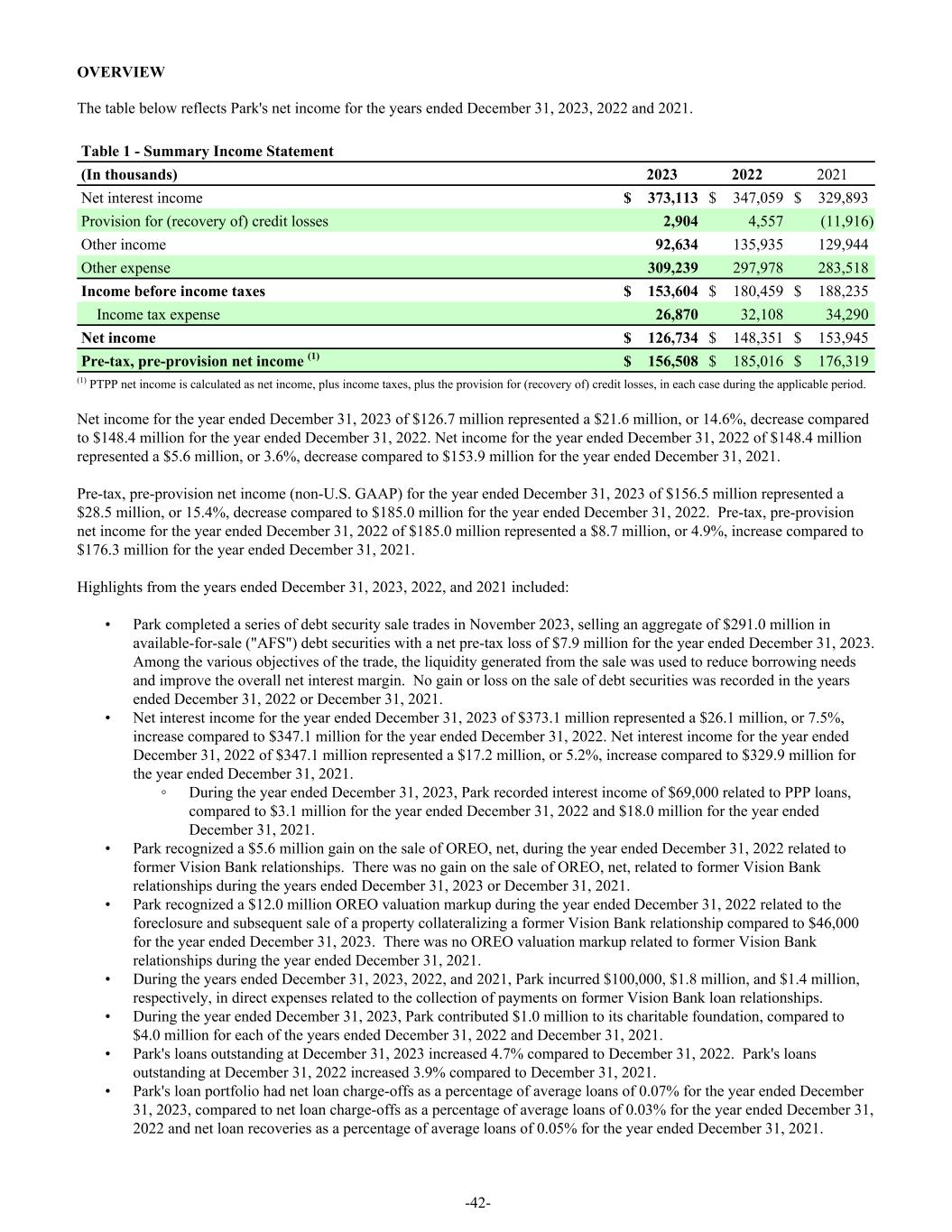 OVERVIEW The table below reflects Park's net income for the years ended December 31, 2023, 2022 and 2021. Table 1 - Summary Income Statement (In thousands) 2023 2022 2021 Net interest income $ 373,113 $ 347,059 $ 329,893 Provision for (recovery of) credit losses 2,904 4,557 (11,916) Other income 92,634 135,935 129,944 Other expense 309,239 297,978 283,518 Income before income taxes $ 153,604 $ 180,459 $ 188,235 Income tax expense 26,870 32,108 34,290 Net income $ 126,734 $ 148,351 $ 153,945 Pre-tax, pre-provision net income (1) $ 156,508 $ 185,016 $ 176,319 (1) PTPP net income is calculated as net income, plus income taxes, plus the provision for (recovery of) credit losses, in each case during the applicable period. Net income for the year ended December 31, 2023 of $126.7 million represented a $21.6 million, or 14.6%, decrease compared to $148.4 million for the year ended December 31, 2022. Net income for the year ended December 31, 2022 of $148.4 million represented a $5.6 million, or 3.6%, decrease compared to $153.9 million for the year ended December 31, 2021. Pre-tax, pre-provision net income (non-U.S. GAAP) for the year ended December 31, 2023 of $156.5 million represented a $28.5 million, or 15.4%, decrease compared to $185.0 million for the year ended December 31, 2022. Pre-tax, pre-provision net income for the year ended December 31, 2022 of $185.0 million represented a $8.7 million, or 4.9%, increase compared to $176.3 million for the year ended December 31, 2021. Highlights from the years ended December 31, 2023, 2022, and 2021 included: • Park completed a series of debt security sale trades in November 2023, selling an aggregate of $291.0 million in available-for-sale ("AFS") debt securities with a net pre-tax loss of $7.9 million for the year ended December 31, 2023. Among the various objectives of the trade, the liquidity generated from the sale was used to reduce borrowing needs and improve the overall net interest margin. No gain or loss on the sale of debt securities was recorded in the years ended December 31, 2022 or December 31, 2021. • Net interest income for the year ended December 31, 2023 of $373.1 million represented a $26.1 million, or 7.5%, increase compared to $347.1 million for the year ended December 31, 2022. Net interest income for the year ended December 31, 2022 of $347.1 million represented a $17.2 million, or 5.2%, increase compared to $329.9 million for the year ended December 31, 2021. ◦ During the year ended December 31, 2023, Park recorded interest income of $69,000 related to PPP loans, compared to $3.1 million for the year ended December 31, 2022 and $18.0 million for the year ended December 31, 2021. • Park recognized a $5.6 million gain on the sale of OREO, net, during the year ended December 31, 2022 related to former Vision Bank relationships. There was no gain on the sale of OREO, net, related to former Vision Bank relationships during the years ended December 31, 2023 or December 31, 2021. • Park recognized a $12.0 million OREO valuation markup during the year ended December 31, 2022 related to the foreclosure and subsequent sale of a property collateralizing a former Vision Bank relationship compared to $46,000 for the year ended December 31, 2023. There was no OREO valuation markup related to former Vision Bank relationships during the year ended December 31, 2021. • During the years ended December 31, 2023, 2022, and 2021, Park incurred $100,000, $1.8 million, and $1.4 million, respectively, in direct expenses related to the collection of payments on former Vision Bank loan relationships. • During the year ended December 31, 2023, Park contributed $1.0 million to its charitable foundation, compared to $4.0 million for each of the years ended December 31, 2022 and December 31, 2021. • Park's loans outstanding at December 31, 2023 increased 4.7% compared to December 31, 2022. Park's loans outstanding at December 31, 2022 increased 3.9% compared to December 31, 2021. • Park's loan portfolio had net loan charge-offs as a percentage of average loans of 0.07% for the year ended December 31, 2023, compared to net loan charge-offs as a percentage of average loans of 0.03% for the year ended December 31, 2022 and net loan recoveries as a percentage of average loans of 0.05% for the year ended December 31, 2021. -42-