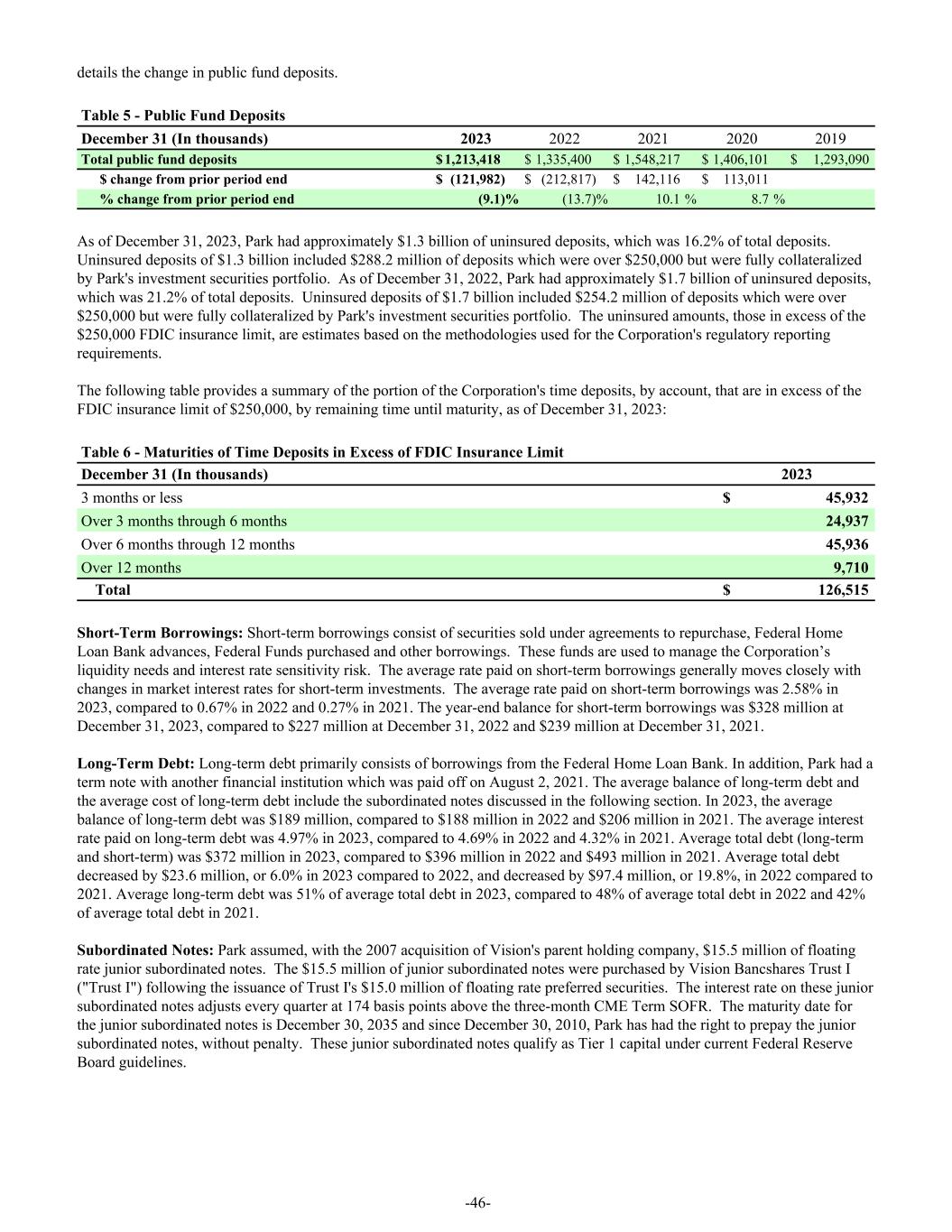 details the change in public fund deposits. Table 5 - Public Fund Deposits December 31 (In thousands) 2023 2022 2021 2020 2019 Total public fund deposits $ 1,213,418 $ 1,335,400 $ 1,548,217 $ 1,406,101 $ 1,293,090 $ change from prior period end $ (121,982) $ (212,817) $ 142,116 $ 113,011 % change from prior period end (9.1) % (13.7) % 10.1 % 8.7 % As of December 31, 2023, Park had approximately $1.3 billion of uninsured deposits, which was 16.2% of total deposits. Uninsured deposits of $1.3 billion included $288.2 million of deposits which were over $250,000 but were fully collateralized by Park's investment securities portfolio. As of December 31, 2022, Park had approximately $1.7 billion of uninsured deposits, which was 21.2% of total deposits. Uninsured deposits of $1.7 billion included $254.2 million of deposits which were over $250,000 but were fully collateralized by Park's investment securities portfolio. The uninsured amounts, those in excess of the $250,000 FDIC insurance limit, are estimates based on the methodologies used for the Corporation's regulatory reporting requirements. The following table provides a summary of the portion of the Corporation's time deposits, by account, that are in excess of the FDIC insurance limit of $250,000, by remaining time until maturity, as of December 31, 2023: Table 6 - Maturities of Time Deposits in Excess of FDIC Insurance Limit December 31 (In thousands) 2023 3 months or less $ 45,932 Over 3 months through 6 months 24,937 Over 6 months through 12 months 45,936 Over 12 months 9,710 Total $ 126,515 Short-Term Borrowings: Short-term borrowings consist of securities sold under agreements to repurchase, Federal Home Loan Bank advances, Federal Funds purchased and other borrowings. These funds are used to manage the Corporation’s liquidity needs and interest rate sensitivity risk. The average rate paid on short-term borrowings generally moves closely with changes in market interest rates for short-term investments. The average rate paid on short-term borrowings was 2.58% in 2023, compared to 0.67% in 2022 and 0.27% in 2021. The year-end balance for short-term borrowings was $328 million at December 31, 2023, compared to $227 million at December 31, 2022 and $239 million at December 31, 2021. Long-Term Debt: Long-term debt primarily consists of borrowings from the Federal Home Loan Bank. In addition, Park had a term note with another financial institution which was paid off on August 2, 2021. The average balance of long-term debt and the average cost of long-term debt include the subordinated notes discussed in the following section. In 2023, the average balance of long-term debt was $189 million, compared to $188 million in 2022 and $206 million in 2021. The average interest rate paid on long-term debt was 4.97% in 2023, compared to 4.69% in 2022 and 4.32% in 2021. Average total debt (long-term and short-term) was $372 million in 2023, compared to $396 million in 2022 and $493 million in 2021. Average total debt decreased by $23.6 million, or 6.0% in 2023 compared to 2022, and decreased by $97.4 million, or 19.8%, in 2022 compared to 2021. Average long-term debt was 51% of average total debt in 2023, compared to 48% of average total debt in 2022 and 42% of average total debt in 2021. Subordinated Notes: Park assumed, with the 2007 acquisition of Vision's parent holding company, $15.5 million of floating rate junior subordinated notes. The $15.5 million of junior subordinated notes were purchased by Vision Bancshares Trust I ("Trust I") following the issuance of Trust I's $15.0 million of floating rate preferred securities. The interest rate on these junior subordinated notes adjusts every quarter at 174 basis points above the three-month CME Term SOFR. The maturity date for the junior subordinated notes is December 30, 2035 and since December 30, 2010, Park has had the right to prepay the junior subordinated notes, without penalty. These junior subordinated notes qualify as Tier 1 capital under current Federal Reserve Board guidelines. -46-