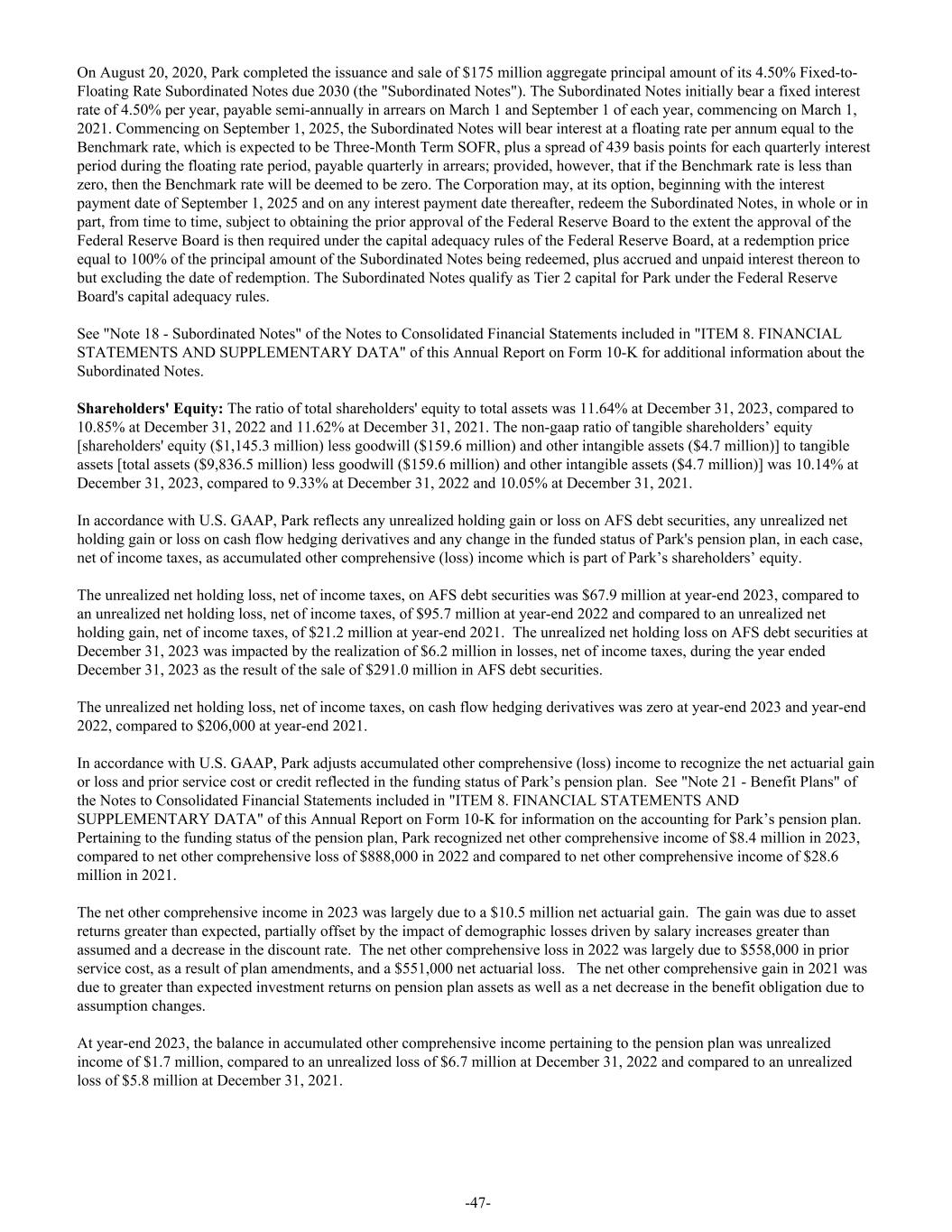 On August 20, 2020, Park completed the issuance and sale of $175 million aggregate principal amount of its 4.50% Fixed-to- Floating Rate Subordinated Notes due 2030 (the "Subordinated Notes"). The Subordinated Notes initially bear a fixed interest rate of 4.50% per year, payable semi-annually in arrears on March 1 and September 1 of each year, commencing on March 1, 2021. Commencing on September 1, 2025, the Subordinated Notes will bear interest at a floating rate per annum equal to the Benchmark rate, which is expected to be Three-Month Term SOFR, plus a spread of 439 basis points for each quarterly interest period during the floating rate period, payable quarterly in arrears; provided, however, that if the Benchmark rate is less than zero, then the Benchmark rate will be deemed to be zero. The Corporation may, at its option, beginning with the interest payment date of September 1, 2025 and on any interest payment date thereafter, redeem the Subordinated Notes, in whole or in part, from time to time, subject to obtaining the prior approval of the Federal Reserve Board to the extent the approval of the Federal Reserve Board is then required under the capital adequacy rules of the Federal Reserve Board, at a redemption price equal to 100% of the principal amount of the Subordinated Notes being redeemed, plus accrued and unpaid interest thereon to but excluding the date of redemption. The Subordinated Notes qualify as Tier 2 capital for Park under the Federal Reserve Board's capital adequacy rules. See "Note 18 - Subordinated Notes" of the Notes to Consolidated Financial Statements included in "ITEM 8. FINANCIAL STATEMENTS AND SUPPLEMENTARY DATA" of this Annual Report on Form 10-K for additional information about the Subordinated Notes. Shareholders' Equity: The ratio of total shareholders' equity to total assets was 11.64% at December 31, 2023, compared to 10.85% at December 31, 2022 and 11.62% at December 31, 2021. The non-gaap ratio of tangible shareholders’ equity [shareholders' equity ($1,145.3 million) less goodwill ($159.6 million) and other intangible assets ($4.7 million)] to tangible assets [total assets ($9,836.5 million) less goodwill ($159.6 million) and other intangible assets ($4.7 million)] was 10.14% at December 31, 2023, compared to 9.33% at December 31, 2022 and 10.05% at December 31, 2021. In accordance with U.S. GAAP, Park reflects any unrealized holding gain or loss on AFS debt securities, any unrealized net holding gain or loss on cash flow hedging derivatives and any change in the funded status of Park's pension plan, in each case, net of income taxes, as accumulated other comprehensive (loss) income which is part of Park’s shareholders’ equity. The unrealized net holding loss, net of income taxes, on AFS debt securities was $67.9 million at year-end 2023, compared to an unrealized net holding loss, net of income taxes, of $95.7 million at year-end 2022 and compared to an unrealized net holding gain, net of income taxes, of $21.2 million at year-end 2021. The unrealized net holding loss on AFS debt securities at December 31, 2023 was impacted by the realization of $6.2 million in losses, net of income taxes, during the year ended December 31, 2023 as the result of the sale of $291.0 million in AFS debt securities. The unrealized net holding loss, net of income taxes, on cash flow hedging derivatives was zero at year-end 2023 and year-end 2022, compared to $206,000 at year-end 2021. In accordance with U.S. GAAP, Park adjusts accumulated other comprehensive (loss) income to recognize the net actuarial gain or loss and prior service cost or credit reflected in the funding status of Park’s pension plan. See "Note 21 - Benefit Plans" of the Notes to Consolidated Financial Statements included in "ITEM 8. FINANCIAL STATEMENTS AND SUPPLEMENTARY DATA" of this Annual Report on Form 10-K for information on the accounting for Park’s pension plan. Pertaining to the funding status of the pension plan, Park recognized net other comprehensive income of $8.4 million in 2023, compared to net other comprehensive loss of $888,000 in 2022 and compared to net other comprehensive income of $28.6 million in 2021. The net other comprehensive income in 2023 was largely due to a $10.5 million net actuarial gain. The gain was due to asset returns greater than expected, partially offset by the impact of demographic losses driven by salary increases greater than assumed and a decrease in the discount rate. The net other comprehensive loss in 2022 was largely due to $558,000 in prior service cost, as a result of plan amendments, and a $551,000 net actuarial loss. The net other comprehensive gain in 2021 was due to greater than expected investment returns on pension plan assets as well as a net decrease in the benefit obligation due to assumption changes. At year-end 2023, the balance in accumulated other comprehensive income pertaining to the pension plan was unrealized income of $1.7 million, compared to an unrealized loss of $6.7 million at December 31, 2022 and compared to an unrealized loss of $5.8 million at December 31, 2021. -47-