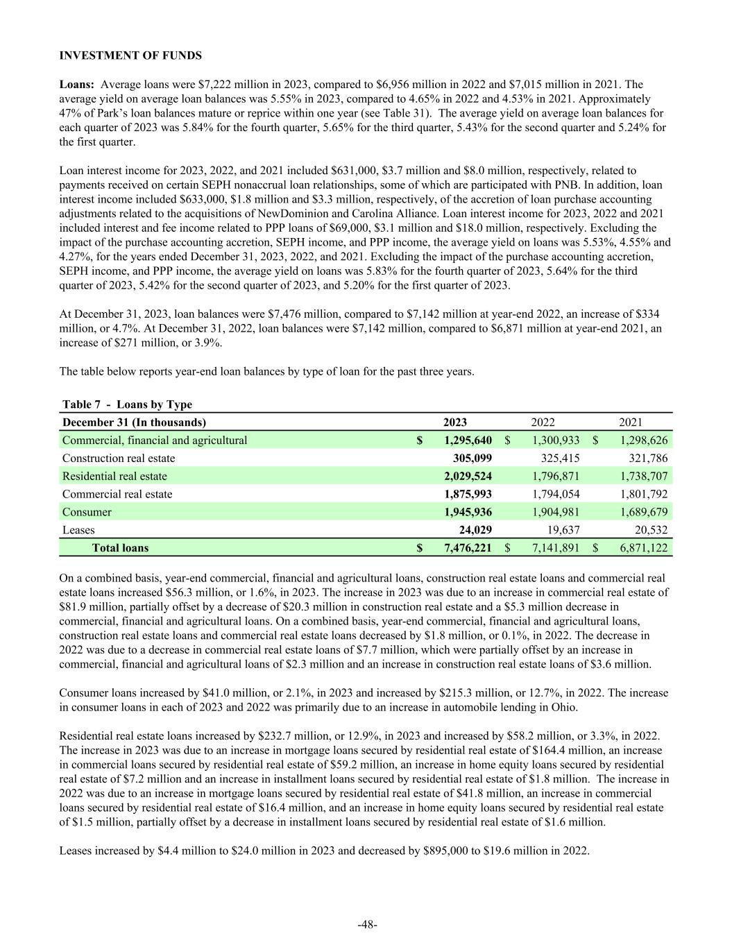 INVESTMENT OF FUNDS Loans: Average loans were $7,222 million in 2023, compared to $6,956 million in 2022 and $7,015 million in 2021. The average yield on average loan balances was 5.55% in 2023, compared to 4.65% in 2022 and 4.53% in 2021. Approximately 47% of Park’s loan balances mature or reprice within one year (see Table 31). The average yield on average loan balances for each quarter of 2023 was 5.84% for the fourth quarter, 5.65% for the third quarter, 5.43% for the second quarter and 5.24% for the first quarter. Loan interest income for 2023, 2022, and 2021 included $631,000, $3.7 million and $8.0 million, respectively, related to payments received on certain SEPH nonaccrual loan relationships, some of which are participated with PNB. In addition, loan interest income included $633,000, $1.8 million and $3.3 million, respectively, of the accretion of loan purchase accounting adjustments related to the acquisitions of NewDominion and Carolina Alliance. Loan interest income for 2023, 2022 and 2021 included interest and fee income related to PPP loans of $69,000, $3.1 million and $18.0 million, respectively. Excluding the impact of the purchase accounting accretion, SEPH income, and PPP income, the average yield on loans was 5.53%, 4.55% and 4.27%, for the years ended December 31, 2023, 2022, and 2021. Excluding the impact of the purchase accounting accretion, SEPH income, and PPP income, the average yield on loans was 5.83% for the fourth quarter of 2023, 5.64% for the third quarter of 2023, 5.42% for the second quarter of 2023, and 5.20% for the first quarter of 2023. At December 31, 2023, loan balances were $7,476 million, compared to $7,142 million at year-end 2022, an increase of $334 million, or 4.7%. At December 31, 2022, loan balances were $7,142 million, compared to $6,871 million at year-end 2021, an increase of $271 million, or 3.9%. The table below reports year-end loan balances by type of loan for the past three years. Table 7 - Loans by Type December 31 (In thousands) 2023 2022 2021 Commercial, financial and agricultural $ 1,295,640 $ 1,300,933 $ 1,298,626 Construction real estate 305,099 325,415 321,786 Residential real estate 2,029,524 1,796,871 1,738,707 Commercial real estate 1,875,993 1,794,054 1,801,792 Consumer 1,945,936 1,904,981 1,689,679 Leases 24,029 19,637 20,532 Total loans $ 7,476,221 $ 7,141,891 $ 6,871,122 On a combined basis, year-end commercial, financial and agricultural loans, construction real estate loans and commercial real estate loans increased $56.3 million, or 1.6%, in 2023. The increase in 2023 was due to an increase in commercial real estate of $81.9 million, partially offset by a decrease of $20.3 million in construction real estate and a $5.3 million decrease in commercial, financial and agricultural loans. On a combined basis, year-end commercial, financial and agricultural loans, construction real estate loans and commercial real estate loans decreased by $1.8 million, or 0.1%, in 2022. The decrease in 2022 was due to a decrease in commercial real estate loans of $7.7 million, which were partially offset by an increase in commercial, financial and agricultural loans of $2.3 million and an increase in construction real estate loans of $3.6 million. Consumer loans increased by $41.0 million, or 2.1%, in 2023 and increased by $215.3 million, or 12.7%, in 2022. The increase in consumer loans in each of 2023 and 2022 was primarily due to an increase in automobile lending in Ohio. Residential real estate loans increased by $232.7 million, or 12.9%, in 2023 and increased by $58.2 million, or 3.3%, in 2022. The increase in 2023 was due to an increase in mortgage loans secured by residential real estate of $164.4 million, an increase in commercial loans secured by residential real estate of $59.2 million, an increase in home equity loans secured by residential real estate of $7.2 million and an increase in installment loans secured by residential real estate of $1.8 million. The increase in 2022 was due to an increase in mortgage loans secured by residential real estate of $41.8 million, an increase in commercial loans secured by residential real estate of $16.4 million, and an increase in home equity loans secured by residential real estate of $1.5 million, partially offset by a decrease in installment loans secured by residential real estate of $1.6 million. Leases increased by $4.4 million to $24.0 million in 2023 and decreased by $895,000 to $19.6 million in 2022. -48-