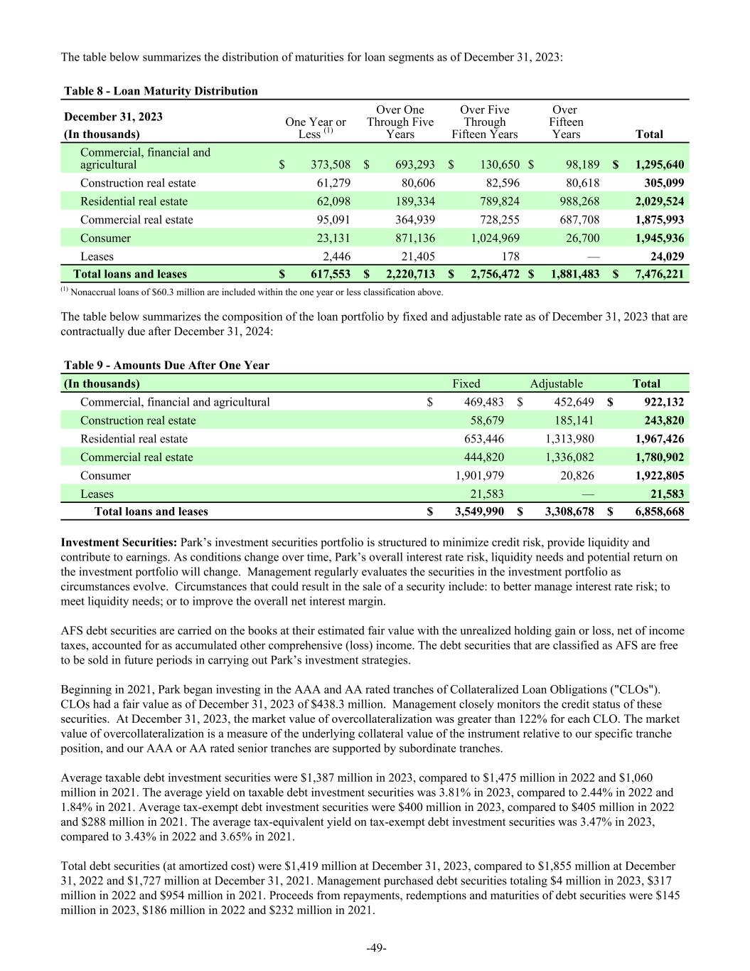 The table below summarizes the distribution of maturities for loan segments as of December 31, 2023: Table 8 - Loan Maturity Distribution One Year or Less (1) Over One Through Five Years Over Five Through Fifteen Years Over Fifteen Years Total December 31, 2023 (In thousands) Commercial, financial and agricultural $ 373,508 $ 693,293 $ 130,650 $ 98,189 $ 1,295,640 Construction real estate 61,279 80,606 82,596 80,618 305,099 Residential real estate 62,098 189,334 789,824 988,268 2,029,524 Commercial real estate 95,091 364,939 728,255 687,708 1,875,993 Consumer 23,131 871,136 1,024,969 26,700 1,945,936 Leases 2,446 21,405 178 — 24,029 Total loans and leases $ 617,553 $ 2,220,713 $ 2,756,472 $ 1,881,483 $ 7,476,221 (1) Nonaccrual loans of $60.3 million are included within the one year or less classification above. The table below summarizes the composition of the loan portfolio by fixed and adjustable rate as of December 31, 2023 that are contractually due after December 31, 2024: Table 9 - Amounts Due After One Year (In thousands) Fixed Adjustable Total Commercial, financial and agricultural $ 469,483 $ 452,649 $ 922,132 Construction real estate 58,679 185,141 243,820 Residential real estate 653,446 1,313,980 1,967,426 Commercial real estate 444,820 1,336,082 1,780,902 Consumer 1,901,979 20,826 1,922,805 Leases 21,583 — 21,583 Total loans and leases $ 3,549,990 $ 3,308,678 $ 6,858,668 Investment Securities: Park’s investment securities portfolio is structured to minimize credit risk, provide liquidity and contribute to earnings. As conditions change over time, Park’s overall interest rate risk, liquidity needs and potential return on the investment portfolio will change. Management regularly evaluates the securities in the investment portfolio as circumstances evolve. Circumstances that could result in the sale of a security include: to better manage interest rate risk; to meet liquidity needs; or to improve the overall net interest margin. AFS debt securities are carried on the books at their estimated fair value with the unrealized holding gain or loss, net of income taxes, accounted for as accumulated other comprehensive (loss) income. The debt securities that are classified as AFS are free to be sold in future periods in carrying out Park’s investment strategies. Beginning in 2021, Park began investing in the AAA and AA rated tranches of Collateralized Loan Obligations ("CLOs"). CLOs had a fair value as of December 31, 2023 of $438.3 million. Management closely monitors the credit status of these securities. At December 31, 2023, the market value of overcollateralization was greater than 122% for each CLO. The market value of overcollateralization is a measure of the underlying collateral value of the instrument relative to our specific tranche position, and our AAA or AA rated senior tranches are supported by subordinate tranches. Average taxable debt investment securities were $1,387 million in 2023, compared to $1,475 million in 2022 and $1,060 million in 2021. The average yield on taxable debt investment securities was 3.81% in 2023, compared to 2.44% in 2022 and 1.84% in 2021. Average tax-exempt debt investment securities were $400 million in 2023, compared to $405 million in 2022 and $288 million in 2021. The average tax-equivalent yield on tax-exempt debt investment securities was 3.47% in 2023, compared to 3.43% in 2022 and 3.65% in 2021. Total debt securities (at amortized cost) were $1,419 million at December 31, 2023, compared to $1,855 million at December 31, 2022 and $1,727 million at December 31, 2021. Management purchased debt securities totaling $4 million in 2023, $317 million in 2022 and $954 million in 2021. Proceeds from repayments, redemptions and maturities of debt securities were $145 million in 2023, $186 million in 2022 and $232 million in 2021. -49-