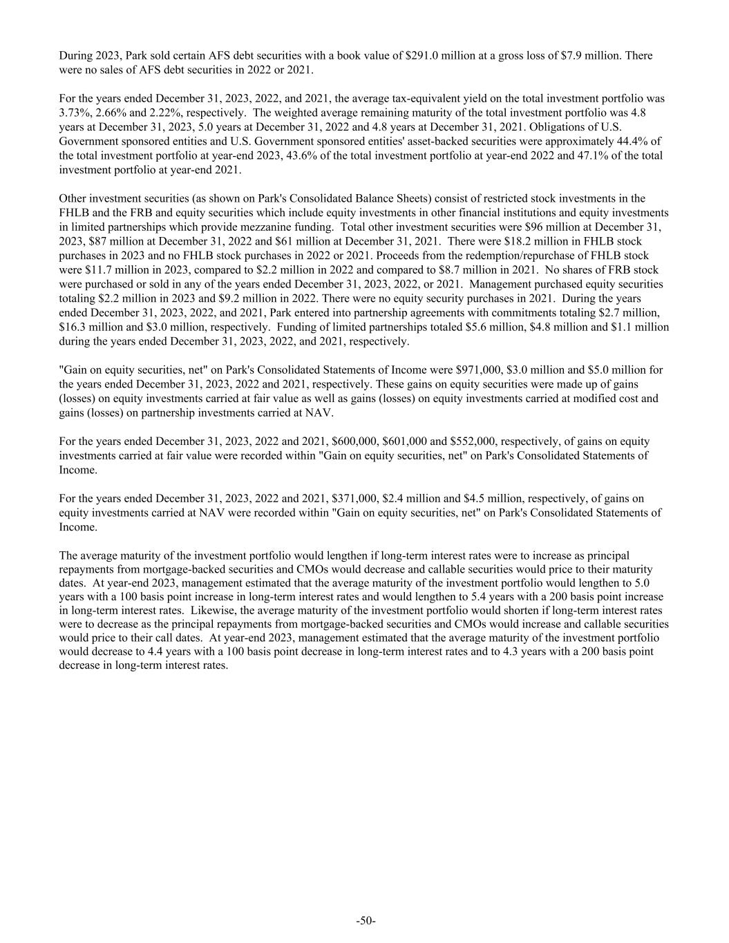 During 2023, Park sold certain AFS debt securities with a book value of $291.0 million at a gross loss of $7.9 million. There were no sales of AFS debt securities in 2022 or 2021. For the years ended December 31, 2023, 2022, and 2021, the average tax-equivalent yield on the total investment portfolio was 3.73%, 2.66% and 2.22%, respectively. The weighted average remaining maturity of the total investment portfolio was 4.8 years at December 31, 2023, 5.0 years at December 31, 2022 and 4.8 years at December 31, 2021. Obligations of U.S. Government sponsored entities and U.S. Government sponsored entities' asset-backed securities were approximately 44.4% of the total investment portfolio at year-end 2023, 43.6% of the total investment portfolio at year-end 2022 and 47.1% of the total investment portfolio at year-end 2021. Other investment securities (as shown on Park's Consolidated Balance Sheets) consist of restricted stock investments in the FHLB and the FRB and equity securities which include equity investments in other financial institutions and equity investments in limited partnerships which provide mezzanine funding. Total other investment securities were $96 million at December 31, 2023, $87 million at December 31, 2022 and $61 million at December 31, 2021. There were $18.2 million in FHLB stock purchases in 2023 and no FHLB stock purchases in 2022 or 2021. Proceeds from the redemption/repurchase of FHLB stock were $11.7 million in 2023, compared to $2.2 million in 2022 and compared to $8.7 million in 2021. No shares of FRB stock were purchased or sold in any of the years ended December 31, 2023, 2022, or 2021. Management purchased equity securities totaling $2.2 million in 2023 and $9.2 million in 2022. There were no equity security purchases in 2021. During the years ended December 31, 2023, 2022, and 2021, Park entered into partnership agreements with commitments totaling $2.7 million, $16.3 million and $3.0 million, respectively. Funding of limited partnerships totaled $5.6 million, $4.8 million and $1.1 million during the years ended December 31, 2023, 2022, and 2021, respectively. "Gain on equity securities, net" on Park's Consolidated Statements of Income were $971,000, $3.0 million and $5.0 million for the years ended December 31, 2023, 2022 and 2021, respectively. These gains on equity securities were made up of gains (losses) on equity investments carried at fair value as well as gains (losses) on equity investments carried at modified cost and gains (losses) on partnership investments carried at NAV. For the years ended December 31, 2023, 2022 and 2021, $600,000, $601,000 and $552,000, respectively, of gains on equity investments carried at fair value were recorded within "Gain on equity securities, net" on Park's Consolidated Statements of Income. For the years ended December 31, 2023, 2022 and 2021, $371,000, $2.4 million and $4.5 million, respectively, of gains on equity investments carried at NAV were recorded within "Gain on equity securities, net" on Park's Consolidated Statements of Income. The average maturity of the investment portfolio would lengthen if long-term interest rates were to increase as principal repayments from mortgage-backed securities and CMOs would decrease and callable securities would price to their maturity dates. At year-end 2023, management estimated that the average maturity of the investment portfolio would lengthen to 5.0 years with a 100 basis point increase in long-term interest rates and would lengthen to 5.4 years with a 200 basis point increase in long-term interest rates. Likewise, the average maturity of the investment portfolio would shorten if long-term interest rates were to decrease as the principal repayments from mortgage-backed securities and CMOs would increase and callable securities would price to their call dates. At year-end 2023, management estimated that the average maturity of the investment portfolio would decrease to 4.4 years with a 100 basis point decrease in long-term interest rates and to 4.3 years with a 200 basis point decrease in long-term interest rates. -50-