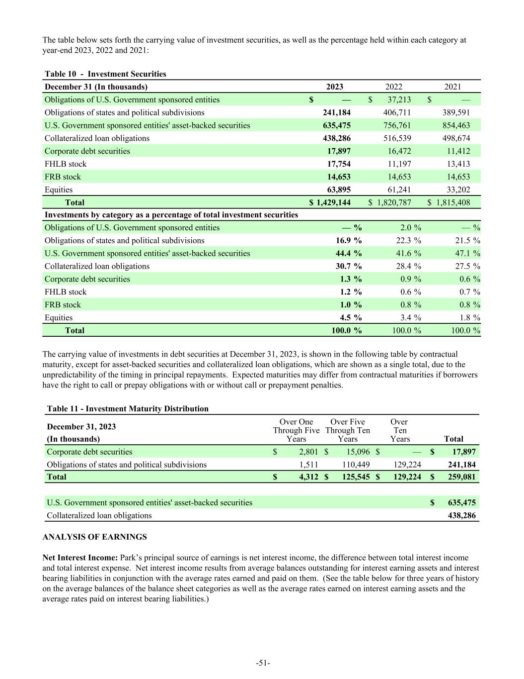 The table below sets forth the carrying value of investment securities, as well as the percentage held within each category at year-end 2023, 2022 and 2021: Table 10 - Investment Securities December 31 (In thousands) 2023 2022 2021 Obligations of U.S. Government sponsored entities $ — $ 37,213 $ — Obligations of states and political subdivisions 241,184 406,711 389,591 U.S. Government sponsored entities' asset-backed securities 635,475 756,761 854,463 Collateralized loan obligations 438,286 516,539 498,674 Corporate debt securities 17,897 16,472 11,412 FHLB stock 17,754 11,197 13,413 FRB stock 14,653 14,653 14,653 Equities 63,895 61,241 33,202 Total $ 1,429,144 $ 1,820,787 $ 1,815,408 Investments by category as a percentage of total investment securities Obligations of U.S. Government sponsored entities — % 2.0 % — % Obligations of states and political subdivisions 16.9 % 22.3 % 21.5 % U.S. Government sponsored entities' asset-backed securities 44.4 % 41.6 % 47.1 % Collateralized loan obligations 30.7 % 28.4 % 27.5 % Corporate debt securities 1.3 % 0.9 % 0.6 % FHLB stock 1.2 % 0.6 % 0.7 % FRB stock 1.0 % 0.8 % 0.8 % Equities 4.5 % 3.4 % 1.8 % Total 100.0 % 100.0 % 100.0 % The carrying value of investments in debt securities at December 31, 2023, is shown in the following table by contractual maturity, except for asset-backed securities and collateralized loan obligations, which are shown as a single total, due to the unpredictability of the timing in principal repayments. Expected maturities may differ from contractual maturities if borrowers have the right to call or prepay obligations with or without call or prepayment penalties. Table 11 - Investment Maturity Distribution Over One Through Five Years Over Five Through Ten Years Over Ten Years Total December 31, 2023 (In thousands) Corporate debt securities $ 2,801 $ 15,096 $ — $ 17,897 Obligations of states and political subdivisions 1,511 110,449 129,224 241,184 Total $ 4,312 $ 125,545 $ 129,224 $ 259,081 U.S. Government sponsored entities' asset-backed securities $ 635,475 Collateralized loan obligations 438,286 ANALYSIS OF EARNINGS Net Interest Income: Park’s principal source of earnings is net interest income, the difference between total interest income and total interest expense. Net interest income results from average balances outstanding for interest earning assets and interest bearing liabilities in conjunction with the average rates earned and paid on them. (See the table below for three years of history on the average balances of the balance sheet categories as well as the average rates earned on interest earning assets and the average rates paid on interest bearing liabilities.) -51-