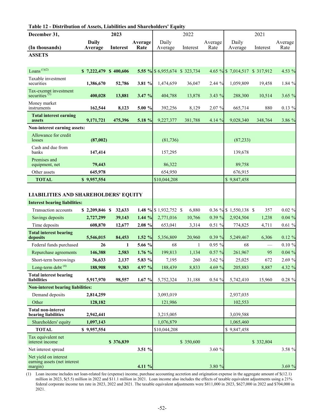 ASSETS Loans (1)(2) $ 7,222,479 $ 400,606 5.55 % $ 6,955,674 $ 323,734 4.65 % $ 7,014,517 $ 317,912 4.53 % Taxable investment securities 1,386,670 52,786 3.81 % 1,474,659 36,047 2.44 % 1,059,809 19,458 1.84 % Tax-exempt investment securities (3) 400,028 13,881 3.47 % 404,788 13,878 3.43 % 288,300 10,514 3.65 % Money market instruments 162,544 8,123 5.00 % 392,256 8,129 2.07 % 665,714 880 0.13 % Total interest earning assets 9,171,721 475,396 5.18 % 9,227,377 381,788 4.14 % 9,028,340 348,764 3.86 % Non-interest earning assets: Allowance for credit losses (87,002) (81,736) (87,233) Cash and due from banks 147,414 157,295 139,678 Premises and equipment, net 79,443 86,322 89,758 Other assets 645,978 654,950 676,915 TOTAL $ 9,957,554 $ 10,044,208 $ 9,847,458 LIABILITIES AND SHAREHOLDERS' EQUITY Interest bearing liabilities: Transaction accounts $ 2,209,846 $ 32,633 1.48 % $ 1,932,752 $ 6,880 0.36 % $ 1,550,138 $ 357 0.02 % Savings deposits 2,727,299 39,143 1.44 % 2,771,016 10,766 0.39 % 2,924,504 1,238 0.04 % Time deposits 608,870 12,677 2.08 % 653,041 3,314 0.51 % 774,825 4,711 0.61 % Total interest bearing deposits 5,546,015 84,453 1.52 % 5,356,809 20,960 0.39 % 5,249,467 6,306 0.12 % Federal funds purchased 26 1 5.66 % 68 1 0.95 % 68 — 0.10 % Repurchase agreements 146,388 2,583 1.76 % 199,813 1,134 0.57 % 261,967 95 0.04 % Short-term borrowings 36,633 2,137 5.83 % 7,195 260 3.62 % 25,025 672 2.69 % Long-term debt (4) 188,908 9,383 4.97 % 188,439 8,833 4.69 % 205,883 8,887 4.32 % Total interest bearing liabilities 5,917,970 98,557 1.67 % 5,752,324 31,188 0.54 % 5,742,410 15,960 0.28 % Non-interest bearing liabilities: Demand deposits 2,814,259 3,093,019 2,937,035 Other 128,182 121,986 102,553 Total non-interest bearing liabilities 2,942,441 3,215,005 3,039,588 Shareholders' equity 1,097,143 1,076,879 1,065,460 TOTAL $ 9,957,554 $ 10,044,208 $ 9,847,458 Tax equivalent net interest income $ 376,839 $ 350,600 $ 332,804 Net interest spread 3.51 % 3.60 % 3.58 % Net yield on interest earning assets (net interest margin) 4.11 % 3.80 % 3.69 % Table 12 - Distribution of Assets, Liabilities and Shareholders' Equity December 31, 2023 2022 2021 (In thousands) Daily Average Interest Average Rate Daily Average Interest Average Rate Daily Average Interest Average Rate (1) Loan income includes net loan-related fee (expense) income, purchase accounting accretion and origination expense in the aggregate amount of $(12.1) million in 2023, $(5.5) million in 2022 and $11.1 million in 2021. Loan income also includes the effects of taxable equivalent adjustments using a 21% federal corporate income tax rate in 2023, 2022 and 2021. The taxable equivalent adjustments were $811,000 in 2023, $627,000 in 2022 and $704,000 in 2021. -52-
