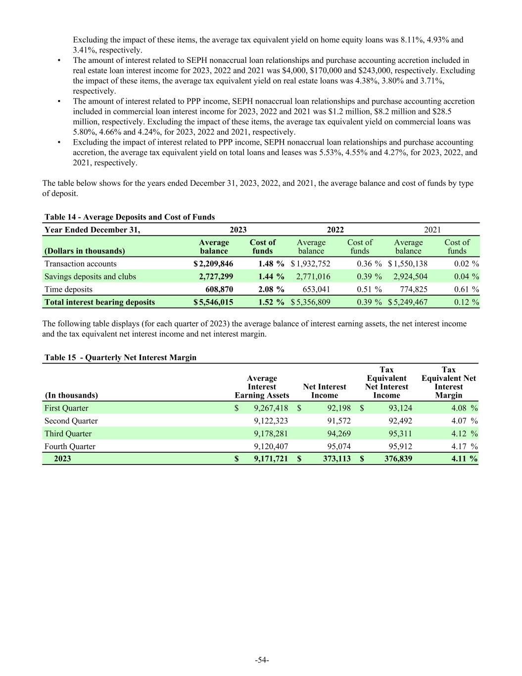 Excluding the impact of these items, the average tax equivalent yield on home equity loans was 8.11%, 4.93% and 3.41%, respectively. • The amount of interest related to SEPH nonaccrual loan relationships and purchase accounting accretion included in real estate loan interest income for 2023, 2022 and 2021 was $4,000, $170,000 and $243,000, respectively. Excluding the impact of these items, the average tax equivalent yield on real estate loans was 4.38%, 3.80% and 3.71%, respectively. • The amount of interest related to PPP income, SEPH nonaccrual loan relationships and purchase accounting accretion included in commercial loan interest income for 2023, 2022 and 2021 was $1.2 million, $8.2 million and $28.5 million, respectively. Excluding the impact of these items, the average tax equivalent yield on commercial loans was 5.80%, 4.66% and 4.24%, for 2023, 2022 and 2021, respectively. • Excluding the impact of interest related to PPP income, SEPH nonaccrual loan relationships and purchase accounting accretion, the average tax equivalent yield on total loans and leases was 5.53%, 4.55% and 4.27%, for 2023, 2022, and 2021, respectively. The table below shows for the years ended December 31, 2023, 2022, and 2021, the average balance and cost of funds by type of deposit. Table 14 - Average Deposits and Cost of Funds Year Ended December 31, 2023 2022 2021 (Dollars in thousands) Average balance Cost of funds Average balance Cost of funds Average balance Cost of funds Transaction accounts $ 2,209,846 1.48 % $ 1,932,752 0.36 % $ 1,550,138 0.02 % Savings deposits and clubs 2,727,299 1.44 % 2,771,016 0.39 % 2,924,504 0.04 % Time deposits 608,870 2.08 % 653,041 0.51 % 774,825 0.61 % Total interest bearing deposits $ 5,546,015 1.52 % $ 5,356,809 0.39 % $ 5,249,467 0.12 % The following table displays (for each quarter of 2023) the average balance of interest earning assets, the net interest income and the tax equivalent net interest income and net interest margin. Table 15 - Quarterly Net Interest Margin (In thousands) Average Interest Earning Assets Net Interest Income Tax Equivalent Net Interest Income Tax Equivalent Net Interest Margin First Quarter $ 9,267,418 $ 92,198 $ 93,124 4.08 % Second Quarter 9,122,323 91,572 92,492 4.07 % Third Quarter 9,178,281 94,269 95,311 4.12 % Fourth Quarter 9,120,407 95,074 95,912 4.17 % 2023 $ 9,171,721 $ 373,113 $ 376,839 4.11 % -54-