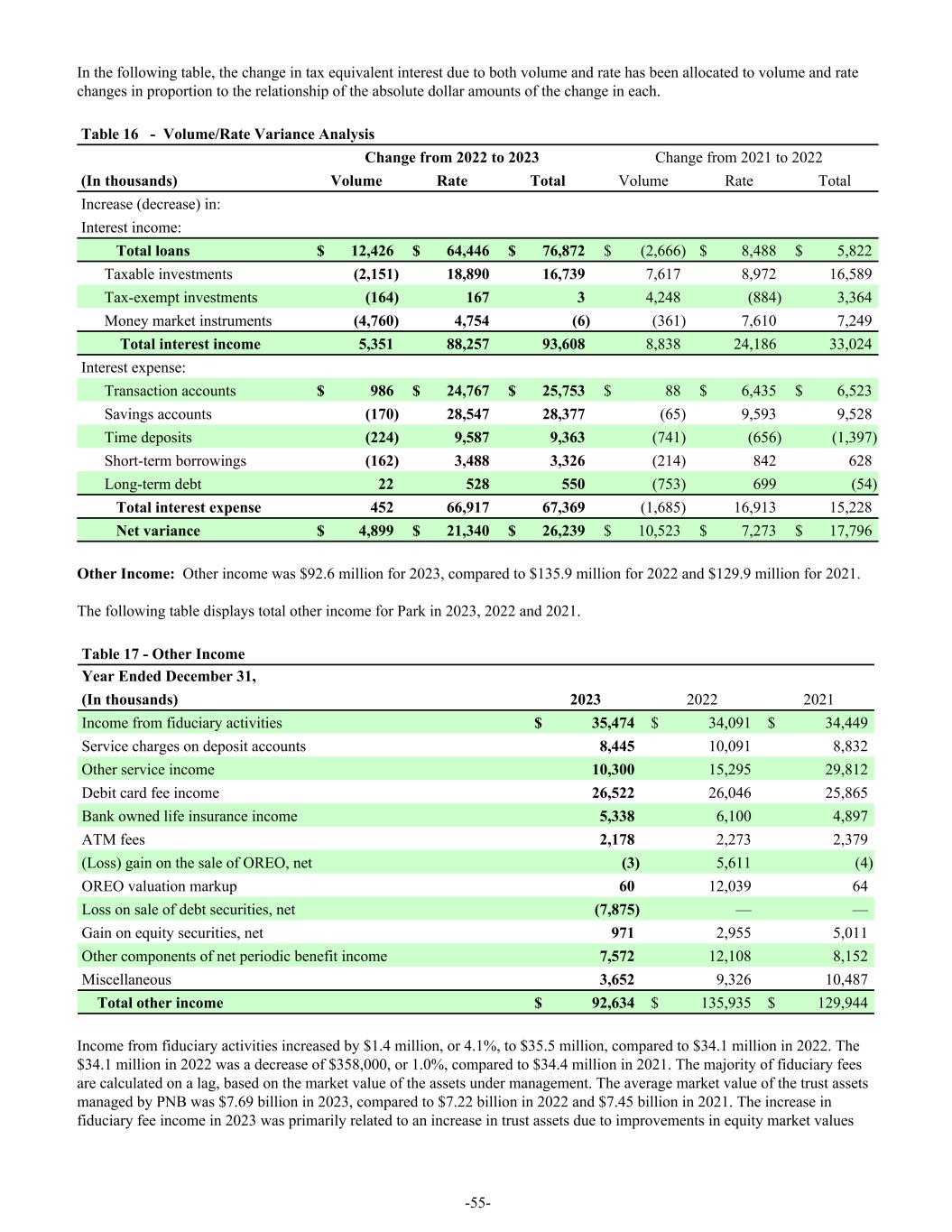 In the following table, the change in tax equivalent interest due to both volume and rate has been allocated to volume and rate changes in proportion to the relationship of the absolute dollar amounts of the change in each. Table 16 - Volume/Rate Variance Analysis Change from 2022 to 2023 Change from 2021 to 2022 (In thousands) Volume Rate Total Volume Rate Total Increase (decrease) in: Interest income: Total loans $ 12,426 $ 64,446 $ 76,872 $ (2,666) $ 8,488 $ 5,822 Taxable investments (2,151) 18,890 16,739 7,617 8,972 16,589 Tax-exempt investments (164) 167 3 4,248 (884) 3,364 Money market instruments (4,760) 4,754 (6) (361) 7,610 7,249 Total interest income 5,351 88,257 93,608 8,838 24,186 33,024 Interest expense: Transaction accounts $ 986 $ 24,767 $ 25,753 $ 88 $ 6,435 $ 6,523 Savings accounts (170) 28,547 28,377 (65) 9,593 9,528 Time deposits (224) 9,587 9,363 (741) (656) (1,397) Short-term borrowings (162) 3,488 3,326 (214) 842 628 Long-term debt 22 528 550 (753) 699 (54) Total interest expense 452 66,917 67,369 (1,685) 16,913 15,228 Net variance $ 4,899 $ 21,340 $ 26,239 $ 10,523 $ 7,273 $ 17,796 Other Income: Other income was $92.6 million for 2023, compared to $135.9 million for 2022 and $129.9 million for 2021. The following table displays total other income for Park in 2023, 2022 and 2021. Table 17 - Other Income Year Ended December 31, (In thousands) 2023 2022 2021 Income from fiduciary activities $ 35,474 $ 34,091 $ 34,449 Service charges on deposit accounts 8,445 10,091 8,832 Other service income 10,300 15,295 29,812 Debit card fee income 26,522 26,046 25,865 Bank owned life insurance income 5,338 6,100 4,897 ATM fees 2,178 2,273 2,379 (Loss) gain on the sale of OREO, net (3) 5,611 (4) OREO valuation markup 60 12,039 64 Loss on sale of debt securities, net (7,875) — — Gain on equity securities, net 971 2,955 5,011 Other components of net periodic benefit income 7,572 12,108 8,152 Miscellaneous 3,652 9,326 10,487 Total other income $ 92,634 $ 135,935 $ 129,944 Income from fiduciary activities increased by $1.4 million, or 4.1%, to $35.5 million, compared to $34.1 million in 2022. The $34.1 million in 2022 was a decrease of $358,000, or 1.0%, compared to $34.4 million in 2021. The majority of fiduciary fees are calculated on a lag, based on the market value of the assets under management. The average market value of the trust assets managed by PNB was $7.69 billion in 2023, compared to $7.22 billion in 2022 and $7.45 billion in 2021. The increase in fiduciary fee income in 2023 was primarily related to an increase in trust assets due to improvements in equity market values -55-