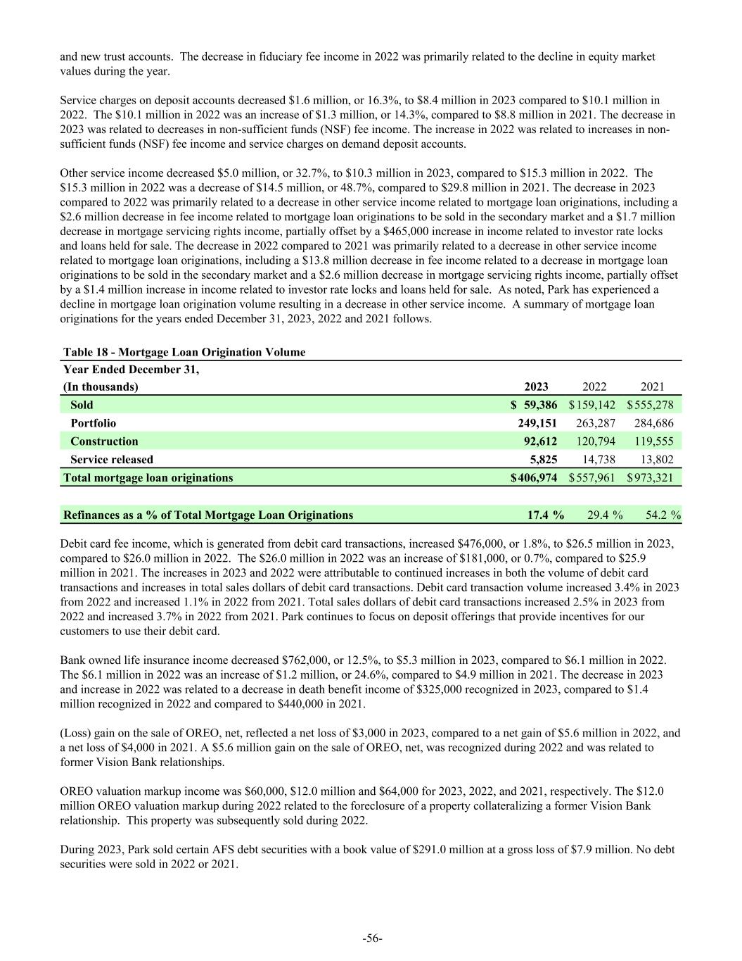 and new trust accounts. The decrease in fiduciary fee income in 2022 was primarily related to the decline in equity market values during the year. Service charges on deposit accounts decreased $1.6 million, or 16.3%, to $8.4 million in 2023 compared to $10.1 million in 2022. The $10.1 million in 2022 was an increase of $1.3 million, or 14.3%, compared to $8.8 million in 2021. The decrease in 2023 was related to decreases in non-sufficient funds (NSF) fee income. The increase in 2022 was related to increases in non- sufficient funds (NSF) fee income and service charges on demand deposit accounts. Other service income decreased $5.0 million, or 32.7%, to $10.3 million in 2023, compared to $15.3 million in 2022. The $15.3 million in 2022 was a decrease of $14.5 million, or 48.7%, compared to $29.8 million in 2021. The decrease in 2023 compared to 2022 was primarily related to a decrease in other service income related to mortgage loan originations, including a $2.6 million decrease in fee income related to mortgage loan originations to be sold in the secondary market and a $1.7 million decrease in mortgage servicing rights income, partially offset by a $465,000 increase in income related to investor rate locks and loans held for sale. The decrease in 2022 compared to 2021 was primarily related to a decrease in other service income related to mortgage loan originations, including a $13.8 million decrease in fee income related to a decrease in mortgage loan originations to be sold in the secondary market and a $2.6 million decrease in mortgage servicing rights income, partially offset by a $1.4 million increase in income related to investor rate locks and loans held for sale. As noted, Park has experienced a decline in mortgage loan origination volume resulting in a decrease in other service income. A summary of mortgage loan originations for the years ended December 31, 2023, 2022 and 2021 follows. Table 18 - Mortgage Loan Origination Volume Year Ended December 31, (In thousands) 2023 2022 2021 Sold $ 59,386 $ 159,142 $ 555,278 Portfolio 249,151 263,287 284,686 Construction 92,612 120,794 119,555 Service released 5,825 14,738 13,802 Total mortgage loan originations $ 406,974 $ 557,961 $ 973,321 Refinances as a % of Total Mortgage Loan Originations 17.4 % 29.4 % 54.2 % Debit card fee income, which is generated from debit card transactions, increased $476,000, or 1.8%, to $26.5 million in 2023, compared to $26.0 million in 2022. The $26.0 million in 2022 was an increase of $181,000, or 0.7%, compared to $25.9 million in 2021. The increases in 2023 and 2022 were attributable to continued increases in both the volume of debit card transactions and increases in total sales dollars of debit card transactions. Debit card transaction volume increased 3.4% in 2023 from 2022 and increased 1.1% in 2022 from 2021. Total sales dollars of debit card transactions increased 2.5% in 2023 from 2022 and increased 3.7% in 2022 from 2021. Park continues to focus on deposit offerings that provide incentives for our customers to use their debit card. Bank owned life insurance income decreased $762,000, or 12.5%, to $5.3 million in 2023, compared to $6.1 million in 2022. The $6.1 million in 2022 was an increase of $1.2 million, or 24.6%, compared to $4.9 million in 2021. The decrease in 2023 and increase in 2022 was related to a decrease in death benefit income of $325,000 recognized in 2023, compared to $1.4 million recognized in 2022 and compared to $440,000 in 2021. (Loss) gain on the sale of OREO, net, reflected a net loss of $3,000 in 2023, compared to a net gain of $5.6 million in 2022, and a net loss of $4,000 in 2021. A $5.6 million gain on the sale of OREO, net, was recognized during 2022 and was related to former Vision Bank relationships. OREO valuation markup income was $60,000, $12.0 million and $64,000 for 2023, 2022, and 2021, respectively. The $12.0 million OREO valuation markup during 2022 related to the foreclosure of a property collateralizing a former Vision Bank relationship. This property was subsequently sold during 2022. During 2023, Park sold certain AFS debt securities with a book value of $291.0 million at a gross loss of $7.9 million. No debt securities were sold in 2022 or 2021. -56-