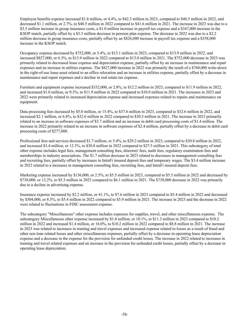 Employee benefits expense increased $1.8 million, or 4.4%, to $42.3 million in 2023, compared to $40.5 million in 2022, and decreased $1.1 million, or 2.7%, to $40.5 million in 2022 compared to $41.6 million in 2021. The increase in 2023 was due to a $3.5 million increase in group insurance costs, a $1.0 million increase in payroll tax expense and a $347,000 increase in the KSOP match, partially offset by a $3.5 million decrease in pension plan expense. The decrease in 2022 was due to a $2.2 million decrease in group insurance costs, partially offset by an $826,000 increase in payroll tax expense and a $358,000 increase in the KSOP match. Occupancy expense decreased by $752,000, or 5.4%, to $13.1 million in 2023, compared to $13.9 million in 2022, and increased $827,000, or 6.3%, to $13.9 million in 2022 compared to $13.0 million in 2021. The $752,000 decrease in 2023 was primarily related to decreased lease expense and depreciation expense, partially offset by an increase in maintenance and repair expenses and an increase in utilities expense. The $827,000 increase in 2022 was primarily the result of a $760,000 write-down in the right-of-use lease asset related to an office relocation and an increase in utilities expense, partially offset by a decrease in maintenance and repair expenses and a decline in real estate tax expense. Furniture and equipment expense increased $332,000, or 2.8%, to $12.2 million in 2023, compared to $11.9 million in 2022, and increased $1.0 million, or 9.3%, to $11.9 million in 2022 compared to $10.9 million in 2021. The increases in 2023 and 2022 were primarily related to increased depreciation expense and increased expenses related to repairs and maintenance on equipment. Data processing fees increased by $5.0 million, or 15.4%, to $37.6 million in 2023, compared to $32.6 million in 2022, and increased $2.1 million, or 6.8%, to $32.6 million in 2022 compared to $30.5 million in 2021. The increase in 2023 primarily related to an increase in software expenses of $3.7 million and an increase in debit card processing costs of $1.4 million. The increase in 2022 primarily related to an increase in software expenses of $2.4 million, partially offset by a decrease in debit card processing costs of $277,000. Professional fees and services decreased $1.7 million, or 5.4%, to $29.2 million in 2023, compared to $30.8 million in 2022, and increased $3.4 million, or 12.3%, to $30.8 million in 2022 compared to $27.5 million in 2021. This subcategory of total other expense includes legal fees, management consulting fees, directors' fees, audit fees, regulatory examination fees and memberships in industry associations. The $1.7 million decrease in 2023 related to decreases in management consulting fees and recruiting fees, partially offset by increases in IntraFi insured deposit fees and temporary wages. The $3.4 million increase in 2022 related to a increases in management consulting fees, recruiting fees, and IntraFi insured deposit fees. Marketing expense increased by $136,000, or 2.5%, to $5.5 million in 2023, compared to $5.3 million in 2022 and decreased by $738,000, or 12.2%, to $5.3 million in 2022 compared to $6.1 million in 2021. The $738,000 decrease in 2022 was primarily due to a decline in advertising expense. Insurance expense increased by $2.2 million, or 41.1%, to $7.6 million in 2023 compared to $5.4 million in 2022 and decreased by $504,000, or 8.5%, to $5.4 million in 2022 compared to $5.9 million in 2021. The increase in 2023 and the decrease in 2022 were related to fluctuations in FDIC assessment expense. The subcategory "Miscellaneous" other expense includes expenses for supplies, travel, and other miscellaneous expense. The subcategory Miscellaneous other expense increased by $1.0 million, or 10.1%, to $11.3 million in 2023 compared to $10.2 million in 2022 and increased $1.4 million, or 16.0%, to $10.2 million in 2022 compared to $8.8 million in 2021. The increase in 2023 was related to increases in training and travel expenses and increased expense related to losses as a result of fraud and other non loan related losses and other miscellaneous expenses, partially offset by a decrease in operating lease depreciation expense and a decrease in the expense for the provision for unfunded credit losses. The increase in 2022 related to increases in training and travel related expenses and an increase in the provision for unfunded credit losses, partially offset by a decrease in operating lease depreciation. -58-