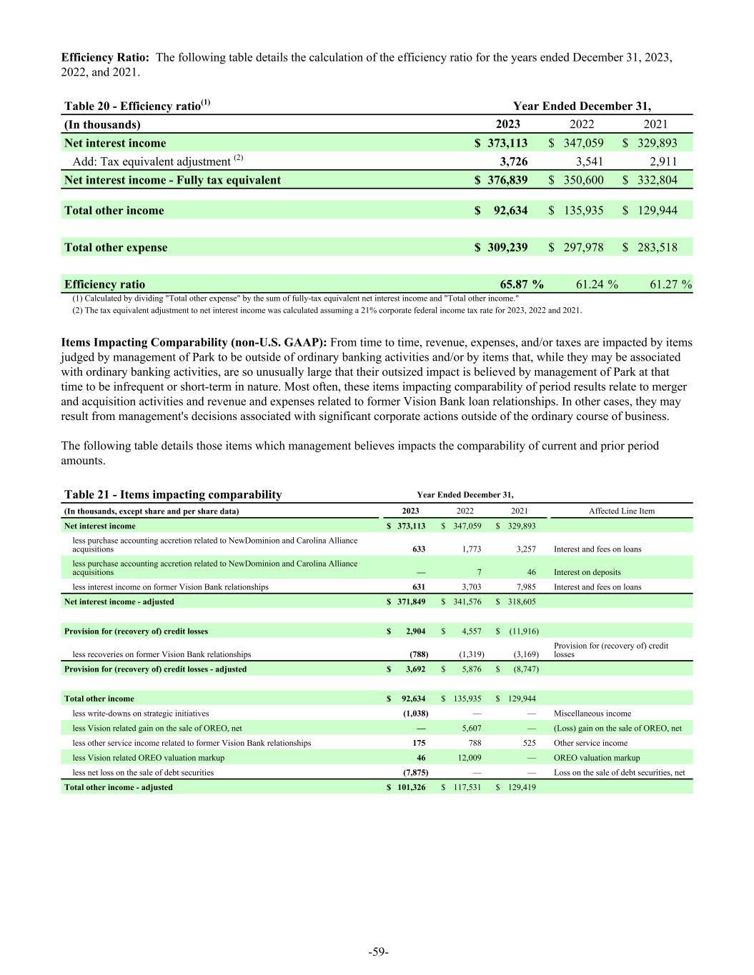 Efficiency Ratio: The following table details the calculation of the efficiency ratio for the years ended December 31, 2023, 2022, and 2021. Net interest income $ 373,113 $ 347,059 $ 329,893 Add: Tax equivalent adjustment (2) 3,726 3,541 2,911 Net interest income - Fully tax equivalent $ 376,839 $ 350,600 $ 332,804 Total other income $ 92,634 $ 135,935 $ 129,944 Total other expense $ 309,239 $ 297,978 $ 283,518 Efficiency ratio 65.87 % 61.24 % 61.27 % (1) Calculated by dividing "Total other expense" by the sum of fully-tax equivalent net interest income and "Total other income." (2) The tax equivalent adjustment to net interest income was calculated assuming a 21% corporate federal income tax rate for 2023, 2022 and 2021. Table 20 - Efficiency ratio(1) Year Ended December 31, (In thousands) 2023 2022 2021 Items Impacting Comparability (non-U.S. GAAP): From time to time, revenue, expenses, and/or taxes are impacted by items judged by management of Park to be outside of ordinary banking activities and/or by items that, while they may be associated with ordinary banking activities, are so unusually large that their outsized impact is believed by management of Park at that time to be infrequent or short-term in nature. Most often, these items impacting comparability of period results relate to merger and acquisition activities and revenue and expenses related to former Vision Bank loan relationships. In other cases, they may result from management's decisions associated with significant corporate actions outside of the ordinary course of business. The following table details those items which management believes impacts the comparability of current and prior period amounts. Net interest income $ 373,113 $ 347,059 $ 329,893 less purchase accounting accretion related to NewDominion and Carolina Alliance acquisitions 633 1,773 3,257 Interest and fees on loans less purchase accounting accretion related to NewDominion and Carolina Alliance acquisitions — 7 46 Interest on deposits less interest income on former Vision Bank relationships 631 3,703 7,985 Interest and fees on loans Net interest income - adjusted $ 371,849 $ 341,576 $ 318,605 Provision for (recovery of) credit losses $ 2,904 $ 4,557 $ (11,916) less recoveries on former Vision Bank relationships (788) (1,319) (3,169) Provision for (recovery of) credit losses Provision for (recovery of) credit losses - adjusted $ 3,692 $ 5,876 $ (8,747) Total other income $ 92,634 $ 135,935 $ 129,944 less write-downs on strategic initiatives (1,038) — — Miscellaneous income less Vision related gain on the sale of OREO, net — 5,607 — (Loss) gain on the sale of OREO, net less other service income related to former Vision Bank relationships 175 788 525 Other service income less Vision related OREO valuation markup 46 12,009 — OREO valuation markup less net loss on the sale of debt securities (7,875) — — Loss on the sale of debt securities, net Total other income - adjusted $ 101,326 $ 117,531 $ 129,419 Table 21 - Items impacting comparability Year Ended December 31, (In thousands, except share and per share data) 2023 2022 2021 Affected Line Item -59-