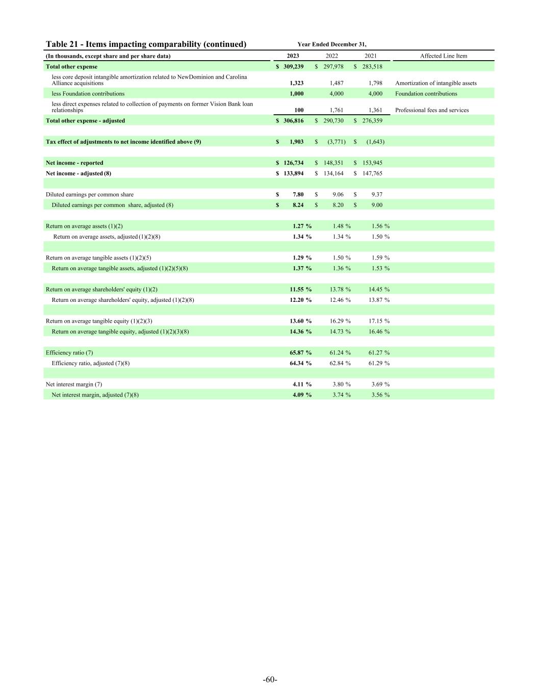 Total other expense $ 309,239 $ 297,978 $ 283,518 less core deposit intangible amortization related to NewDominion and Carolina Alliance acquisitions 1,323 1,487 1,798 Amortization of intangible assets less Foundation contributions 1,000 4,000 4,000 Foundation contributions less direct expenses related to collection of payments on former Vision Bank loan relationships 100 1,761 1,361 Professional fees and services Total other expense - adjusted $ 306,816 $ 290,730 $ 276,359 Tax effect of adjustments to net income identified above (9) $ 1,903 $ (3,771) $ (1,643) Net income - reported $ 126,734 $ 148,351 $ 153,945 Net income - adjusted (8) $ 133,894 $ 134,164 $ 147,765 Diluted earnings per common share $ 7.80 $ 9.06 $ 9.37 Diluted earnings per common share, adjusted (8) $ 8.24 $ 8.20 $ 9.00 Return on average assets (1)(2) 1.27 % 1.48 % 1.56 % Return on average assets, adjusted (1)(2)(8) 1.34 % 1.34 % 1.50 % Return on average tangible assets (1)(2)(5) 1.29 % 1.50 % 1.59 % Return on average tangible assets, adjusted (1)(2)(5)(8) 1.37 % 1.36 % 1.53 % Return on average shareholders' equity (1)(2) 11.55 % 13.78 % 14.45 % Return on average shareholders' equity, adjusted (1)(2)(8) 12.20 % 12.46 % 13.87 % Return on average tangible equity (1)(2)(3) 13.60 % 16.29 % 17.15 % Return on average tangible equity, adjusted (1)(2)(3)(8) 14.36 % 14.73 % 16.46 % Efficiency ratio (7) 65.87 % 61.24 % 61.27 % Efficiency ratio, adjusted (7)(8) 64.34 % 62.84 % 61.29 % Net interest margin (7) 4.11 % 3.80 % 3.69 % Net interest margin, adjusted (7)(8) 4.09 % 3.74 % 3.56 % Table 21 - Items impacting comparability (continued) Year Ended December 31, (In thousands, except share and per share data) 2023 2022 2021 Affected Line Item -60-