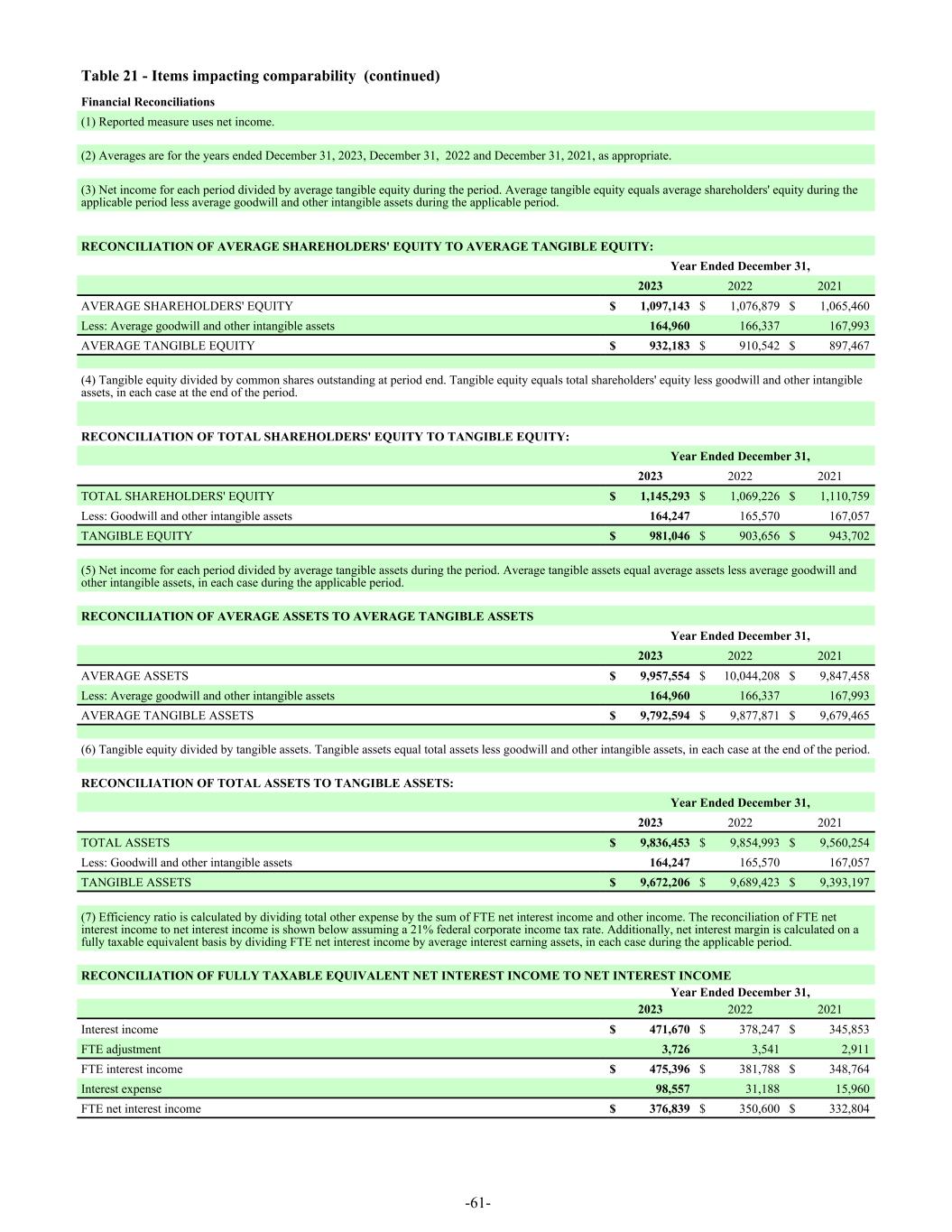 Table 21 - Items impacting comparability (continued) Financial Reconciliations (1) Reported measure uses net income. (2) Averages are for the years ended December 31, 2023, December 31, 2022 and December 31, 2021, as appropriate. (3) Net income for each period divided by average tangible equity during the period. Average tangible equity equals average shareholders' equity during the applicable period less average goodwill and other intangible assets during the applicable period. RECONCILIATION OF AVERAGE SHAREHOLDERS' EQUITY TO AVERAGE TANGIBLE EQUITY: Year Ended December 31, 2023 2022 2021 AVERAGE SHAREHOLDERS' EQUITY $ 1,097,143 $ 1,076,879 $ 1,065,460 Less: Average goodwill and other intangible assets 164,960 166,337 167,993 AVERAGE TANGIBLE EQUITY $ 932,183 $ 910,542 $ 897,467 (4) Tangible equity divided by common shares outstanding at period end. Tangible equity equals total shareholders' equity less goodwill and other intangible assets, in each case at the end of the period. RECONCILIATION OF TOTAL SHAREHOLDERS' EQUITY TO TANGIBLE EQUITY: Year Ended December 31, 2023 2022 2021 TOTAL SHAREHOLDERS' EQUITY $ 1,145,293 $ 1,069,226 $ 1,110,759 Less: Goodwill and other intangible assets 164,247 165,570 167,057 TANGIBLE EQUITY $ 981,046 $ 903,656 $ 943,702 (5) Net income for each period divided by average tangible assets during the period. Average tangible assets equal average assets less average goodwill and other intangible assets, in each case during the applicable period. RECONCILIATION OF AVERAGE ASSETS TO AVERAGE TANGIBLE ASSETS Year Ended December 31, 2023 2022 2021 AVERAGE ASSETS $ 9,957,554 $ 10,044,208 $ 9,847,458 Less: Average goodwill and other intangible assets 164,960 166,337 167,993 AVERAGE TANGIBLE ASSETS $ 9,792,594 $ 9,877,871 $ 9,679,465 (6) Tangible equity divided by tangible assets. Tangible assets equal total assets less goodwill and other intangible assets, in each case at the end of the period. RECONCILIATION OF TOTAL ASSETS TO TANGIBLE ASSETS: Year Ended December 31, 2023 2022 2021 TOTAL ASSETS $ 9,836,453 $ 9,854,993 $ 9,560,254 Less: Goodwill and other intangible assets 164,247 165,570 167,057 TANGIBLE ASSETS $ 9,672,206 $ 9,689,423 $ 9,393,197 (7) Efficiency ratio is calculated by dividing total other expense by the sum of FTE net interest income and other income. The reconciliation of FTE net interest income to net interest income is shown below assuming a 21% federal corporate income tax rate. Additionally, net interest margin is calculated on a fully taxable equivalent basis by dividing FTE net interest income by average interest earning assets, in each case during the applicable period. RECONCILIATION OF FULLY TAXABLE EQUIVALENT NET INTEREST INCOME TO NET INTEREST INCOME Year Ended December 31, 2023 2022 2021 Interest income $ 471,670 $ 378,247 $ 345,853 FTE adjustment 3,726 3,541 2,911 FTE interest income $ 475,396 $ 381,788 $ 348,764 Interest expense 98,557 31,188 15,960 FTE net interest income $ 376,839 $ 350,600 $ 332,804 -61-