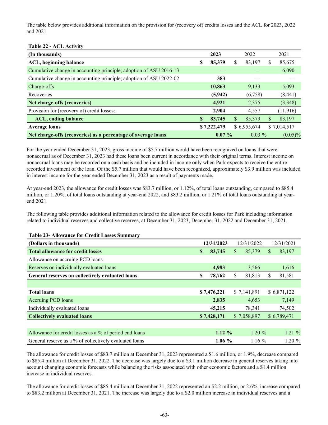 The table below provides additional information on the provision for (recovery of) credits losses and the ACL for 2023, 2022 and 2021. Table 22 - ACL Activity (In thousands) 2023 2022 2021 ACL, beginning balance $ 85,379 $ 83,197 $ 85,675 Cumulative change in accounting principle; adoption of ASU 2016-13 — — 6,090 Cumulative change in accounting principle; adoption of ASU 2022-02 383 — — Charge-offs 10,863 9,133 5,093 Recoveries (5,942) (6,758) (8,441) Net charge-offs (recoveries) 4,921 2,375 (3,348) Provision for (recovery of) credit losses: 2,904 4,557 (11,916) ACL, ending balance $ 83,745 $ 85,379 $ 83,197 Average loans $ 7,222,479 $ 6,955,674 $ 7,014,517 Net charge-offs (recoveries) as a percentage of average loans 0.07 % 0.03 % (0.05) % For the year ended December 31, 2023, gross income of $5.7 million would have been recognized on loans that were nonaccrual as of December 31, 2023 had these loans been current in accordance with their original terms. Interest income on nonaccrual loans may be recorded on a cash basis and be included in income only when Park expects to receive the entire recorded investment of the loan. Of the $5.7 million that would have been recognized, approximately $3.9 million was included in interest income for the year ended December 31, 2023 as a result of payments made. At year-end 2023, the allowance for credit losses was $83.7 million, or 1.12%, of total loans outstanding, compared to $85.4 million, or 1.20%, of total loans outstanding at year-end 2022, and $83.2 million, or 1.21% of total loans outstanding at year- end 2021. The following table provides additional information related to the allowance for credit losses for Park including information related to individual reserves and collective reserves, at December 31, 2023, December 31, 2022 and December 31, 2021. Table 23- Allowance for Credit Losses Summary (Dollars in thousands) 12/31/2023 12/31/2022 12/31/2021 Total allowance for credit losses $ 83,745 $ 85,379 $ 83,197 Allowance on accruing PCD loans — — — Reserves on individually evaluated loans 4,983 3,566 1,616 General reserves on collectively evaluated loans $ 78,762 $ 81,813 $ 81,581 Total loans $ 7,476,221 $ 7,141,891 $ 6,871,122 Accruing PCD loans 2,835 4,653 7,149 Individually evaluated loans 45,215 78,341 74,502 Collectively evaluated loans $ 7,428,171 $ 7,058,897 $ 6,789,471 Allowance for credit losses as a % of period end loans 1.12 % 1.20 % 1.21 % General reserve as a % of collectively evaluated loans 1.06 % 1.16 % 1.20 % The allowance for credit losses of $83.7 million at December 31, 2023 represented a $1.6 million, or 1.9%, decrease compared to $85.4 million at December 31, 2022. The decrease was largely due to a $3.1 million decrease in general reserves taking into account changing economic forecasts while balancing the risks associated with other economic factors and a $1.4 million increase in individual reserves. The allowance for credit losses of $85.4 million at December 31, 2022 represented an $2.2 million, or 2.6%, increase compared to $83.2 million at December 31, 2021. The increase was largely due to a $2.0 million increase in individual reserves and a -63-