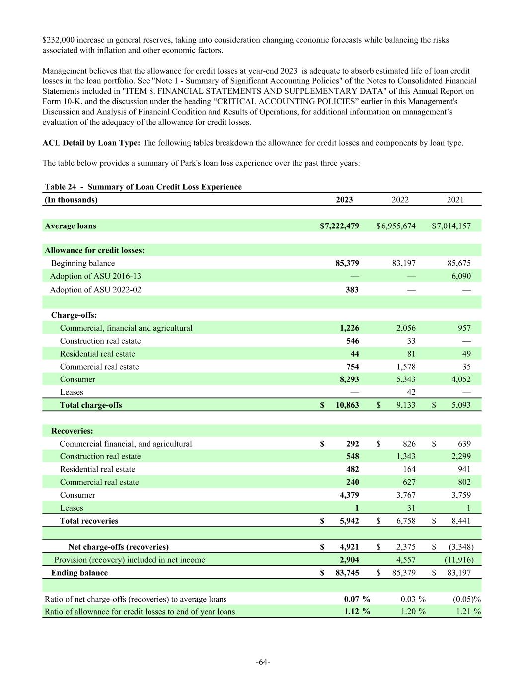 $232,000 increase in general reserves, taking into consideration changing economic forecasts while balancing the risks associated with inflation and other economic factors. Management believes that the allowance for credit losses at year-end 2023 is adequate to absorb estimated life of loan credit losses in the loan portfolio. See "Note 1 - Summary of Significant Accounting Policies" of the Notes to Consolidated Financial Statements included in "ITEM 8. FINANCIAL STATEMENTS AND SUPPLEMENTARY DATA" of this Annual Report on Form 10-K, and the discussion under the heading “CRITICAL ACCOUNTING POLICIES” earlier in this Management's Discussion and Analysis of Financial Condition and Results of Operations, for additional information on management’s evaluation of the adequacy of the allowance for credit losses. ACL Detail by Loan Type: The following tables breakdown the allowance for credit losses and components by loan type. The table below provides a summary of Park's loan loss experience over the past three years: Table 24 - Summary of Loan Credit Loss Experience (In thousands) 2023 2022 2021 Average loans $ 7,222,479 $ 6,955,674 $ 7,014,157 Allowance for credit losses: Beginning balance 85,379 83,197 85,675 Adoption of ASU 2016-13 — — 6,090 Adoption of ASU 2022-02 383 — — Charge-offs: Commercial, financial and agricultural 1,226 2,056 957 Construction real estate 546 33 — Residential real estate 44 81 49 Commercial real estate 754 1,578 35 Consumer 8,293 5,343 4,052 Leases — 42 — Total charge-offs $ 10,863 $ 9,133 $ 5,093 Recoveries: Commercial financial, and agricultural $ 292 $ 826 $ 639 Construction real estate 548 1,343 2,299 Residential real estate 482 164 941 Commercial real estate 240 627 802 Consumer 4,379 3,767 3,759 Leases 1 31 1 Total recoveries $ 5,942 $ 6,758 $ 8,441 Net charge-offs (recoveries) $ 4,921 $ 2,375 $ (3,348) Provision (recovery) included in net income 2,904 4,557 (11,916) Ending balance $ 83,745 $ 85,379 $ 83,197 Ratio of net charge-offs (recoveries) to average loans 0.07 % 0.03 % (0.05) % Ratio of allowance for credit losses to end of year loans 1.12 % 1.20 % 1.21 % -64-