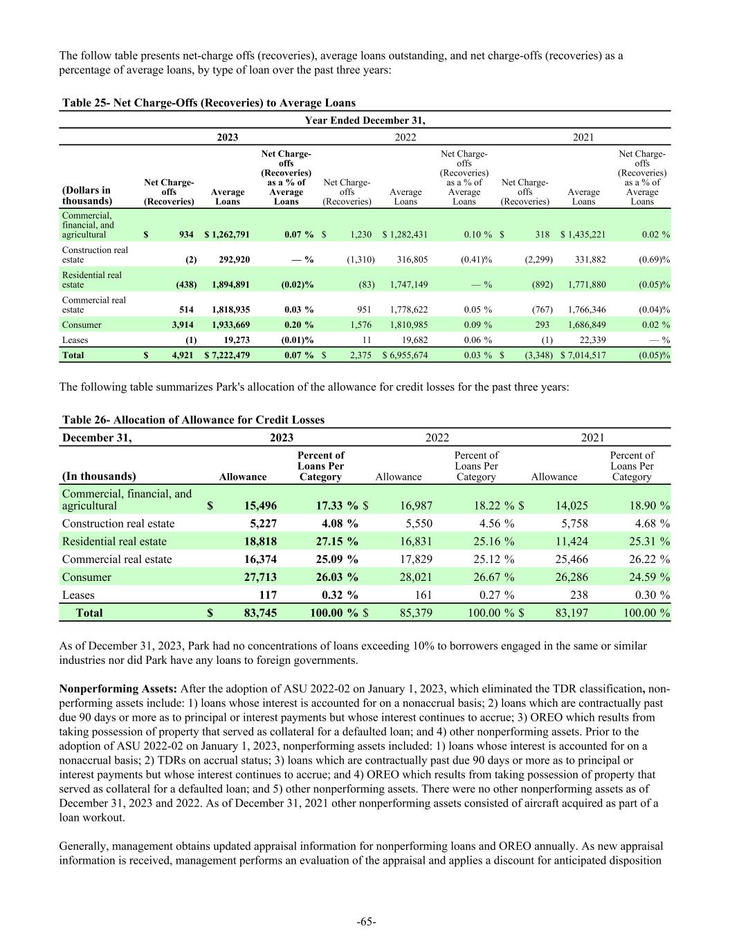 The follow table presents net-charge offs (recoveries), average loans outstanding, and net charge-offs (recoveries) as a percentage of average loans, by type of loan over the past three years: Commercial, financial, and agricultural $ 934 $ 1,262,791 0.07 % $ 1,230 $ 1,282,431 0.10 % $ 318 $ 1,435,221 0.02 % Construction real estate (2) 292,920 — % (1,310) 316,805 (0.41) % (2,299) 331,882 (0.69) % Residential real estate (438) 1,894,891 (0.02) % (83) 1,747,149 — % (892) 1,771,880 (0.05) % Commercial real estate 514 1,818,935 0.03 % 951 1,778,622 0.05 % (767) 1,766,346 (0.04) % Consumer 3,914 1,933,669 0.20 % 1,576 1,810,985 0.09 % 293 1,686,849 0.02 % Leases (1) 19,273 (0.01) % 11 19,682 0.06 % (1) 22,339 — % Total $ 4,921 $ 7,222,479 0.07 % $ 2,375 $ 6,955,674 0.03 % $ (3,348) $ 7,014,517 (0.05) % Table 25- Net Charge-Offs (Recoveries) to Average Loans Year Ended December 31, 2023 2022 2021 (Dollars in thousands) Net Charge- offs (Recoveries) Average Loans Net Charge- offs (Recoveries) as a % of Average Loans Net Charge- offs (Recoveries) Average Loans Net Charge- offs (Recoveries) as a % of Average Loans Net Charge- offs (Recoveries) Average Loans Net Charge- offs (Recoveries) as a % of Average Loans The following table summarizes Park's allocation of the allowance for credit losses for the past three years: Table 26- Allocation of Allowance for Credit Losses December 31, 2023 2022 2021 (In thousands) Allowance Percent of Loans Per Category Allowance Percent of Loans Per Category Allowance Percent of Loans Per Category Commercial, financial, and agricultural $ 15,496 17.33 % $ 16,987 18.22 % $ 14,025 18.90 % Construction real estate 5,227 4.08 % 5,550 4.56 % 5,758 4.68 % Residential real estate 18,818 27.15 % 16,831 25.16 % 11,424 25.31 % Commercial real estate 16,374 25.09 % 17,829 25.12 % 25,466 26.22 % Consumer 27,713 26.03 % 28,021 26.67 % 26,286 24.59 % Leases 117 0.32 % 161 0.27 % 238 0.30 % Total $ 83,745 100.00 % $ 85,379 100.00 % $ 83,197 100.00 % As of December 31, 2023, Park had no concentrations of loans exceeding 10% to borrowers engaged in the same or similar industries nor did Park have any loans to foreign governments. Nonperforming Assets: After the adoption of ASU 2022-02 on January 1, 2023, which eliminated the TDR classification, non- performing assets include: 1) loans whose interest is accounted for on a nonaccrual basis; 2) loans which are contractually past due 90 days or more as to principal or interest payments but whose interest continues to accrue; 3) OREO which results from taking possession of property that served as collateral for a defaulted loan; and 4) other nonperforming assets. Prior to the adoption of ASU 2022-02 on January 1, 2023, nonperforming assets included: 1) loans whose interest is accounted for on a nonaccrual basis; 2) TDRs on accrual status; 3) loans which are contractually past due 90 days or more as to principal or interest payments but whose interest continues to accrue; and 4) OREO which results from taking possession of property that served as collateral for a defaulted loan; and 5) other nonperforming assets. There were no other nonperforming assets as of December 31, 2023 and 2022. As of December 31, 2021 other nonperforming assets consisted of aircraft acquired as part of a loan workout. Generally, management obtains updated appraisal information for nonperforming loans and OREO annually. As new appraisal information is received, management performs an evaluation of the appraisal and applies a discount for anticipated disposition -65-