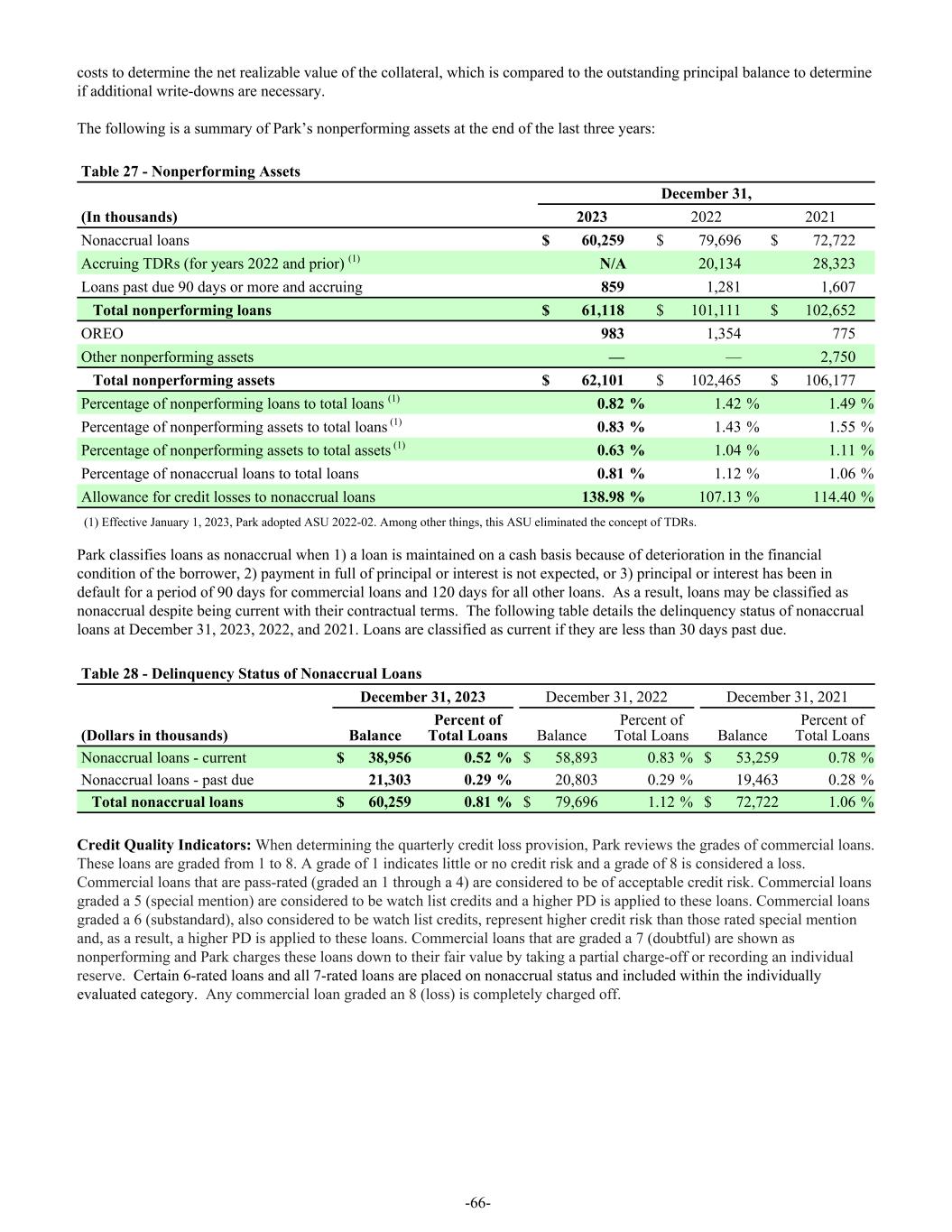 costs to determine the net realizable value of the collateral, which is compared to the outstanding principal balance to determine if additional write-downs are necessary. The following is a summary of Park’s nonperforming assets at the end of the last three years: Table 27 - Nonperforming Assets December 31, (In thousands) 2023 2022 2021 Nonaccrual loans $ 60,259 $ 79,696 $ 72,722 Accruing TDRs (for years 2022 and prior) (1) N/A 20,134 28,323 Loans past due 90 days or more and accruing 859 1,281 1,607 Total nonperforming loans $ 61,118 $ 101,111 $ 102,652 OREO 983 1,354 775 Other nonperforming assets — — 2,750 Total nonperforming assets $ 62,101 $ 102,465 $ 106,177 Percentage of nonperforming loans to total loans (1) 0.82 % 1.42 % 1.49 % Percentage of nonperforming assets to total loans (1) 0.83 % 1.43 % 1.55 % Percentage of nonperforming assets to total assets (1) 0.63 % 1.04 % 1.11 % Percentage of nonaccrual loans to total loans 0.81 % 1.12 % 1.06 % Allowance for credit losses to nonaccrual loans 138.98 % 107.13 % 114.40 % (1) Effective January 1, 2023, Park adopted ASU 2022-02. Among other things, this ASU eliminated the concept of TDRs. Park classifies loans as nonaccrual when 1) a loan is maintained on a cash basis because of deterioration in the financial condition of the borrower, 2) payment in full of principal or interest is not expected, or 3) principal or interest has been in default for a period of 90 days for commercial loans and 120 days for all other loans. As a result, loans may be classified as nonaccrual despite being current with their contractual terms. The following table details the delinquency status of nonaccrual loans at December 31, 2023, 2022, and 2021. Loans are classified as current if they are less than 30 days past due. Table 28 - Delinquency Status of Nonaccrual Loans December 31, 2023 December 31, 2022 December 31, 2021 (Dollars in thousands) Balance Percent of Total Loans Balance Percent of Total Loans Balance Percent of Total Loans Nonaccrual loans - current $ 38,956 0.52 % $ 58,893 0.83 % $ 53,259 0.78 % Nonaccrual loans - past due 21,303 0.29 % 20,803 0.29 % 19,463 0.28 % Total nonaccrual loans $ 60,259 0.81 % $ 79,696 1.12 % $ 72,722 1.06 % Credit Quality Indicators: When determining the quarterly credit loss provision, Park reviews the grades of commercial loans. These loans are graded from 1 to 8. A grade of 1 indicates little or no credit risk and a grade of 8 is considered a loss. Commercial loans that are pass-rated (graded an 1 through a 4) are considered to be of acceptable credit risk. Commercial loans graded a 5 (special mention) are considered to be watch list credits and a higher PD is applied to these loans. Commercial loans graded a 6 (substandard), also considered to be watch list credits, represent higher credit risk than those rated special mention and, as a result, a higher PD is applied to these loans. Commercial loans that are graded a 7 (doubtful) are shown as nonperforming and Park charges these loans down to their fair value by taking a partial charge-off or recording an individual reserve. Certain 6-rated loans and all 7-rated loans are placed on nonaccrual status and included within the individually evaluated category. Any commercial loan graded an 8 (loss) is completely charged off. -66-