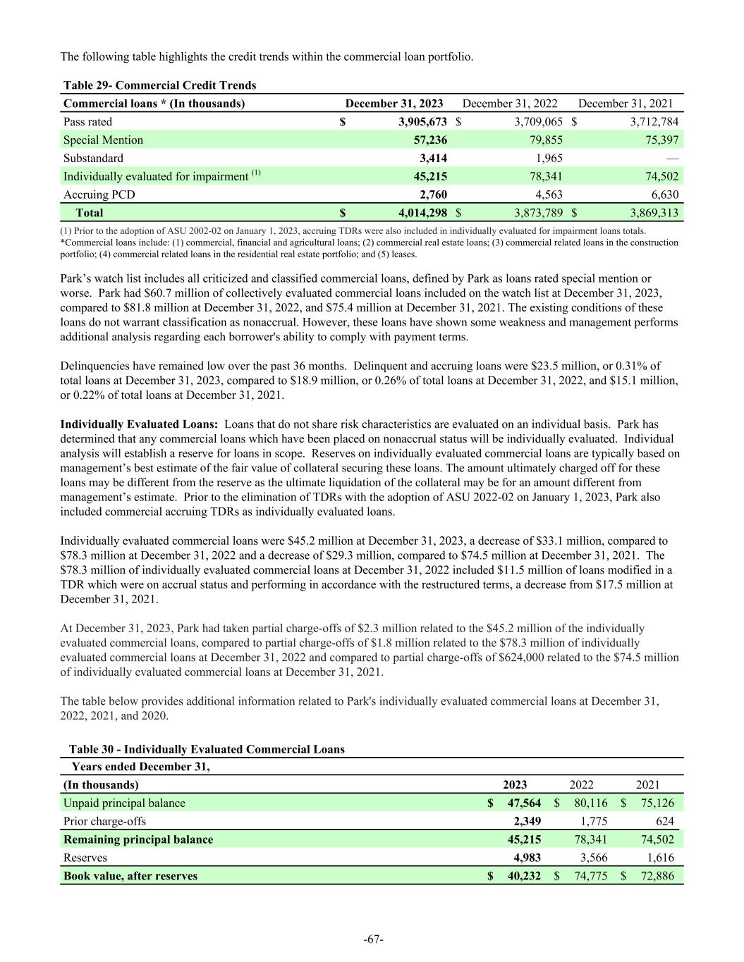The following table highlights the credit trends within the commercial loan portfolio. Table 29- Commercial Credit Trends Commercial loans * (In thousands) December 31, 2023 December 31, 2022 December 31, 2021 Pass rated $ 3,905,673 $ 3,709,065 $ 3,712,784 Special Mention 57,236 79,855 75,397 Substandard 3,414 1,965 — Individually evaluated for impairment (1) 45,215 78,341 74,502 Accruing PCD 2,760 4,563 6,630 Total $ 4,014,298 $ 3,873,789 $ 3,869,313 (1) Prior to the adoption of ASU 2002-02 on January 1, 2023, accruing TDRs were also included in individually evaluated for impairment loans totals. *Commercial loans include: (1) commercial, financial and agricultural loans; (2) commercial real estate loans; (3) commercial related loans in the construction portfolio; (4) commercial related loans in the residential real estate portfolio; and (5) leases. Park’s watch list includes all criticized and classified commercial loans, defined by Park as loans rated special mention or worse. Park had $60.7 million of collectively evaluated commercial loans included on the watch list at December 31, 2023, compared to $81.8 million at December 31, 2022, and $75.4 million at December 31, 2021. The existing conditions of these loans do not warrant classification as nonaccrual. However, these loans have shown some weakness and management performs additional analysis regarding each borrower's ability to comply with payment terms. Delinquencies have remained low over the past 36 months. Delinquent and accruing loans were $23.5 million, or 0.31% of total loans at December 31, 2023, compared to $18.9 million, or 0.26% of total loans at December 31, 2022, and $15.1 million, or 0.22% of total loans at December 31, 2021. Individually Evaluated Loans: Loans that do not share risk characteristics are evaluated on an individual basis. Park has determined that any commercial loans which have been placed on nonaccrual status will be individually evaluated. Individual analysis will establish a reserve for loans in scope. Reserves on individually evaluated commercial loans are typically based on management’s best estimate of the fair value of collateral securing these loans. The amount ultimately charged off for these loans may be different from the reserve as the ultimate liquidation of the collateral may be for an amount different from management’s estimate. Prior to the elimination of TDRs with the adoption of ASU 2022-02 on January 1, 2023, Park also included commercial accruing TDRs as individually evaluated loans. Individually evaluated commercial loans were $45.2 million at December 31, 2023, a decrease of $33.1 million, compared to $78.3 million at December 31, 2022 and a decrease of $29.3 million, compared to $74.5 million at December 31, 2021. The $78.3 million of individually evaluated commercial loans at December 31, 2022 included $11.5 million of loans modified in a TDR which were on accrual status and performing in accordance with the restructured terms, a decrease from $17.5 million at December 31, 2021. At December 31, 2023, Park had taken partial charge-offs of $2.3 million related to the $45.2 million of the individually evaluated commercial loans, compared to partial charge-offs of $1.8 million related to the $78.3 million of individually evaluated commercial loans at December 31, 2022 and compared to partial charge-offs of $624,000 related to the $74.5 million of individually evaluated commercial loans at December 31, 2021. The table below provides additional information related to Park's individually evaluated commercial loans at December 31, 2022, 2021, and 2020. Table 30 - Individually Evaluated Commercial Loans Years ended December 31, (In thousands) 2023 2022 2021 Unpaid principal balance $ 47,564 $ 80,116 $ 75,126 Prior charge-offs 2,349 1,775 624 Remaining principal balance 45,215 78,341 74,502 Reserves 4,983 3,566 1,616 Book value, after reserves $ 40,232 $ 74,775 $ 72,886 -67-