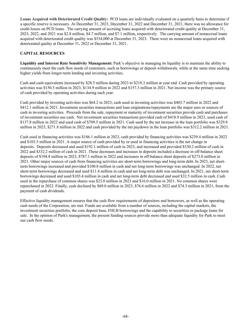 Loans Acquired with Deteriorated Credit Quality: PCD loans are individually evaluated on a quarterly basis to determine if a specific reserve is necessary. At December 31, 2023, December 31, 2022 and December 31, 2021, there was no allowance for credit losses on PCD loans. The carrying amount of accruing loans acquired with deteriorated credit quality at December 31, 2023, 2022, and 2021 was $2.8 million, $4.7 million, and $7.1 million, respectively. The carrying amount of nonaccrual loans acquired with deteriorated credit quality was $534,000 at December 31, 2023. There were no nonaccrual loans acquired with deteriorated quality at December 31, 2022 or December 31, 2021. CAPITAL RESOURCES Liquidity and Interest Rate Sensitivity Management: Park’s objective in managing its liquidity is to maintain the ability to continuously meet the cash flow needs of customers, such as borrowings or deposit withdrawals, while at the same time seeking higher yields from longer-term lending and investing activities. Cash and cash equivalents increased by $28.5 million during 2023 to $218.3 million at year end. Cash provided by operating activities was $150.5 million in 2023, $134.9 million in 2022 and $157.3 million in 2021. Net income was the primary source of cash provided by operating activities during each year. Cash provided by investing activities was $64.2 in 2023, cash used in investing activities was $403.7 million in 2022 and $412.1 million in 2021. Investment securities transactions and loan originations/repayments are the major uses or sources of cash in investing activities. Proceeds from the sale, repayment or maturity of investment securities provide cash and purchases of investment securities use cash. Net investment securities transactions provided cash of $418.9 million in 2023, used cash of $137.8 million in 2022 and used cash of $709.5 million in 2021. Cash used by the net increase in the loan portfolio was $329.8 million in 2023, $271.8 million in 2022 and cash provided by the net paydown in the loan portfolio was $312.2 million in 2021. Cash used in financing activities was $186.1 million in 2023, cash provided by financing activities was $239.4 million in 2022 and $103.5 million in 2021. A major source of cash provided by or used in financing activities is the net change in deposits. Deposits decreased and used $192.1 million of cash in 2023, and increased and provided $330.2 million of cash in 2022 and $332.2 million of cash in 2021. These decreases and increases in deposits included a decrease in off-balance sheet deposits of $194.8 million in 2023, $787.1 million in 2022 and increases in off-balance sheet deposits of $273.0 million in 2021. Other major sources of cash from financing activities are short-term borrowings and long-term debt. In 2023, net short- term borrowings increased and provided $100.8 million in cash and net long-term borrowings was unchanged. In 2022, net short-term borrowings decreased and used $11.4 million in cash and net long-term debt was unchanged. In 2021, net short-term borrowings decreased and used $103.4 million in cash and net long-term debt decreased and used $32.5 million in cash. Cash used in the repurchase of common shares was $23.0 million in 2023 and $16.0 million in 2021. No common shares were repurchased in 2022. Finally, cash declined by $69.0 million in 2023, $76.6 million in 2022 and $74.3 million in 2021, from the payment of cash dividends. Effective liquidity management ensures that the cash flow requirements of depositors and borrowers, as well as the operating cash needs of the Corporation, are met. Funds are available from a number of sources, including the capital markets, the investment securities portfolio, the core deposit base, FHLB borrowings and the capability to securitize or package loans for sale. In the opinion of Park's management, the present funding sources provide more than adequate liquidity for Park to meet our cash flow needs. -68-