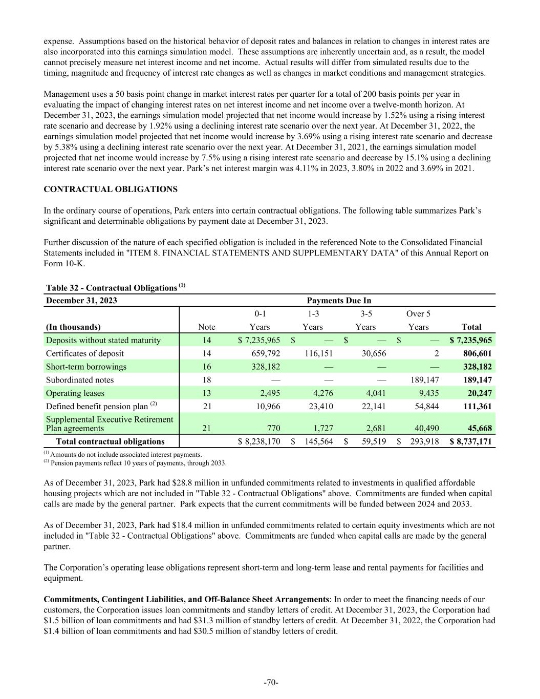 expense. Assumptions based on the historical behavior of deposit rates and balances in relation to changes in interest rates are also incorporated into this earnings simulation model. These assumptions are inherently uncertain and, as a result, the model cannot precisely measure net interest income and net income. Actual results will differ from simulated results due to the timing, magnitude and frequency of interest rate changes as well as changes in market conditions and management strategies. Management uses a 50 basis point change in market interest rates per quarter for a total of 200 basis points per year in evaluating the impact of changing interest rates on net interest income and net income over a twelve-month horizon. At December 31, 2023, the earnings simulation model projected that net income would increase by 1.52% using a rising interest rate scenario and decrease by 1.92% using a declining interest rate scenario over the next year. At December 31, 2022, the earnings simulation model projected that net income would increase by 3.69% using a rising interest rate scenario and decrease by 5.38% using a declining interest rate scenario over the next year. At December 31, 2021, the earnings simulation model projected that net income would increase by 7.5% using a rising interest rate scenario and decrease by 15.1% using a declining interest rate scenario over the next year. Park’s net interest margin was 4.11% in 2023, 3.80% in 2022 and 3.69% in 2021. CONTRACTUAL OBLIGATIONS In the ordinary course of operations, Park enters into certain contractual obligations. The following table summarizes Park’s significant and determinable obligations by payment date at December 31, 2023. Further discussion of the nature of each specified obligation is included in the referenced Note to the Consolidated Financial Statements included in "ITEM 8. FINANCIAL STATEMENTS AND SUPPLEMENTARY DATA" of this Annual Report on Form 10-K. Table 32 - Contractual Obligations (1) December 31, 2023 Payments Due In 0-1 1-3 3-5 Over 5 (In thousands) Note Years Years Years Years Total Deposits without stated maturity 14 $ 7,235,965 $ — $ — $ — $ 7,235,965 Certificates of deposit 14 659,792 116,151 30,656 2 806,601 Short-term borrowings 16 328,182 — — — 328,182 Subordinated notes 18 — — — 189,147 189,147 Operating leases 13 2,495 4,276 4,041 9,435 20,247 Defined benefit pension plan (2) 21 10,966 23,410 22,141 54,844 111,361 Supplemental Executive Retirement Plan agreements 21 770 1,727 2,681 40,490 45,668 Total contractual obligations $ 8,238,170 $ 145,564 $ 59,519 $ 293,918 $ 8,737,171 (1) Amounts do not include associated interest payments. (2) Pension payments reflect 10 years of payments, through 2033. As of December 31, 2023, Park had $28.8 million in unfunded commitments related to investments in qualified affordable housing projects which are not included in "Table 32 - Contractual Obligations" above. Commitments are funded when capital calls are made by the general partner. Park expects that the current commitments will be funded between 2024 and 2033. As of December 31, 2023, Park had $18.4 million in unfunded commitments related to certain equity investments which are not included in "Table 32 - Contractual Obligations" above. Commitments are funded when capital calls are made by the general partner. The Corporation’s operating lease obligations represent short-term and long-term lease and rental payments for facilities and equipment. Commitments, Contingent Liabilities, and Off-Balance Sheet Arrangements: In order to meet the financing needs of our customers, the Corporation issues loan commitments and standby letters of credit. At December 31, 2023, the Corporation had $1.5 billion of loan commitments and had $31.3 million of standby letters of credit. At December 31, 2022, the Corporation had $1.4 billion of loan commitments and had $30.5 million of standby letters of credit. -70-