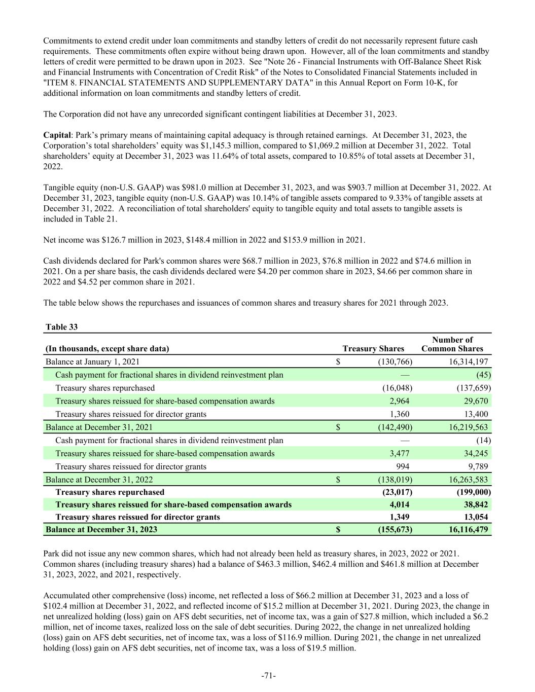 Commitments to extend credit under loan commitments and standby letters of credit do not necessarily represent future cash requirements. These commitments often expire without being drawn upon. However, all of the loan commitments and standby letters of credit were permitted to be drawn upon in 2023. See "Note 26 - Financial Instruments with Off-Balance Sheet Risk and Financial Instruments with Concentration of Credit Risk" of the Notes to Consolidated Financial Statements included in "ITEM 8. FINANCIAL STATEMENTS AND SUPPLEMENTARY DATA" in this Annual Report on Form 10-K, for additional information on loan commitments and standby letters of credit. The Corporation did not have any unrecorded significant contingent liabilities at December 31, 2023. Capital: Park’s primary means of maintaining capital adequacy is through retained earnings. At December 31, 2023, the Corporation’s total shareholders’ equity was $1,145.3 million, compared to $1,069.2 million at December 31, 2022. Total shareholders’ equity at December 31, 2023 was 11.64% of total assets, compared to 10.85% of total assets at December 31, 2022. Tangible equity (non-U.S. GAAP) was $981.0 million at December 31, 2023, and was $903.7 million at December 31, 2022. At December 31, 2023, tangible equity (non-U.S. GAAP) was 10.14% of tangible assets compared to 9.33% of tangible assets at December 31, 2022. A reconciliation of total shareholders' equity to tangible equity and total assets to tangible assets is included in Table 21. Net income was $126.7 million in 2023, $148.4 million in 2022 and $153.9 million in 2021. Cash dividends declared for Park's common shares were $68.7 million in 2023, $76.8 million in 2022 and $74.6 million in 2021. On a per share basis, the cash dividends declared were $4.20 per common share in 2023, $4.66 per common share in 2022 and $4.52 per common share in 2021. The table below shows the repurchases and issuances of common shares and treasury shares for 2021 through 2023. Table 33 (In thousands, except share data) Treasury Shares Number of Common Shares Balance at January 1, 2021 $ (130,766) 16,314,197 Cash payment for fractional shares in dividend reinvestment plan — (45) Treasury shares repurchased (16,048) (137,659) Treasury shares reissued for share-based compensation awards 2,964 29,670 Treasury shares reissued for director grants 1,360 13,400 Balance at December 31, 2021 $ (142,490) 16,219,563 Cash payment for fractional shares in dividend reinvestment plan — (14) Treasury shares reissued for share-based compensation awards 3,477 34,245 Treasury shares reissued for director grants 994 9,789 Balance at December 31, 2022 $ (138,019) 16,263,583 Treasury shares repurchased (23,017) (199,000) Treasury shares reissued for share-based compensation awards 4,014 38,842 Treasury shares reissued for director grants 1,349 13,054 Balance at December 31, 2023 $ (155,673) 16,116,479 Park did not issue any new common shares, which had not already been held as treasury shares, in 2023, 2022 or 2021. Common shares (including treasury shares) had a balance of $463.3 million, $462.4 million and $461.8 million at December 31, 2023, 2022, and 2021, respectively. Accumulated other comprehensive (loss) income, net reflected a loss of $66.2 million at December 31, 2023 and a loss of $102.4 million at December 31, 2022, and reflected income of $15.2 million at December 31, 2021. During 2023, the change in net unrealized holding (loss) gain on AFS debt securities, net of income tax, was a gain of $27.8 million, which included a $6.2 million, net of income taxes, realized loss on the sale of debt securities. During 2022, the change in net unrealized holding (loss) gain on AFS debt securities, net of income tax, was a loss of $116.9 million. During 2021, the change in net unrealized holding (loss) gain on AFS debt securities, net of income tax, was a loss of $19.5 million. -71-