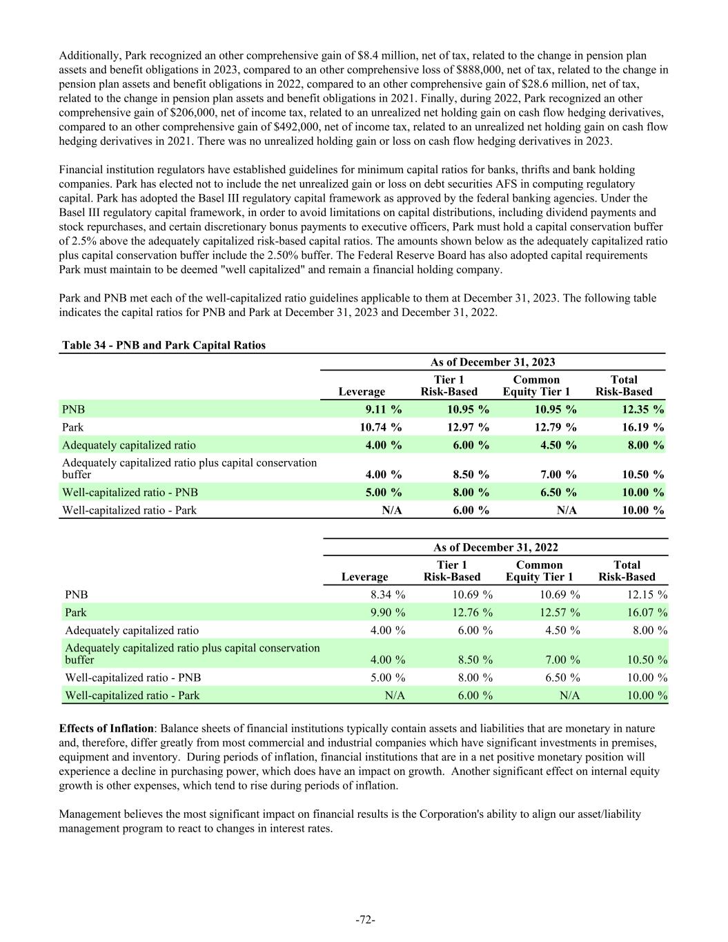 Additionally, Park recognized an other comprehensive gain of $8.4 million, net of tax, related to the change in pension plan assets and benefit obligations in 2023, compared to an other comprehensive loss of $888,000, net of tax, related to the change in pension plan assets and benefit obligations in 2022, compared to an other comprehensive gain of $28.6 million, net of tax, related to the change in pension plan assets and benefit obligations in 2021. Finally, during 2022, Park recognized an other comprehensive gain of $206,000, net of income tax, related to an unrealized net holding gain on cash flow hedging derivatives, compared to an other comprehensive gain of $492,000, net of income tax, related to an unrealized net holding gain on cash flow hedging derivatives in 2021. There was no unrealized holding gain or loss on cash flow hedging derivatives in 2023. Financial institution regulators have established guidelines for minimum capital ratios for banks, thrifts and bank holding companies. Park has elected not to include the net unrealized gain or loss on debt securities AFS in computing regulatory capital. Park has adopted the Basel III regulatory capital framework as approved by the federal banking agencies. Under the Basel III regulatory capital framework, in order to avoid limitations on capital distributions, including dividend payments and stock repurchases, and certain discretionary bonus payments to executive officers, Park must hold a capital conservation buffer of 2.5% above the adequately capitalized risk-based capital ratios. The amounts shown below as the adequately capitalized ratio plus capital conservation buffer include the 2.50% buffer. The Federal Reserve Board has also adopted capital requirements Park must maintain to be deemed "well capitalized" and remain a financial holding company. Park and PNB met each of the well-capitalized ratio guidelines applicable to them at December 31, 2023. The following table indicates the capital ratios for PNB and Park at December 31, 2023 and December 31, 2022. Table 34 - PNB and Park Capital Ratios As of December 31, 2023 Leverage Tier 1 Risk-Based Common Equity Tier 1 Total Risk-Based PNB 9.11 % 10.95 % 10.95 % 12.35 % Park 10.74 % 12.97 % 12.79 % 16.19 % Adequately capitalized ratio 4.00 % 6.00 % 4.50 % 8.00 % Adequately capitalized ratio plus capital conservation buffer 4.00 % 8.50 % 7.00 % 10.50 % Well-capitalized ratio - PNB 5.00 % 8.00 % 6.50 % 10.00 % Well-capitalized ratio - Park N/A 6.00 % N/A 10.00 % As of December 31, 2022 Leverage Tier 1 Risk-Based Common Equity Tier 1 Total Risk-Based PNB 8.34 % 10.69 % 10.69 % 12.15 % Park 9.90 % 12.76 % 12.57 % 16.07 % Adequately capitalized ratio 4.00 % 6.00 % 4.50 % 8.00 % Adequately capitalized ratio plus capital conservation buffer 4.00 % 8.50 % 7.00 % 10.50 % Well-capitalized ratio - PNB 5.00 % 8.00 % 6.50 % 10.00 % Well-capitalized ratio - Park N/A 6.00 % N/A 10.00 % Effects of Inflation: Balance sheets of financial institutions typically contain assets and liabilities that are monetary in nature and, therefore, differ greatly from most commercial and industrial companies which have significant investments in premises, equipment and inventory. During periods of inflation, financial institutions that are in a net positive monetary position will experience a decline in purchasing power, which does have an impact on growth. Another significant effect on internal equity growth is other expenses, which tend to rise during periods of inflation. Management believes the most significant impact on financial results is the Corporation's ability to align our asset/liability management program to react to changes in interest rates. -72-
