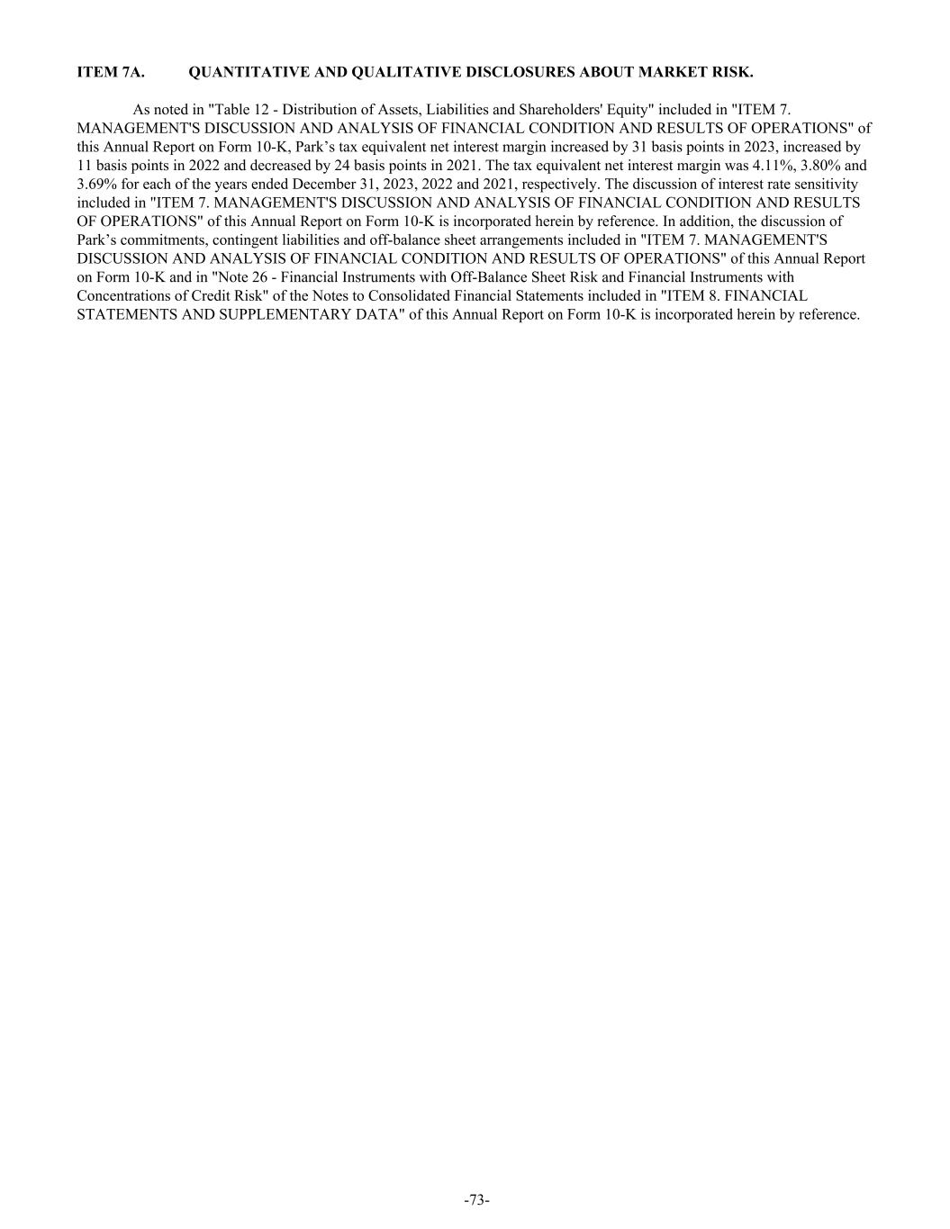 ITEM 7A. QUANTITATIVE AND QUALITATIVE DISCLOSURES ABOUT MARKET RISK. As noted in "Table 12 - Distribution of Assets, Liabilities and Shareholders' Equity" included in "ITEM 7. MANAGEMENT'S DISCUSSION AND ANALYSIS OF FINANCIAL CONDITION AND RESULTS OF OPERATIONS" of this Annual Report on Form 10-K, Park’s tax equivalent net interest margin increased by 31 basis points in 2023, increased by 11 basis points in 2022 and decreased by 24 basis points in 2021. The tax equivalent net interest margin was 4.11%, 3.80% and 3.69% for each of the years ended December 31, 2023, 2022 and 2021, respectively. The discussion of interest rate sensitivity included in "ITEM 7. MANAGEMENT'S DISCUSSION AND ANALYSIS OF FINANCIAL CONDITION AND RESULTS OF OPERATIONS" of this Annual Report on Form 10-K is incorporated herein by reference. In addition, the discussion of Park’s commitments, contingent liabilities and off-balance sheet arrangements included in "ITEM 7. MANAGEMENT'S DISCUSSION AND ANALYSIS OF FINANCIAL CONDITION AND RESULTS OF OPERATIONS" of this Annual Report on Form 10-K and in "Note 26 - Financial Instruments with Off-Balance Sheet Risk and Financial Instruments with Concentrations of Credit Risk" of the Notes to Consolidated Financial Statements included in "ITEM 8. FINANCIAL STATEMENTS AND SUPPLEMENTARY DATA" of this Annual Report on Form 10-K is incorporated herein by reference. -73-