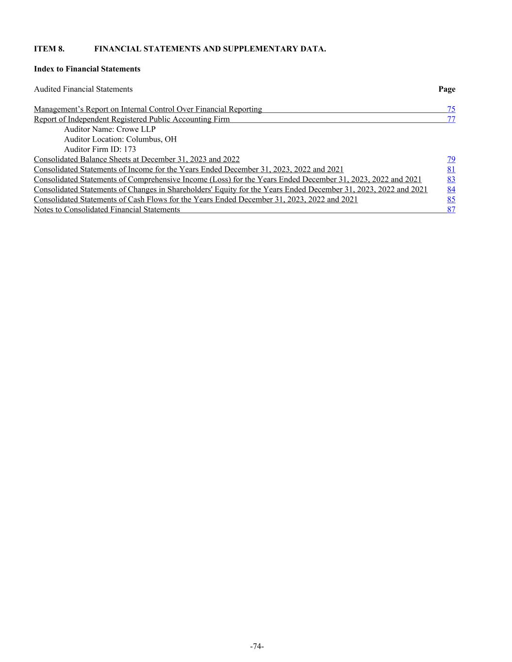 ITEM 8. FINANCIAL STATEMENTS AND SUPPLEMENTARY DATA. Index to Financial Statements Audited Financial Statements Page Management’s Report on Internal Control Over Financial Reporting 75 Report of Independent Registered Public Accounting Firm 77 Auditor Name: Crowe LLP Auditor Location: Columbus, OH Auditor Firm ID: 173 Consolidated Balance Sheets at December 31, 2023 and 2022 79 Consolidated Statements of Income for the Years Ended December 31, 2023, 2022 and 2021 81 Consolidated Statements of Comprehensive Income (Loss) for the Years Ended December 31, 2023, 2022 and 2021 83 Consolidated Statements of Changes in Shareholders' Equity for the Years Ended December 31, 2023, 2022 and 2021 84 Consolidated Statements of Cash Flows for the Years Ended December 31, 2023, 2022 and 2021 85 Notes to Consolidated Financial Statements 87 -74-