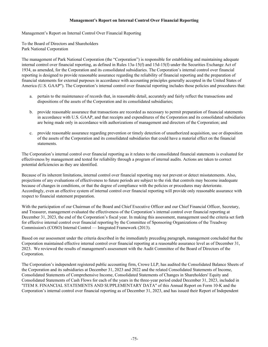 Management’s Report on Internal Control Over Financial Reporting Management’s Report on Internal Control Over Financial Reporting To the Board of Directors and Shareholders Park National Corporation The management of Park National Corporation (the “Corporation”) is responsible for establishing and maintaining adequate internal control over financial reporting, as defined in Rules 13a-15(f) and 15d-15(f) under the Securities Exchange Act of 1934, as amended, for the Corporation and its consolidated subsidiaries. The Corporation’s internal control over financial reporting is designed to provide reasonable assurance regarding the reliability of financial reporting and the preparation of financial statements for external purposes in accordance with accounting principles generally accepted in the United States of America (U.S. GAAP"). The Corporation’s internal control over financial reporting includes those policies and procedures that: a. pertain to the maintenance of records that, in reasonable detail, accurately and fairly reflect the transactions and dispositions of the assets of the Corporation and its consolidated subsidiaries; b. provide reasonable assurance that transactions are recorded as necessary to permit preparation of financial statements in accordance with U.S. GAAP, and that receipts and expenditures of the Corporation and its consolidated subsidiaries are being made only in accordance with authorizations of management and directors of the Corporation; and c. provide reasonable assurance regarding prevention or timely detection of unauthorized acquisition, use or disposition of the assets of the Corporation and its consolidated subsidiaries that could have a material effect on the financial statements. The Corporation’s internal control over financial reporting as it relates to the consolidated financial statements is evaluated for effectiveness by management and tested for reliability through a program of internal audits. Actions are taken to correct potential deficiencies as they are identified. Because of its inherent limitations, internal control over financial reporting may not prevent or detect misstatements. Also, projections of any evaluations of effectiveness to future periods are subject to the risk that controls may become inadequate because of changes in conditions, or that the degree of compliance with the policies or procedures may deteriorate. Accordingly, even an effective system of internal control over financial reporting will provide only reasonable assurance with respect to financial statement preparation. With the participation of our Chairman of the Board and Chief Executive Officer and our Chief Financial Officer, Secretary, and Treasurer, management evaluated the effectiveness of the Corporation’s internal control over financial reporting at December 31, 2023, the end of the Corporation’s fiscal year. In making this assessment, management used the criteria set forth for effective internal control over financial reporting by the Committee of Sponsoring Organizations of the Treadway Commission's (COSO) Internal Control — Integrated Framework (2013). Based on our assessment under the criteria described in the immediately preceding paragraph, management concluded that the Corporation maintained effective internal control over financial reporting at a reasonable assurance level as of December 31, 2023. We reviewed the results of management's assessment with the Audit Committee of the Board of Directors of the Corporation. The Corporation’s independent registered public accounting firm, Crowe LLP, has audited the Consolidated Balance Sheets of the Corporation and its subsidiaries at December 31, 2023 and 2022 and the related Consolidated Statements of Income, Consolidated Statements of Comprehensive Income, Consolidated Statements of Changes in Shareholders' Equity and Consolidated Statements of Cash Flows for each of the years in the three-year period ended December 31, 2023, included in "ITEM 8. FINANCIAL STATEMENTS AND SUPPLEMENTARY DATA" of this Annual Report on Form 10-K and the Corporation’s internal control over financial reporting as of December 31, 2023, and has issued their Report of Independent -75-