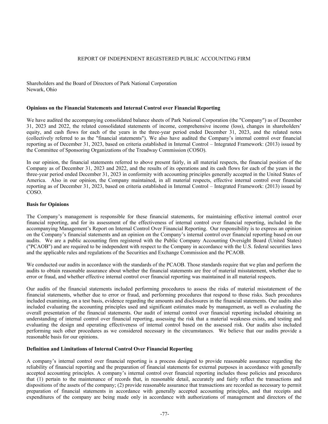 REPORT OF INDEPENDENT REGISTERED PUBLIC ACCOUNTING FIRM Shareholders and the Board of Directors of Park National Corporation Newark, Ohio Opinions on the Financial Statements and Internal Control over Financial Reporting We have audited the accompanying consolidated balance sheets of Park National Corporation (the "Company") as of December 31, 2023 and 2022, the related consolidated statements of income, comprehensive income (loss), changes in shareholders’ equity, and cash flows for each of the years in the three-year period ended December 31, 2023, and the related notes (collectively referred to as the "financial statements"). We also have audited the Company’s internal control over financial reporting as of December 31, 2023, based on criteria established in Internal Control – Integrated Framework: (2013) issued by the Committee of Sponsoring Organizations of the Treadway Commission (COSO). In our opinion, the financial statements referred to above present fairly, in all material respects, the financial position of the Company as of December 31, 2023 and 2022, and the results of its operations and its cash flows for each of the years in the three-year period ended December 31, 2023 in conformity with accounting principles generally accepted in the United States of America. Also in our opinion, the Company maintained, in all material respects, effective internal control over financial reporting as of December 31, 2023, based on criteria established in Internal Control – Integrated Framework: (2013) issued by COSO. Basis for Opinions The Company’s management is responsible for these financial statements, for maintaining effective internal control over financial reporting, and for its assessment of the effectiveness of internal control over financial reporting, included in the accompanying Management’s Report on Internal Control Over Financial Reporting. Our responsibility is to express an opinion on the Company’s financial statements and an opinion on the Company’s internal control over financial reporting based on our audits. We are a public accounting firm registered with the Public Company Accounting Oversight Board (United States) ("PCAOB") and are required to be independent with respect to the Company in accordance with the U.S. federal securities laws and the applicable rules and regulations of the Securities and Exchange Commission and the PCAOB. We conducted our audits in accordance with the standards of the PCAOB. Those standards require that we plan and perform the audits to obtain reasonable assurance about whether the financial statements are free of material misstatement, whether due to error or fraud, and whether effective internal control over financial reporting was maintained in all material respects. Our audits of the financial statements included performing procedures to assess the risks of material misstatement of the financial statements, whether due to error or fraud, and performing procedures that respond to those risks. Such procedures included examining, on a test basis, evidence regarding the amounts and disclosures in the financial statements. Our audits also included evaluating the accounting principles used and significant estimates made by management, as well as evaluating the overall presentation of the financial statements. Our audit of internal control over financial reporting included obtaining an understanding of internal control over financial reporting, assessing the risk that a material weakness exists, and testing and evaluating the design and operating effectiveness of internal control based on the assessed risk. Our audits also included performing such other procedures as we considered necessary in the circumstances. We believe that our audits provide a reasonable basis for our opinions. Definition and Limitations of Internal Control Over Financial Reporting A company’s internal control over financial reporting is a process designed to provide reasonable assurance regarding the reliability of financial reporting and the preparation of financial statements for external purposes in accordance with generally accepted accounting principles. A company’s internal control over financial reporting includes those policies and procedures that (1) pertain to the maintenance of records that, in reasonable detail, accurately and fairly reflect the transactions and dispositions of the assets of the company; (2) provide reasonable assurance that transactions are recorded as necessary to permit preparation of financial statements in accordance with generally accepted accounting principles, and that receipts and expenditures of the company are being made only in accordance with authorizations of management and directors of the -77-