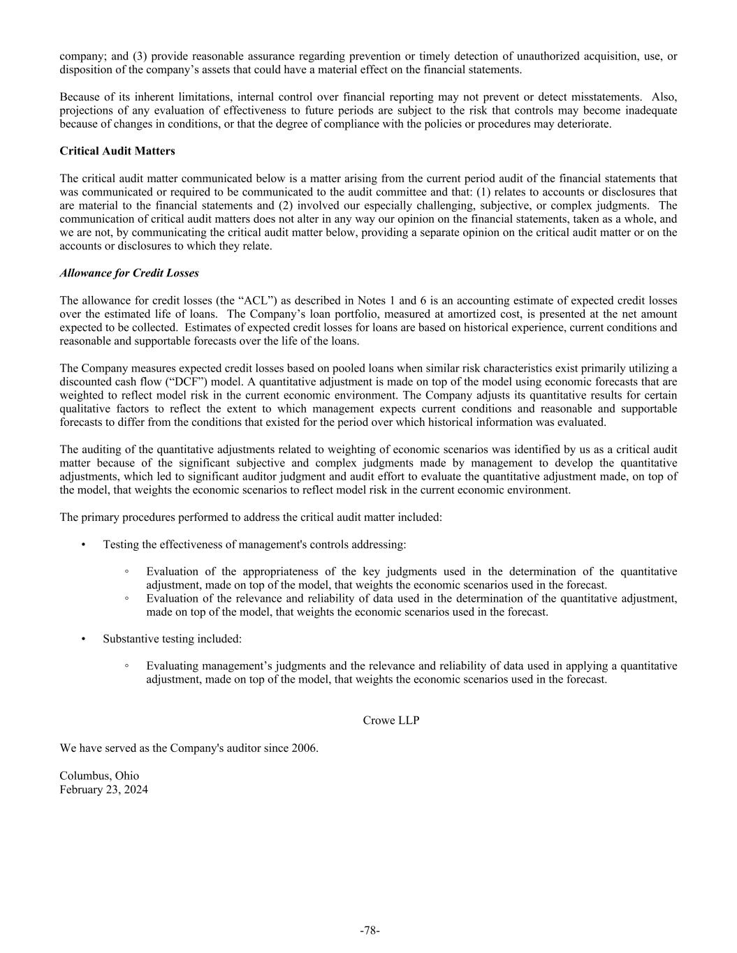 company; and (3) provide reasonable assurance regarding prevention or timely detection of unauthorized acquisition, use, or disposition of the company’s assets that could have a material effect on the financial statements. Because of its inherent limitations, internal control over financial reporting may not prevent or detect misstatements. Also, projections of any evaluation of effectiveness to future periods are subject to the risk that controls may become inadequate because of changes in conditions, or that the degree of compliance with the policies or procedures may deteriorate. Critical Audit Matters The critical audit matter communicated below is a matter arising from the current period audit of the financial statements that was communicated or required to be communicated to the audit committee and that: (1) relates to accounts or disclosures that are material to the financial statements and (2) involved our especially challenging, subjective, or complex judgments. The communication of critical audit matters does not alter in any way our opinion on the financial statements, taken as a whole, and we are not, by communicating the critical audit matter below, providing a separate opinion on the critical audit matter or on the accounts or disclosures to which they relate. Allowance for Credit Losses The allowance for credit losses (the “ACL”) as described in Notes 1 and 6 is an accounting estimate of expected credit losses over the estimated life of loans. The Company’s loan portfolio, measured at amortized cost, is presented at the net amount expected to be collected. Estimates of expected credit losses for loans are based on historical experience, current conditions and reasonable and supportable forecasts over the life of the loans. The Company measures expected credit losses based on pooled loans when similar risk characteristics exist primarily utilizing a discounted cash flow (“DCF”) model. A quantitative adjustment is made on top of the model using economic forecasts that are weighted to reflect model risk in the current economic environment. The Company adjusts its quantitative results for certain qualitative factors to reflect the extent to which management expects current conditions and reasonable and supportable forecasts to differ from the conditions that existed for the period over which historical information was evaluated. The auditing of the quantitative adjustments related to weighting of economic scenarios was identified by us as a critical audit matter because of the significant subjective and complex judgments made by management to develop the quantitative adjustments, which led to significant auditor judgment and audit effort to evaluate the quantitative adjustment made, on top of the model, that weights the economic scenarios to reflect model risk in the current economic environment. The primary procedures performed to address the critical audit matter included: • Testing the effectiveness of management's controls addressing: ◦ Evaluation of the appropriateness of the key judgments used in the determination of the quantitative adjustment, made on top of the model, that weights the economic scenarios used in the forecast. ◦ Evaluation of the relevance and reliability of data used in the determination of the quantitative adjustment, made on top of the model, that weights the economic scenarios used in the forecast. • Substantive testing included: ◦ Evaluating management’s judgments and the relevance and reliability of data used in applying a quantitative adjustment, made on top of the model, that weights the economic scenarios used in the forecast. Crowe LLP We have served as the Company's auditor since 2006. Columbus, Ohio February 23, 2024 -78-