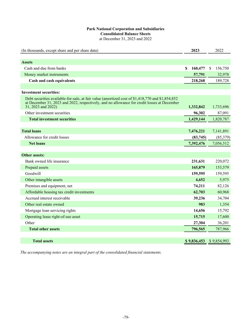 Park National Corporation and Subsidiaries Consolidated Balance Sheets at December 31, 2023 and 2022 (In thousands, except share and per share data) 2023 2022 Assets Cash and due from banks $ 160,477 $ 156,750 Money market instruments 57,791 32,978 Cash and cash equivalents 218,268 189,728 Investment securities: Debt securities available-for-sale, at fair value (amortized cost of $1,418,770 and $1,854,852 at December 31, 2023 and 2022, respectively, and no allowance for credit losses at December 31, 2023 and 2022) 1,332,842 1,733,696 Other investment securities 96,302 87,091 Total investment securities 1,429,144 1,820,787 Total loans 7,476,221 7,141,891 Allowance for credit losses (83,745) (85,379) Net loans 7,392,476 7,056,512 Other assets: Bank owned life insurance 231,631 220,072 Prepaid assets 165,879 153,579 Goodwill 159,595 159,595 Other intangible assets 4,652 5,975 Premises and equipment, net 74,211 82,126 Affordable housing tax credit investments 62,703 60,968 Accrued interest receivable 39,236 34,704 Other real estate owned 983 1,354 Mortgage loan servicing rights 14,656 15,792 Operating lease right-of-use asset 15,715 17,600 Other 27,304 36,201 Total other assets 796,565 787,966 Total assets $ 9,836,453 $ 9,854,993 The accompanying notes are an integral part of the consolidated financial statements. -79-
